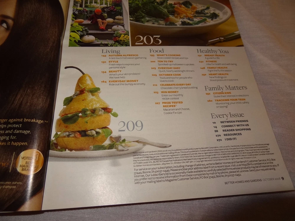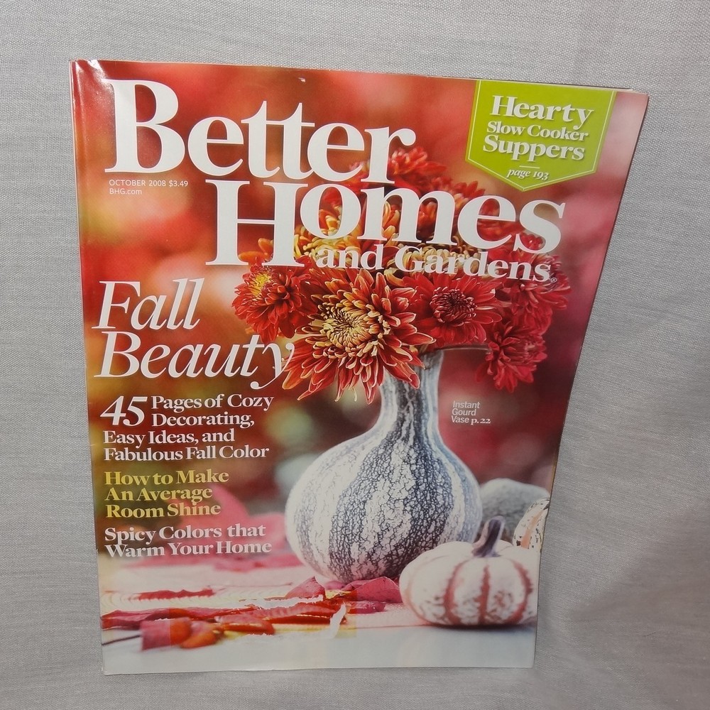 Fall Beauty Brand: Better Homes and Gardens Item: Magazine Theme : 45 pages of cozy decorating, easy ideas, and fabulous fall color How to make an average room shine Spicy colors that warm your home Instant gourd vase Year: October 2008 Condition: Wear to both covers, edges and spine. Label damage to the front cover. Cash payment, if local pick up. International Shipping - Buyer pays full shipping charges, tariffs, duties, fees, etc...