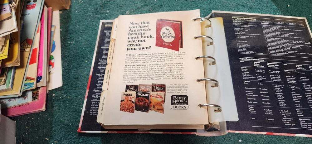 BETTER HOMES AND GARDENS NEW COOKBOOK Cookbook housed in 5 ring binder hardcover Sections in cook book are tabbed. Title page is missing, but the rest of cookbook is complete. Cookbook in pretty good condition for its age.