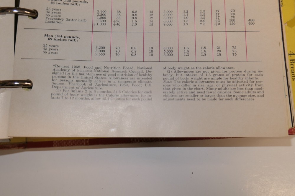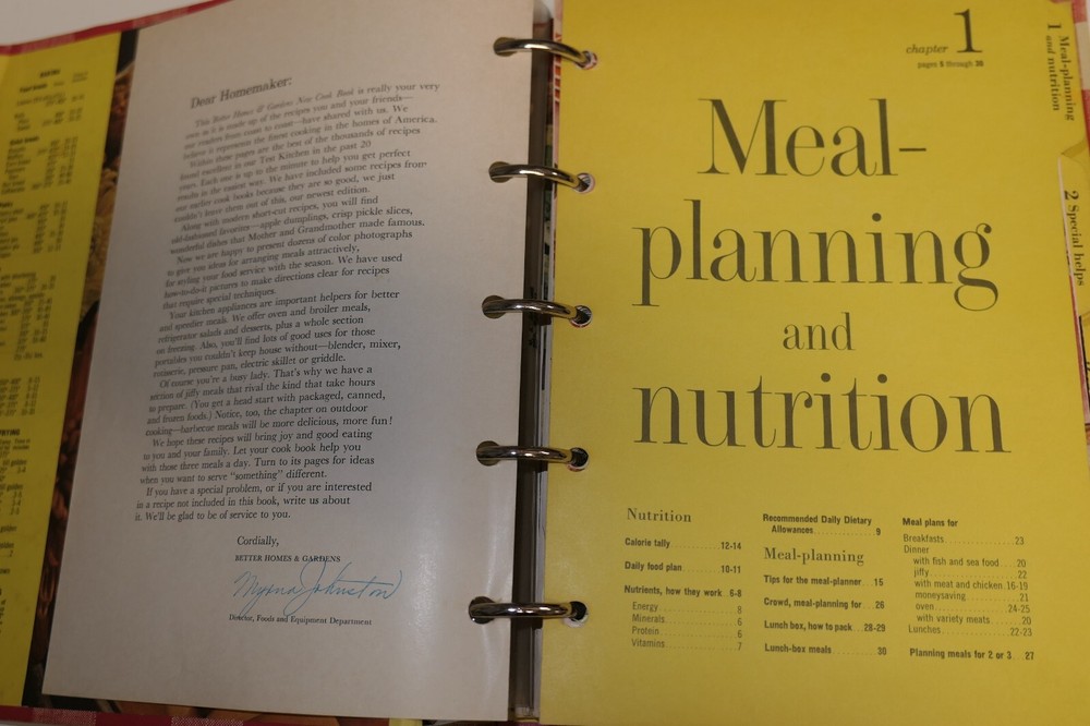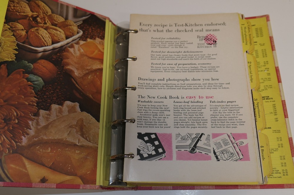 Better Homes and Gardens New Cook Book Early Edition Ring Bound Hardcover Hardcover with no dust jacket in good condition. Last index page has pulled loose and holes have been repaired with tape.. Not sure where the copyright date is on this, but the Daily Dietary Allowances has a revised 1958 update.