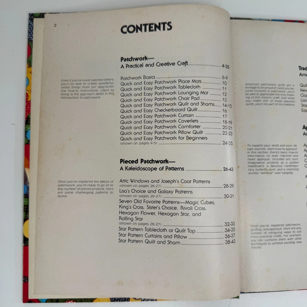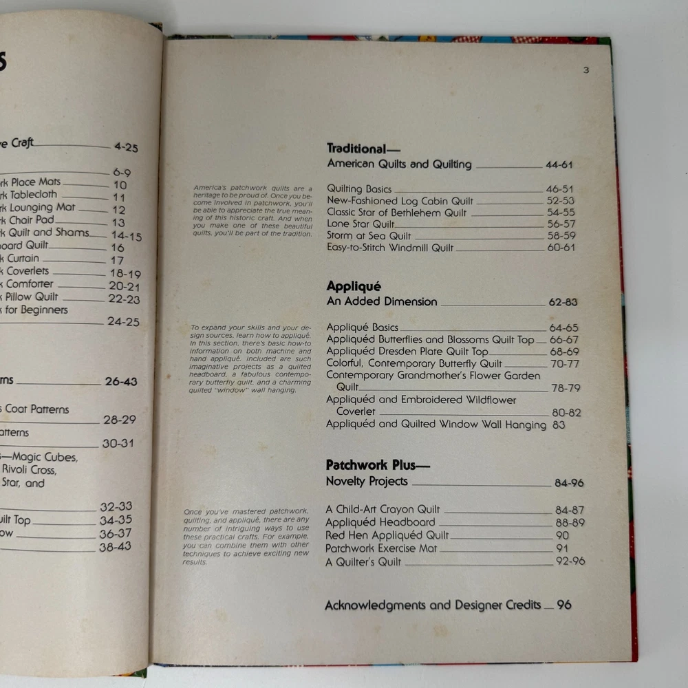 This book has exciting quick and easy projects: Quilting, patchwork, Applique Basics, Heirloom and Contemporary designs. Over all good used condition.