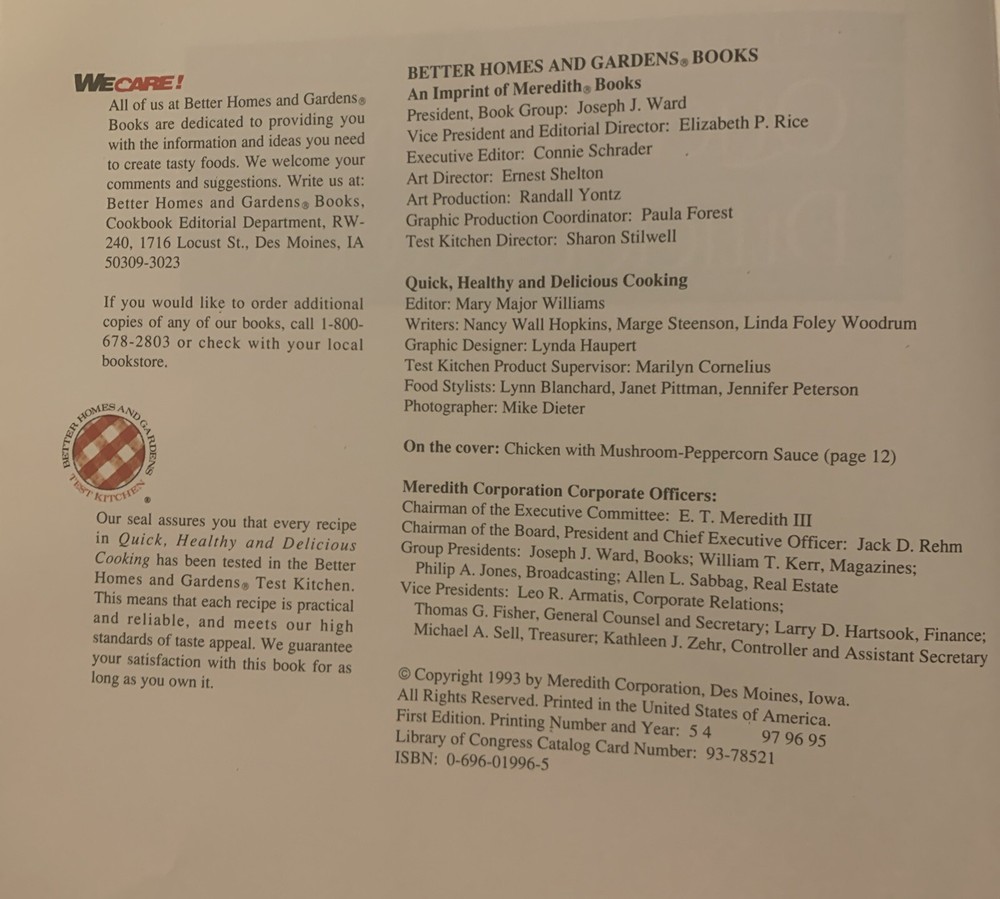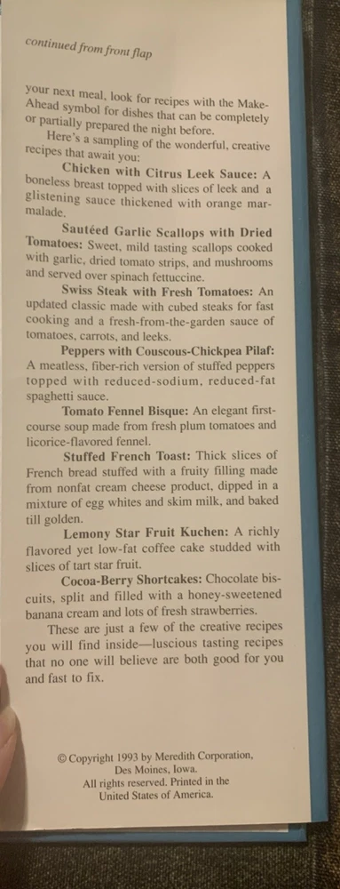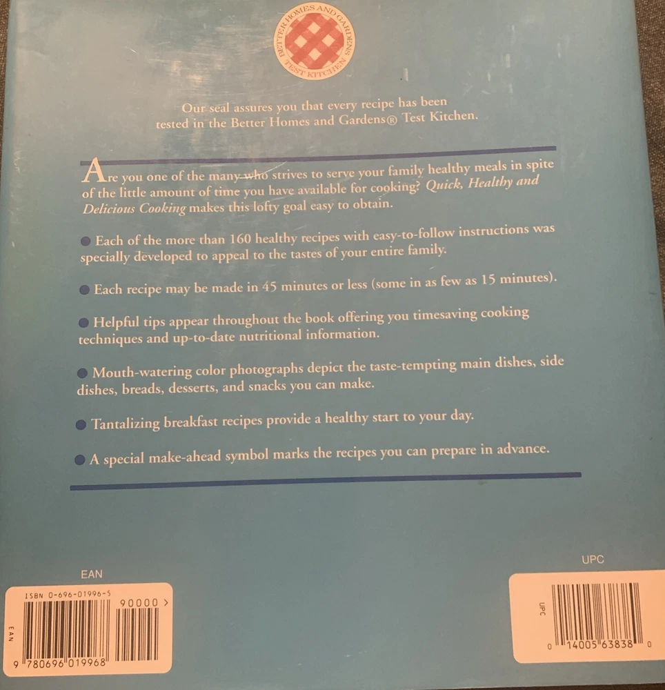 This listing is for a 1993 cookbook that was put out by better homes and garden s. , quick, healthy and delicious cooking. This cookbook is 240 pages long. It is a hardback cookbook . This book has 60 enticing color photographs, showing simple serving suggestions, and accompaniments. These cookbooks were sold for 1995 and they were to be price higher in Canada . Be sure to message me with any questions and thanks for visiting my store.