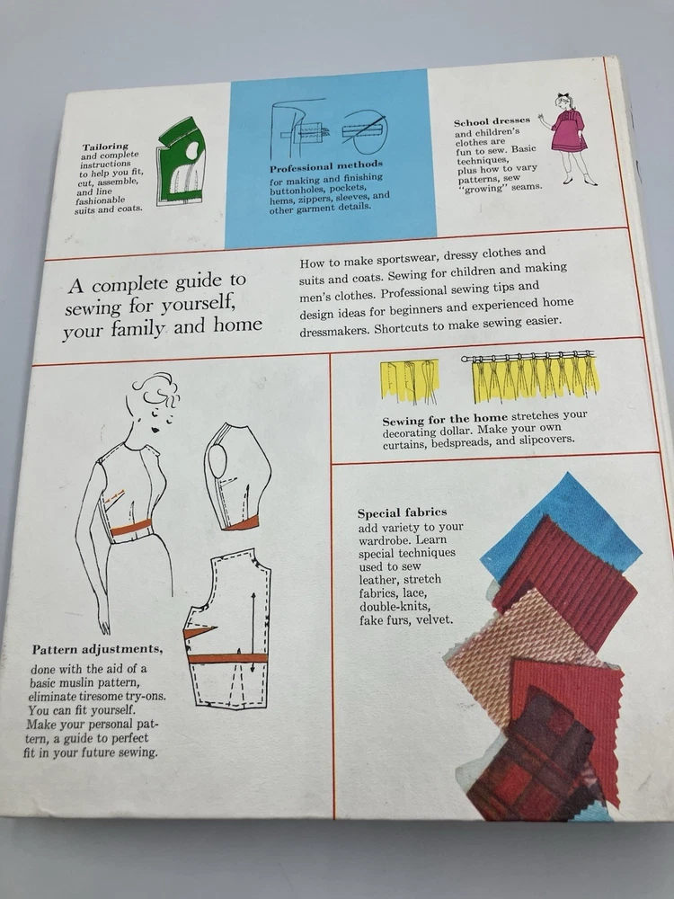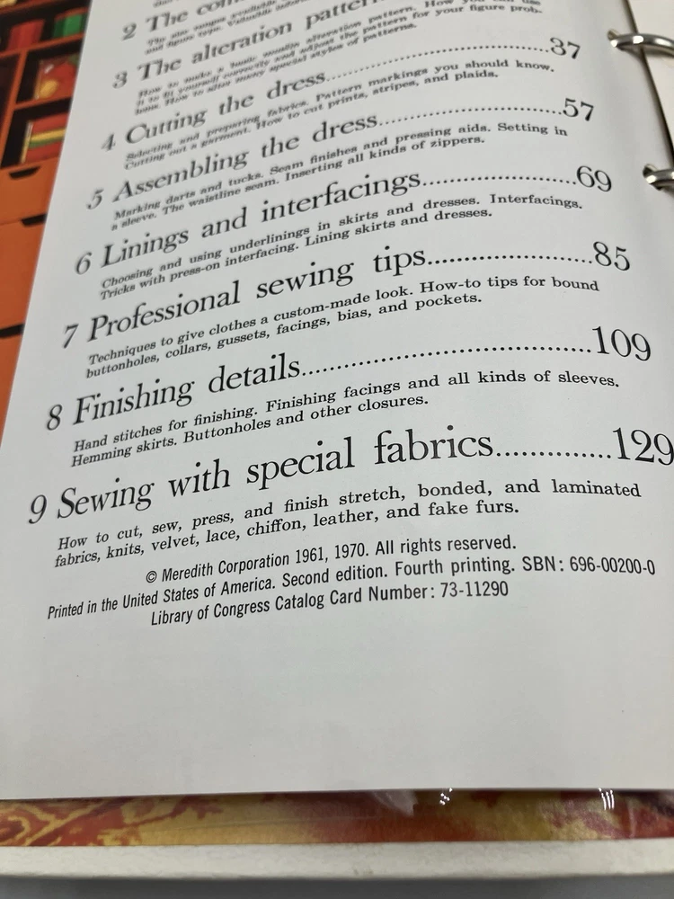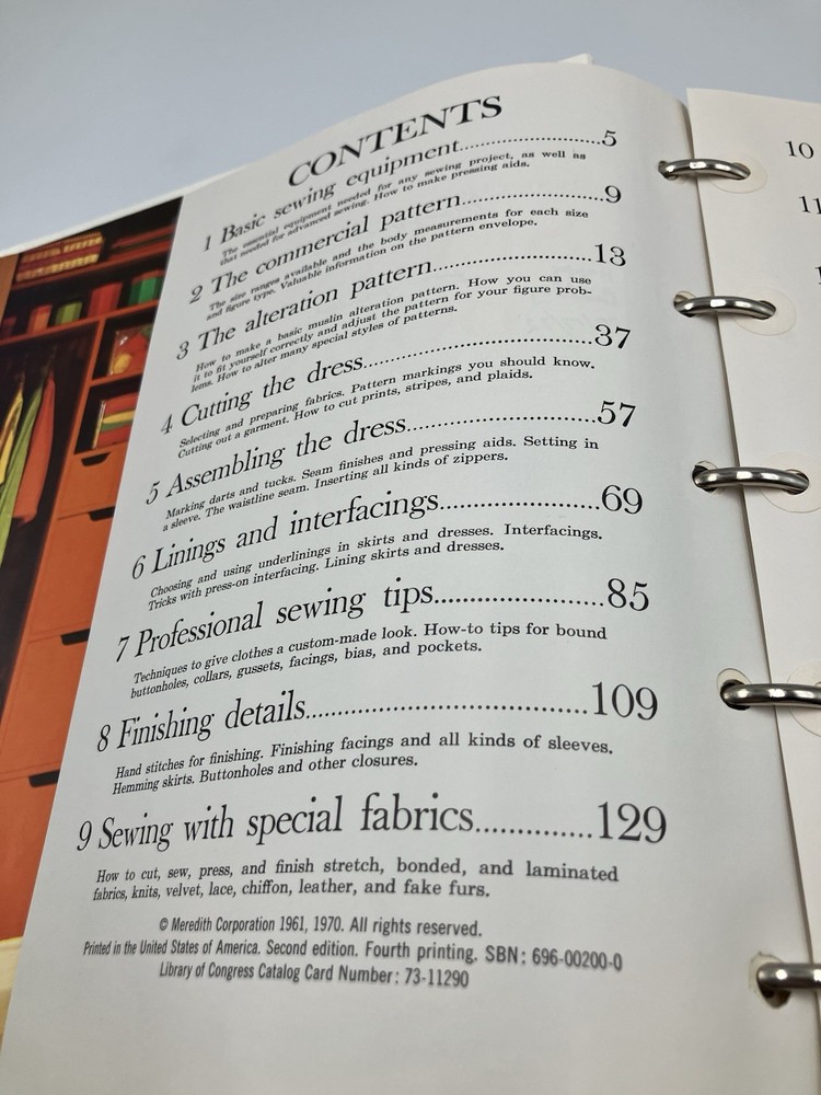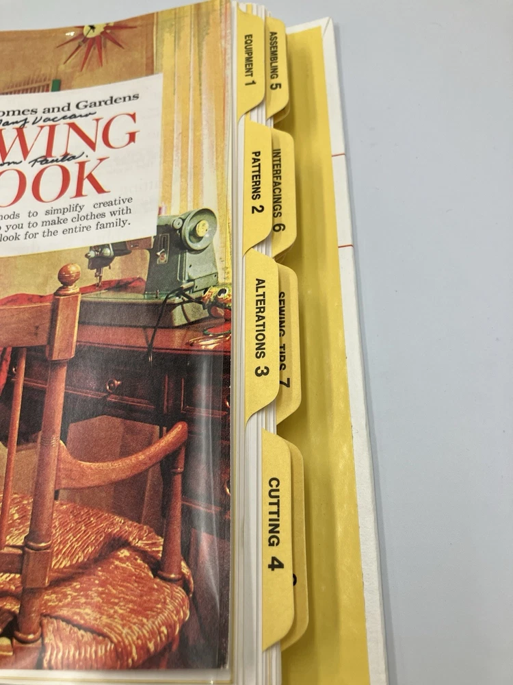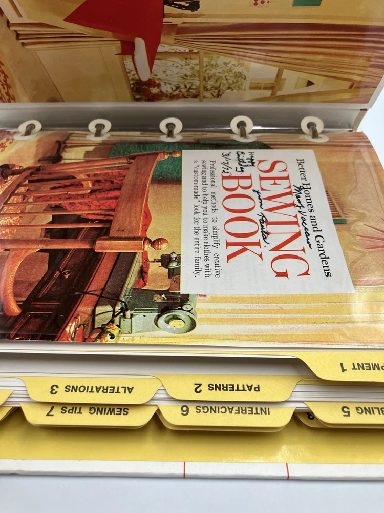 Title: Better Homes and Gardens Sewing Book Condition: Very Good Details: This 5-ring bound hardcover is the 4th printing of the 2nd edition from 1970 and has complete pages with no writing save for a name and date written on the title page. The tabs are clean as are the well preserved pastedowns. The minimal shelf wear and bumping to the covers is shown in the pictures with the pointer at the headcap and tailcap and small areas of cover boards Please see pictures, read descriptions or ask questions before buying