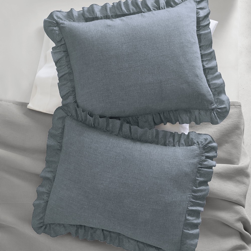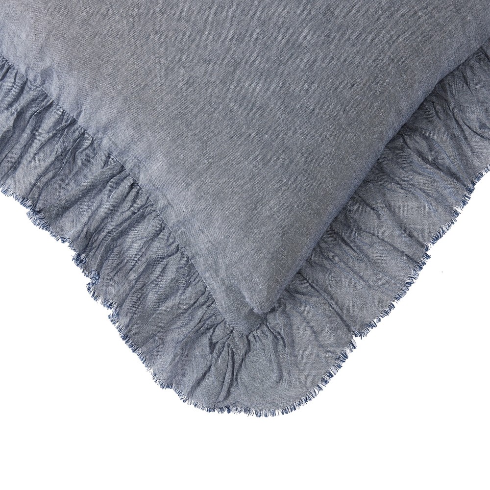 Add a playful touch to your bed with this set of two standard pillowcases with chambray ruffles. Add a playful touch to your master bedroom, guest room, or dorm room with this pillowcase set, featuring blue chambray with 2.5" ruffles around the edges. Set includes two standard sized pillowcases, each measuring 20" x 28". Each pillowcase is made from 100% cotton and pre-washed for extra softness and comfort. This pillowcase set is machine washable - machine wash on cold and tumble dry on low to keep your pillowcases looking and feeling fresh. Set of Two Standard Pillowcases Features blue chambray with ruffles Fits standard pillows - 20" x 28" with 2.5" edges Made from 100% cotton - pre-washed for extra softness Machine wash for quick and easy removal
