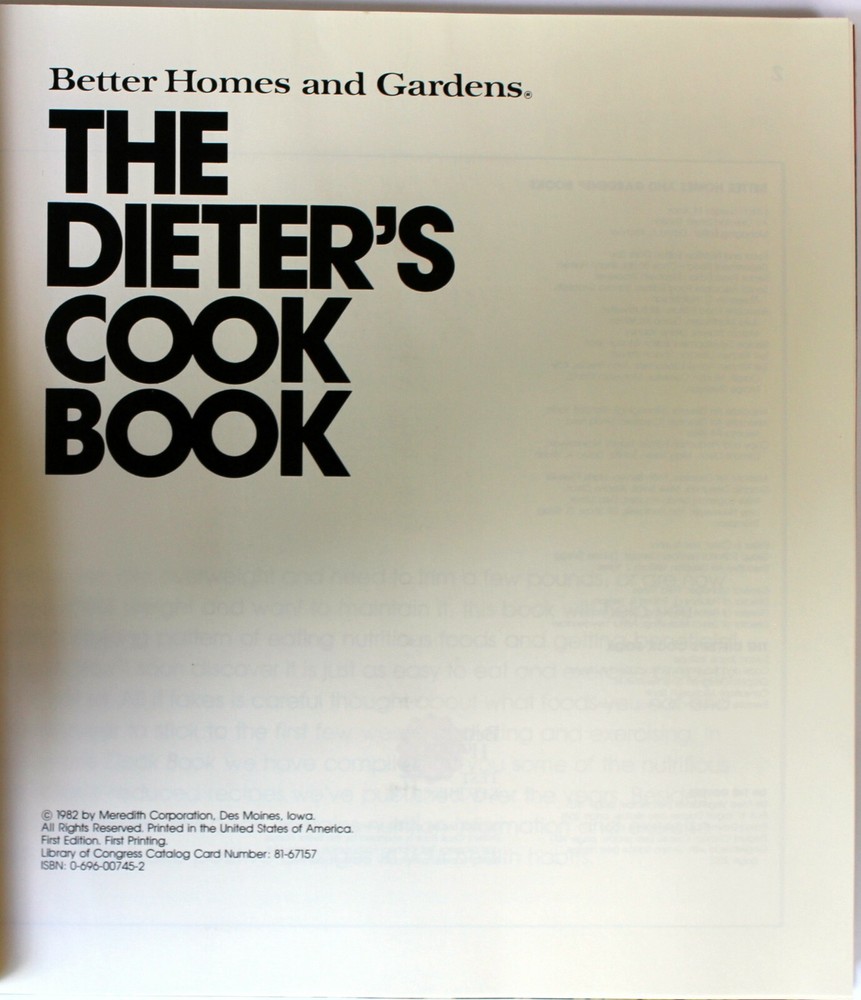 Better Homes and Gardens Books: The Dieter's Cook Book by Better Homes and Gardens Editors 1982 Hardcover Very Good condition. The covers and pages are clean with no writing, marks, stains, etc. Please see the included photos for close-up condition of the book. All images are photos or scans of the exact item you will receive. No stock or re-used photos. Please review images and condition notes, and feel free to ask any questions you may have. The item will be securely packaged to assure safe arrival. I am always happy to combine shipping whenever possible. Thank you for your interest!
