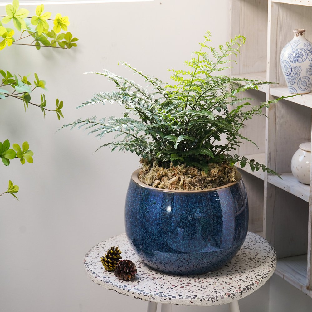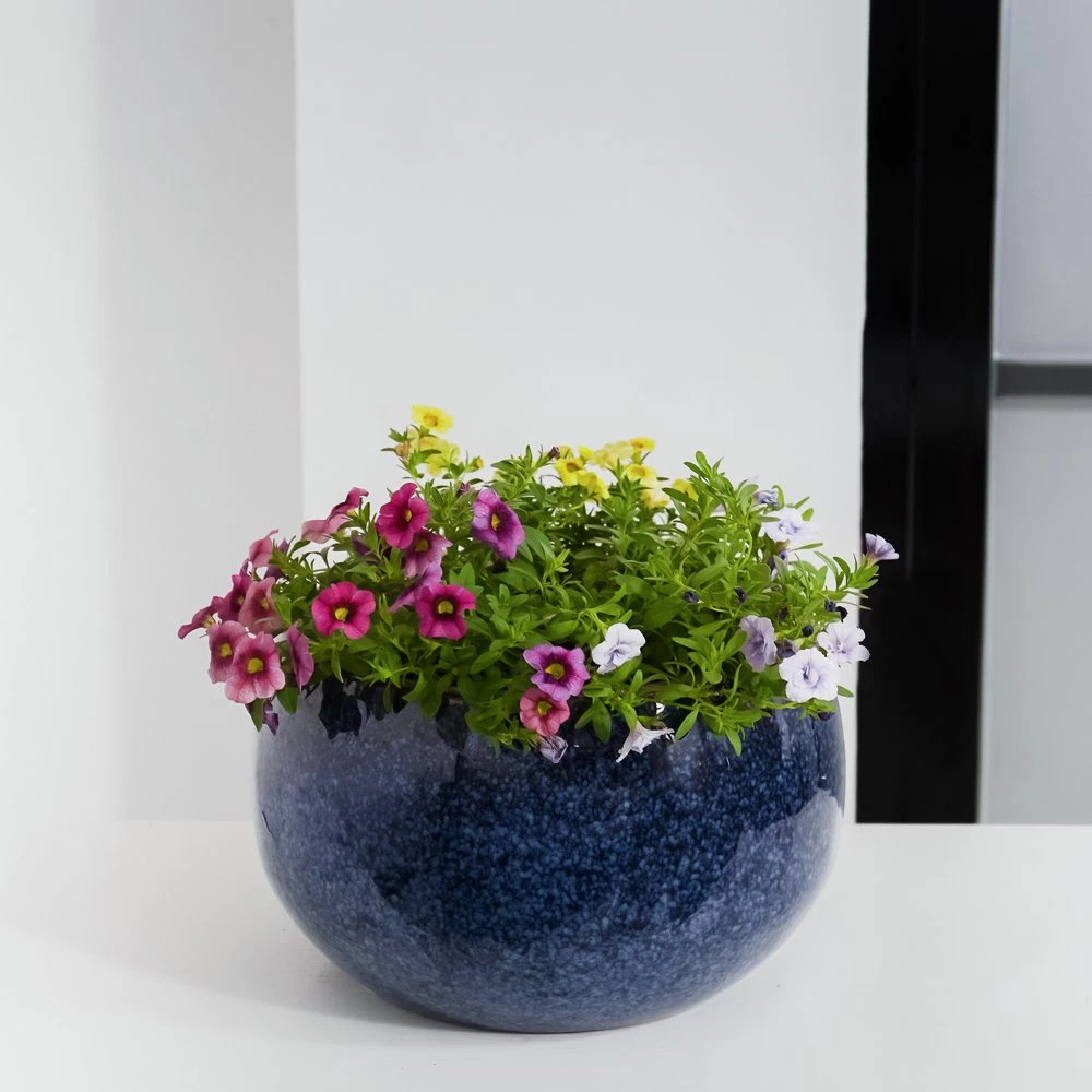 Round planter with a hole with a removable plug at the bottom Ceramic is highlighted with a stunning teal reactive finish Weather-resistant design for use indoors or out Perfect for displaying flowering plants, ferns, succulents, and more Add a plant and share as a housewarming, hostess, or birthday gift Capacity: Holds plants up to 2-2.5 Gal. Product dimensions: Dia.12 x 7.45" H Product weight: 10 lbs. Color: Teal Material: Ceramic Model # BHS169523974021 Imported Better Homes & Gardens Toramina 12in Round Planter gives any large-size plant the showcase it deserves. The modern-shaped planter is bathed in a teal reactive finish. Teal glazing have an artistic, one-of-a-kind feel. Perfect for indoor or outdoor use, the pot includes a convenient plug so you can nurture plants without water seeping out and ruining surfaces. Available in two-tone all-weather glazes, Better Homes & Gardens Toramina 12in Round Planter is a natural addition to your modern indoor or outdoor seating, dining, or living rooms.