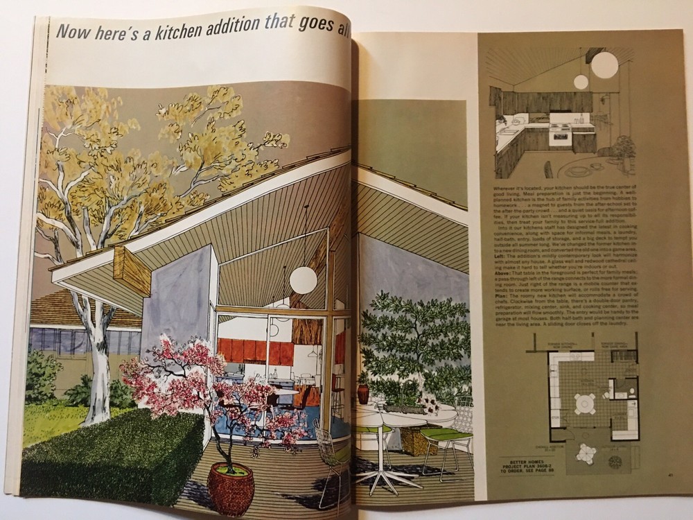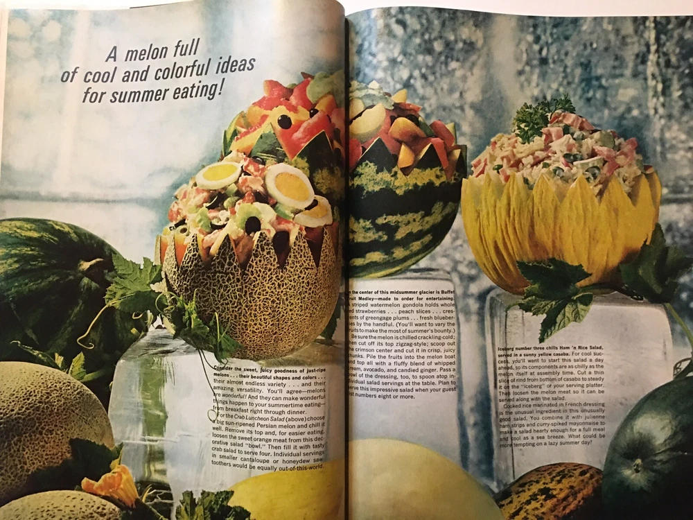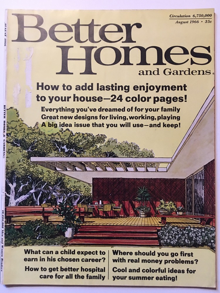 Better Homes and Gardens magazine August 1966 Overall House design illustrated melon preparation ideas for summer good condition, flattened binding, torn paper from mailing label on cover, small tear ...