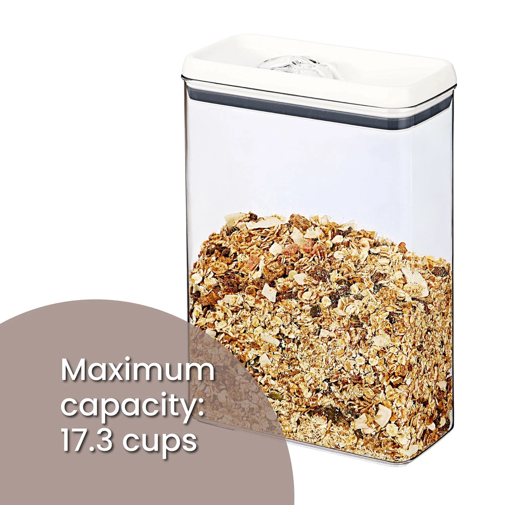 Keep your dry goods fresh with this Better Homes & Gardens Flip-Tite® Food Storage Containers. It is a handy item to have in your kitchen or pantry. These food storage containers are ideal for storing dry foods such as pasta, dried beans, and candies. It's made without Bisphenol A (BPA) to ensure the safety of your food. A clear storage container makes it easy to identify the stored contents at a glance without having to label each canister. It features an easy-to-open flip buckle lid with a food-grade safe seal and is made of durable construction. This container holds up to 17.3 cups of dry foods. Always wash before first use and remove the seal from the lid before wash. Allow all components to dry thoroughly before next use. The container and lid are dishwasher safe, the silicone seal is hand washed. Not Microwave safe. Do not carry Flip-Tite® Container by the lid. On May 24, 2025 at 00:02:34 PDT, seller added the following information: