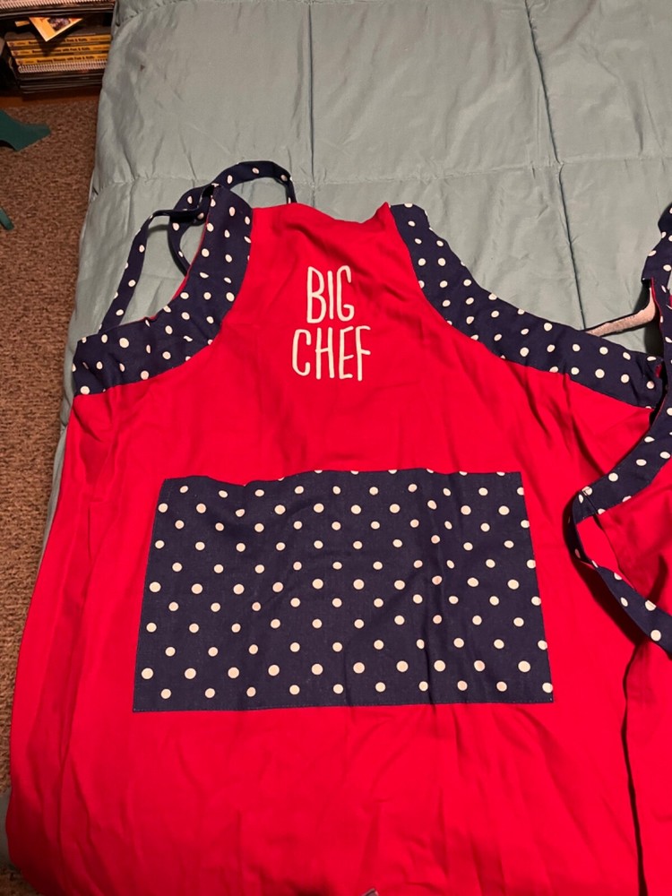 The "Big Chef & Little Chef" apron set includes one red apron for adults and one red, white, and blue apron for kids. Made of waterproof and durable canvas material, both aprons are 100% cotton. Suitable for both men and women, as well as kids, this Mainstays apron set is perfect for cooking and baking together in the kitchen.