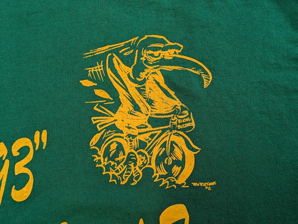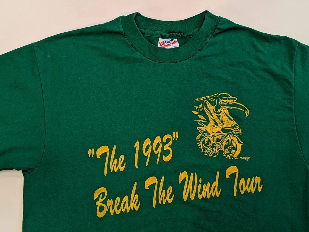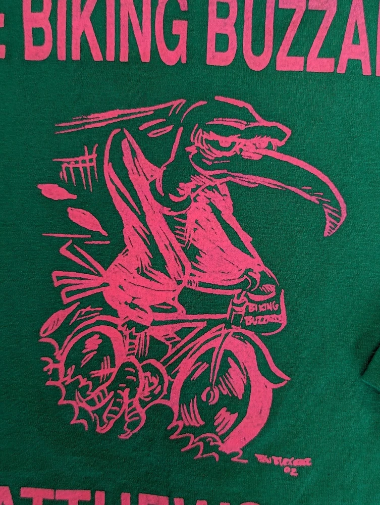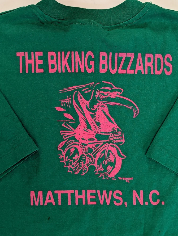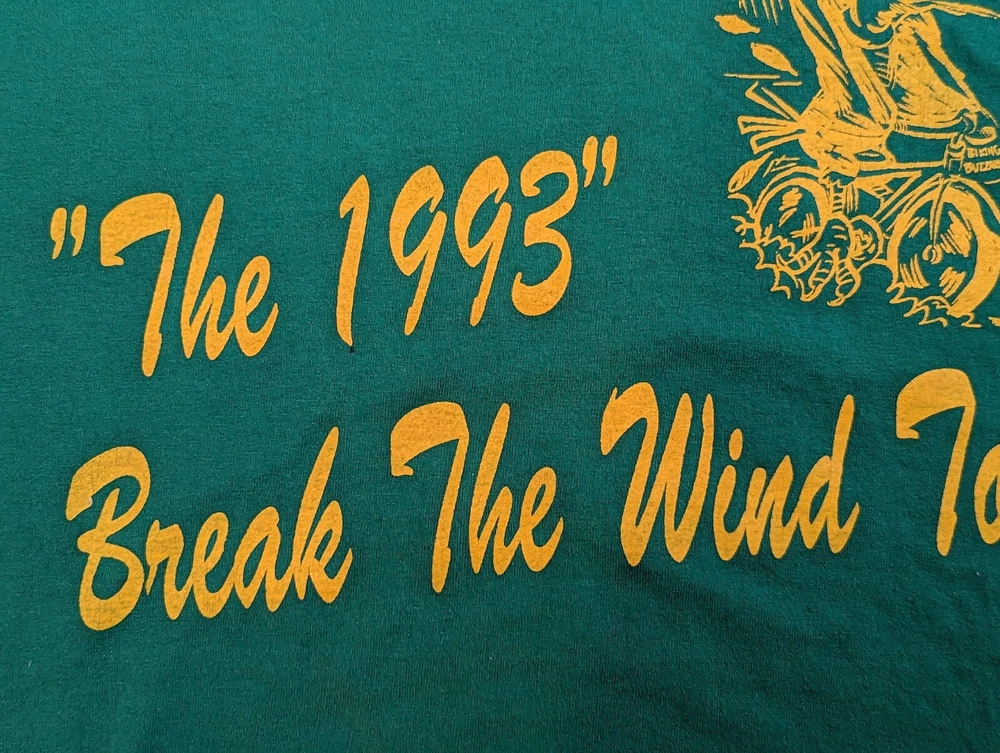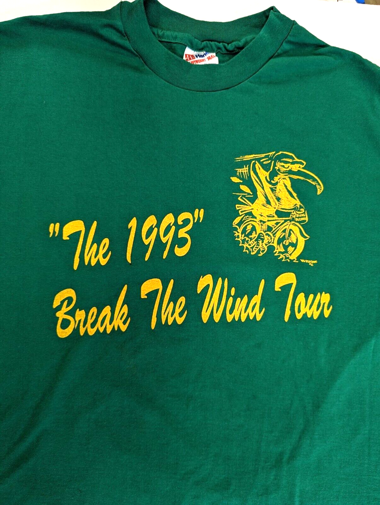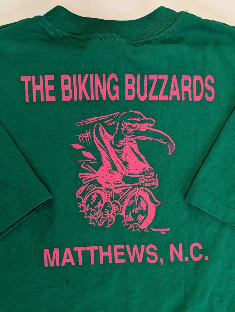 Biking Buzzard Bicycle Club 1993 "Break the Wind" Tour T-shirt Matthews NC Large. This shirt was custom designed and printed for members of a Matthews, NC bike club who were riding in a 1993 fundraising bike ride for MS. Shirt is by Hanes in a 50-50 blend of cotton poly, so it will hold it shape well over multiple washings, wicks moisture, and is soft and comfortable. Shirt is rich green with yellow graphic on front featuring a buzzard riding a bicycle and pink graphic on back. Measurements (with shirt lying flat with no strain on seams or fabric) Length from shoulder seam to hem edge=29" Sleeve length=8" Armpit to armpit=20.5 Total chest=41"