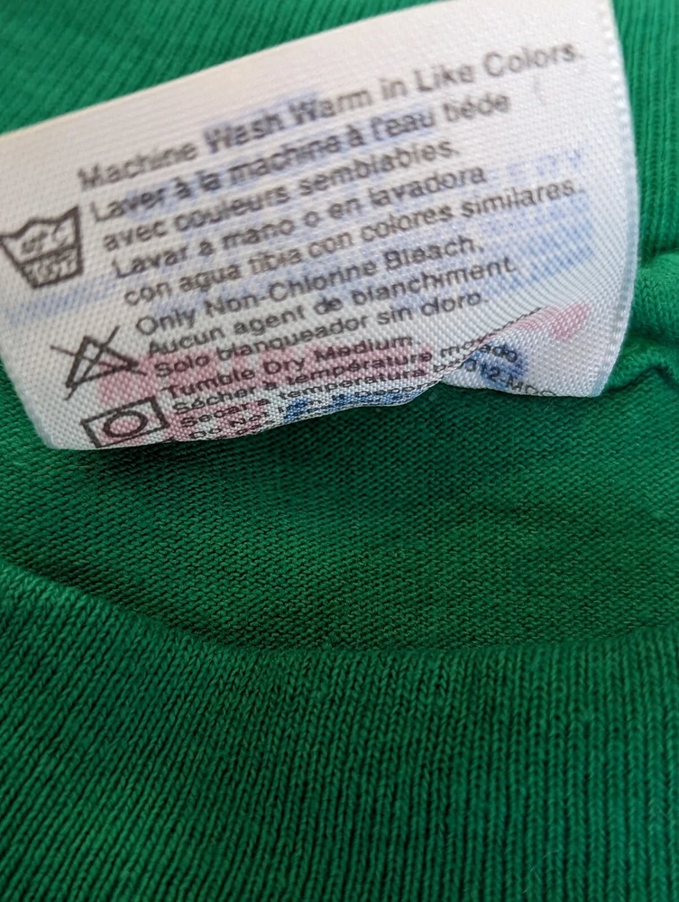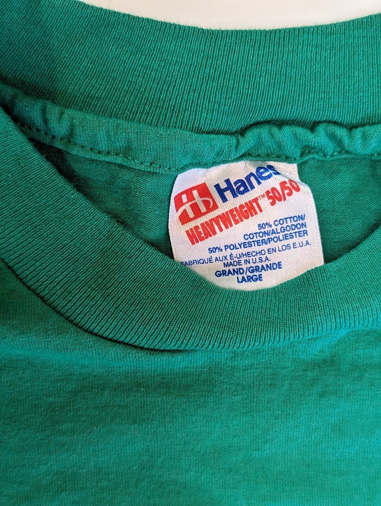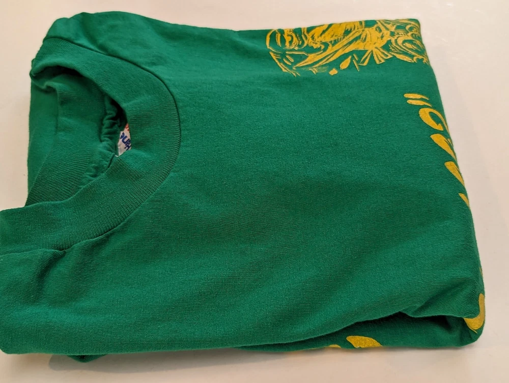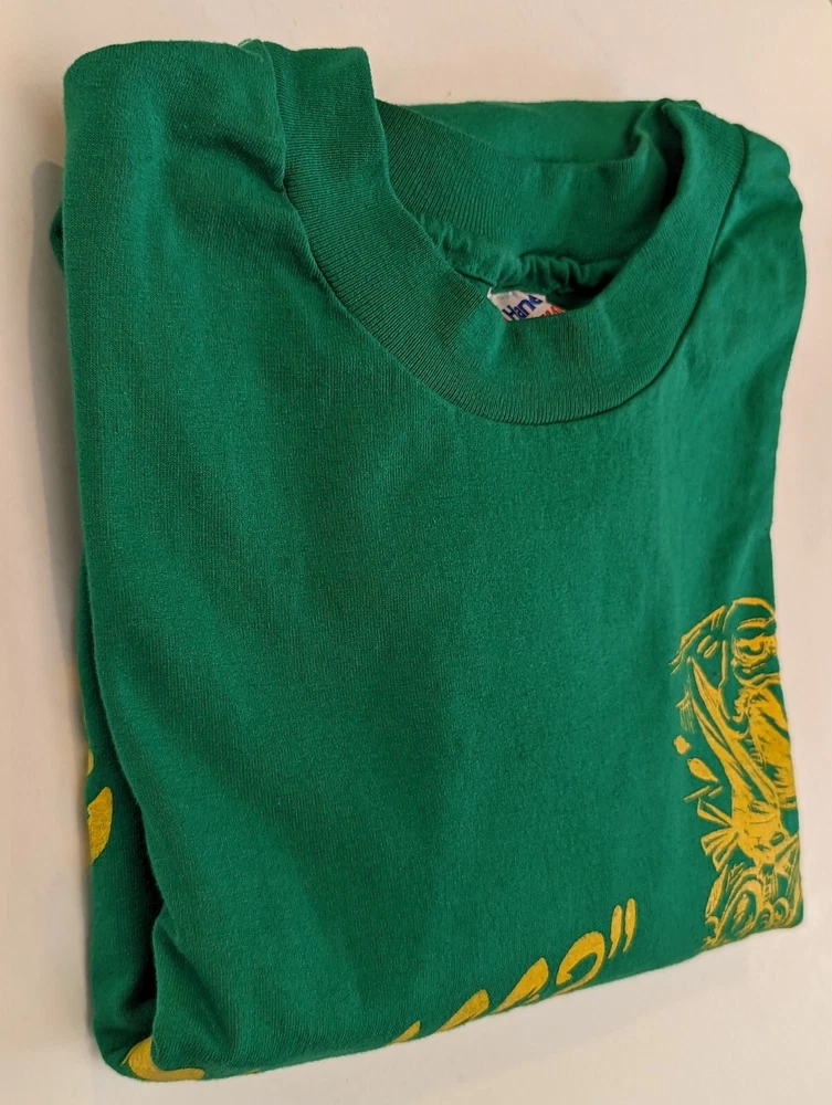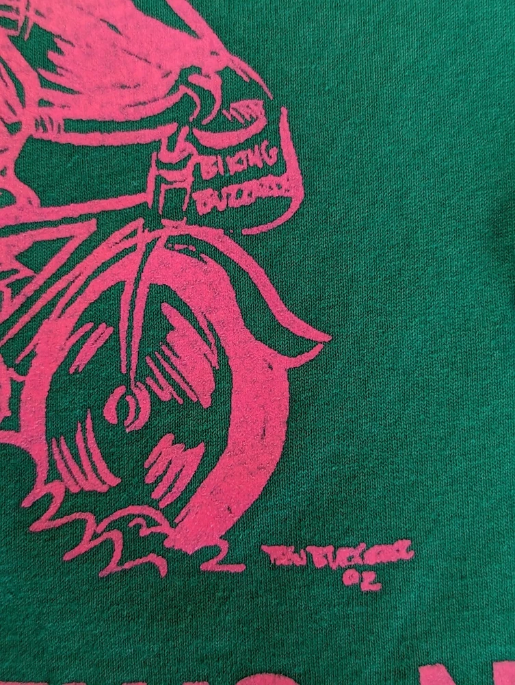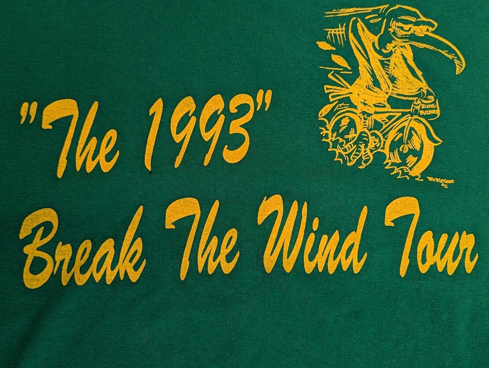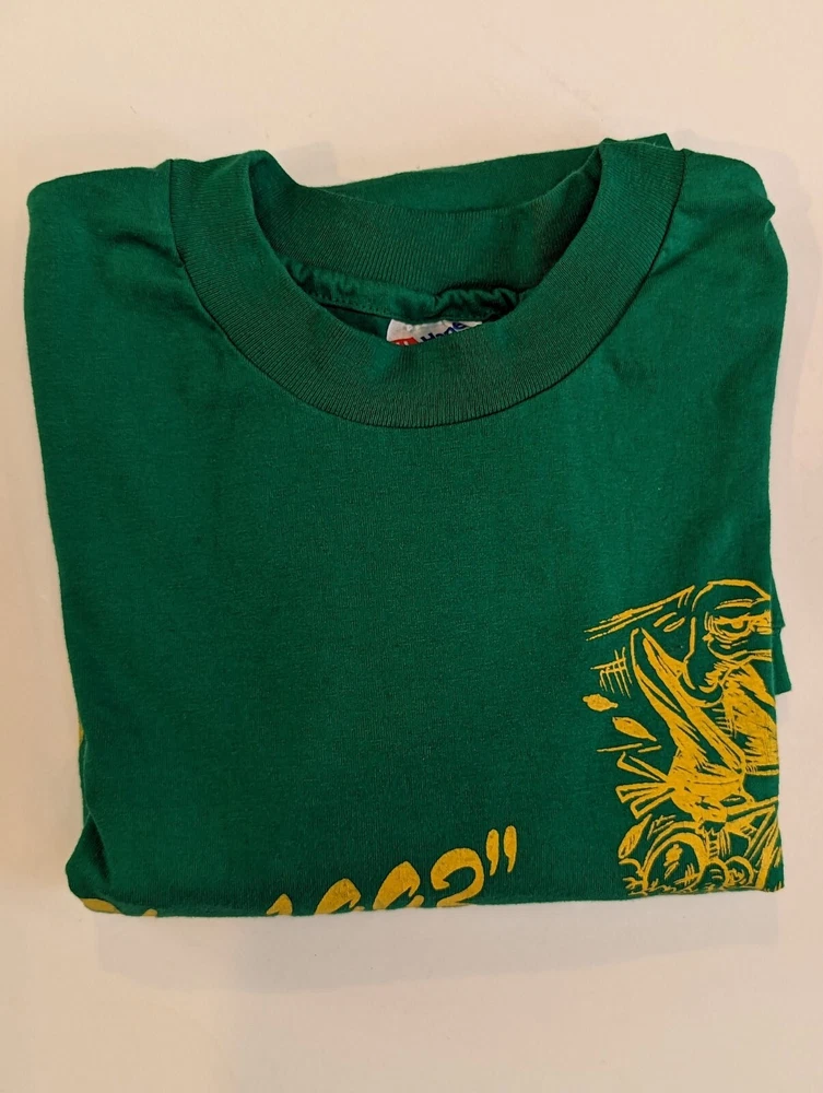 Biking Buzzard Bicycle Club 1993 "Break the Wind" Tour T-shirt Matthews NC Large. This shirt was custom designed and printed for members of a Matthews, NC bike club who were riding in a 1993 fundraising bike ride for MS. Shirt is by Hanes in a 50-50 blend of cotton poly, so it will hold it shape well over multiple washings, wicks moisture, and is soft and comfortable. Shirt is rich green with yellow graphic on front featuring a buzzard riding a bicycle and pink graphic on back. Measurements (with shirt lying flat with no strain on seams or fabric) Length from shoulder seam to hem edge=29" Sleeve length=8" Armpit to armpit=20.5 Total chest=41"