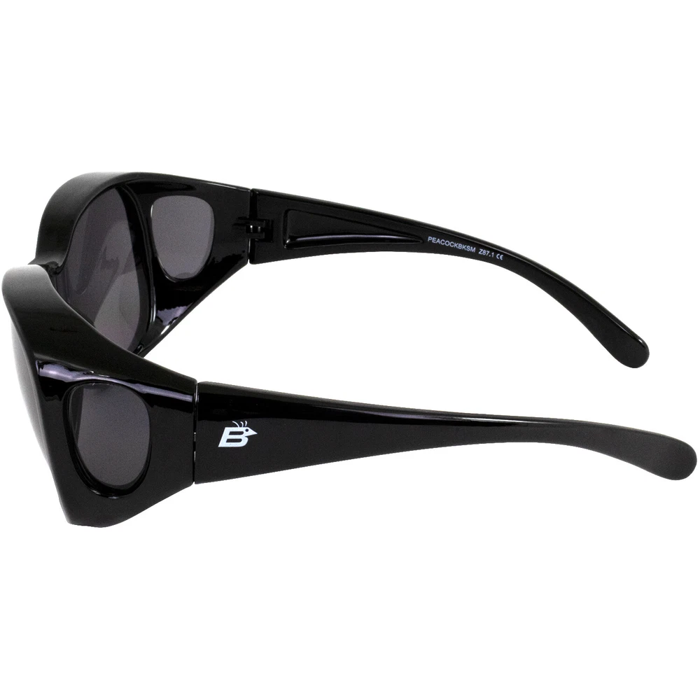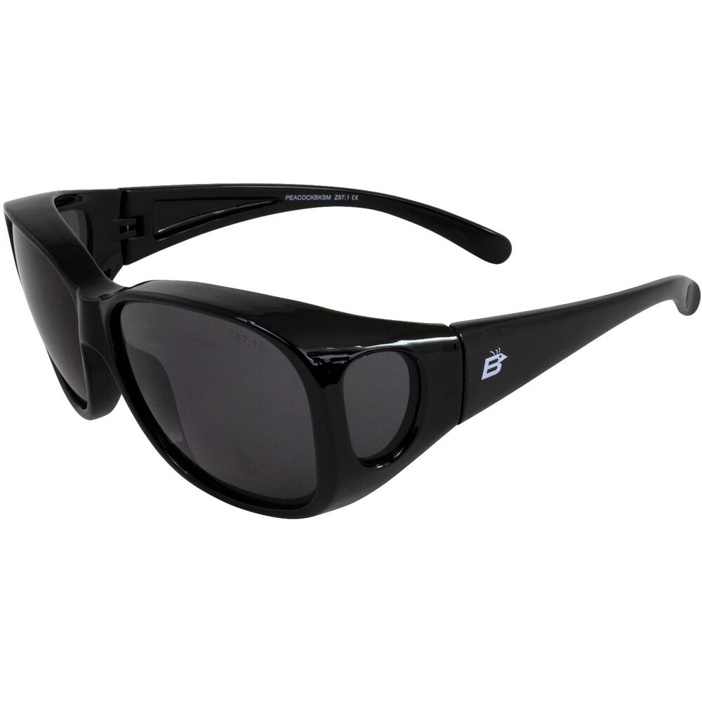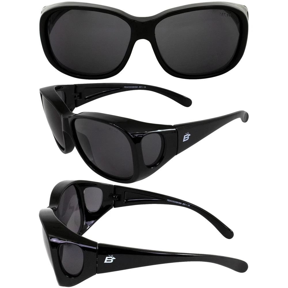 Birdz Eyewear Peacock Large OTG Fit-Over Sunglasses Black Frames Smoke Lenses Has the struggle to find a pair of fit-over safety sunglasses that actually fit over your regular glasses been all too real? Some larger frames are difficult to accommodate on that front, so if you’ve tried numerous pairs to no avail, we’re happy to tell you that your search is over with our Birdz Eyewear Peacock Fit-Over OTG (Over-The-Glasses) Safety Sunglasses. This pair of over-the-glasses frames is 6 inches wide by 2.25 inches high by .25 inches deep, fitting a frame of up to 50mm in height, 140 mm in width. Crafted of high-quality, durable, and flexible nylon for a softer, more comfortable fit, these glasses also feature side windows for a wider range of peripheral vision. Additional features include shatterproof polycarbonate lenses for maximum protection and meet or exceed ANSI Z78.1 safety standards. This pair features black frames with smoke lenses that provide 100% UV400 protection from the harmful rays of the sun. Glasses are also available in yellow and clear lenses and come complete with a microfiber pouch for safe cleaning and storage. Product Details Brand Birdz Color Grey Size Adult Manufacturer Birdz Product Type Sunglasses Mpn PEACOCKBKSM BIG ENOUGH FOR LARGER FRAMES- Generous proportions accommodate even some of the largest frames GENEROUS MEASUREMENTS- This pair of over-the-glasses frames is 6 inches wide by 2.25 inches high by .25 inches deep, fitting a frame of up to 50mm in height, 140 mm in width FLEXIBLE AND DURABLE MATERIAL- Crafted of high-quality, durable, and flexible nylon for a softer, more comfortable fit, these glasses also feature side windows for a wider range of peripheral vision SAFE FOR INDUSTRIAL USE- Shatterproof polycarbonate lenses meet or exceed ANSI Z78.1 safety standards MICROFIBER BAG FOR STORAGE- Glasses come complete with a free microfiber pouch for safe cleaning and storage Check out my other items. - Powered by