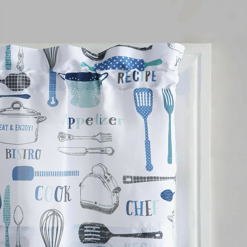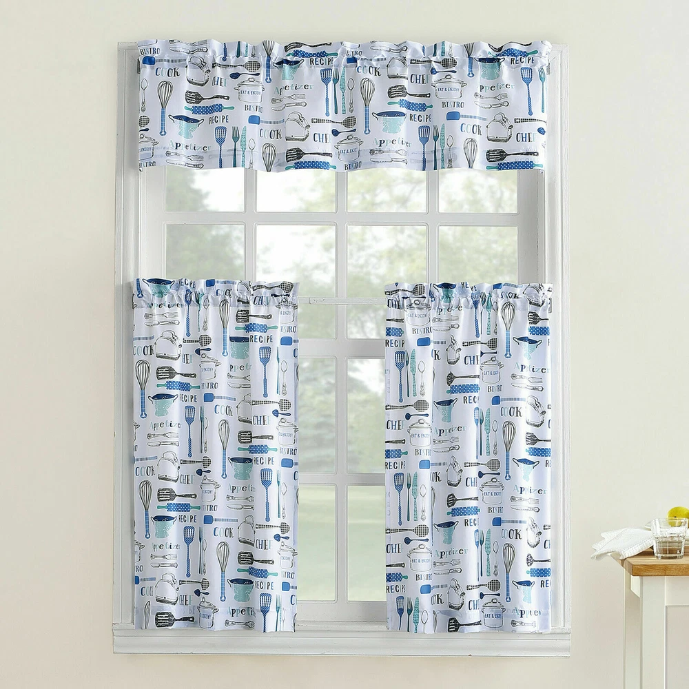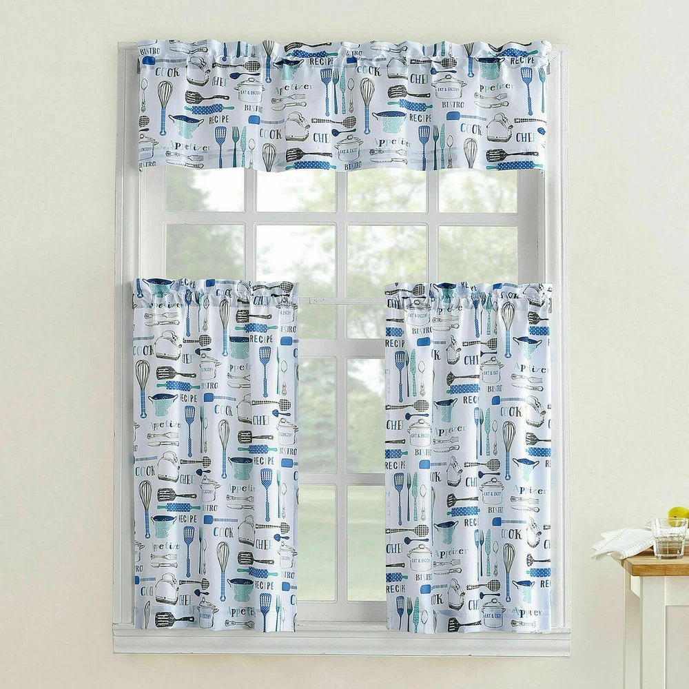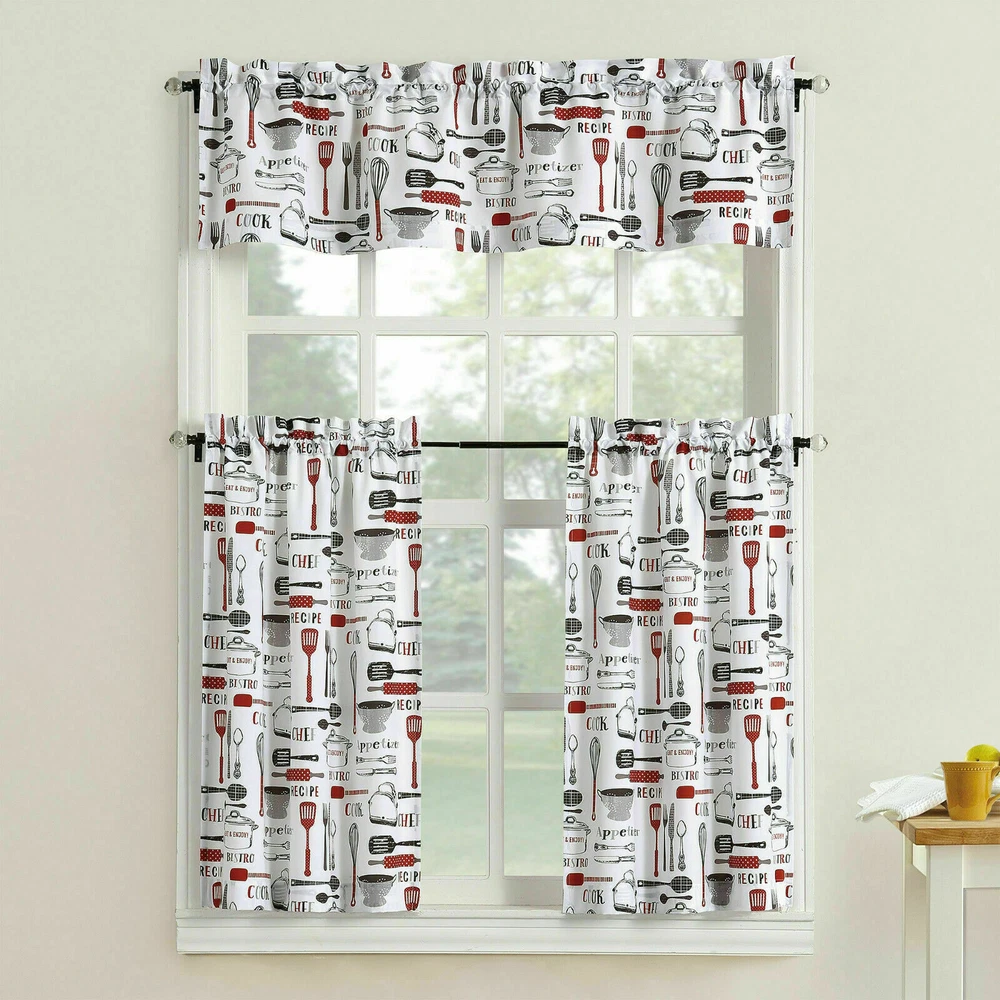 Absolutely love this charming bistro curtain set! The playful kitchen utensil design with polka dots, stripes, and script adds such a fun, cozy vibe to my kitchen. The 3-piece set fits perfectly, and the crisp white background with bold red (or blue) pops beautifully. Great quality fabric, easy to hang, and instantly brightens the room. A must-have for a cheerful café-style kitchen!