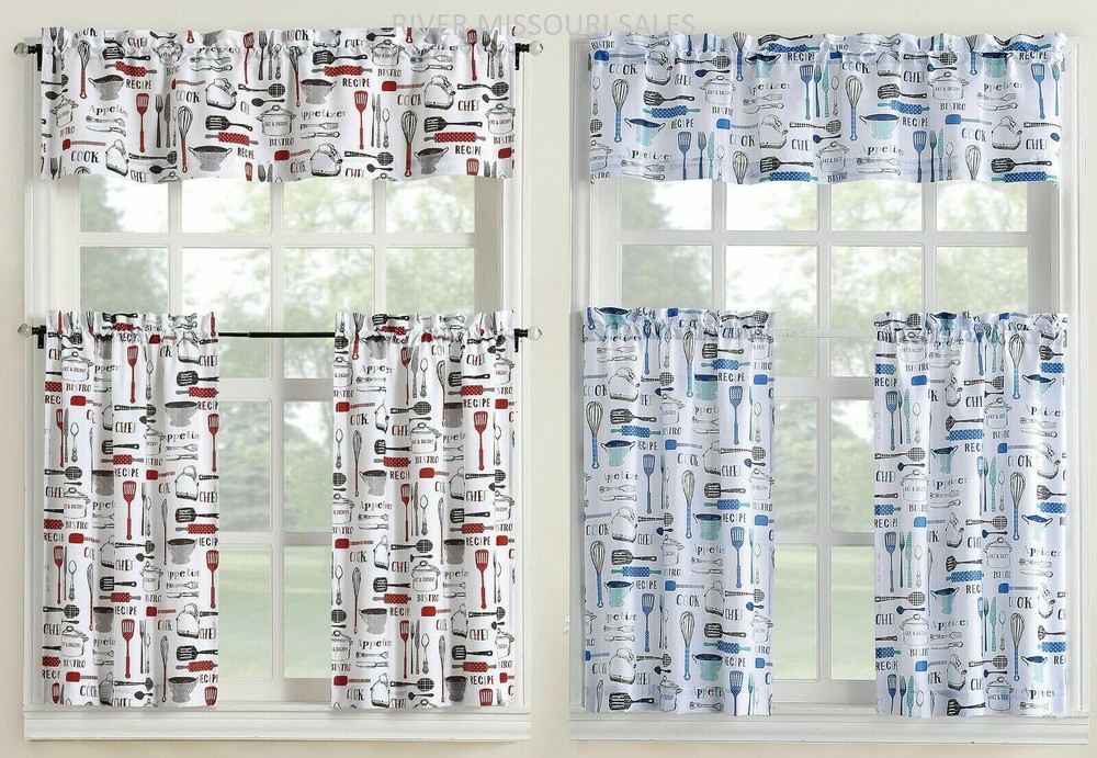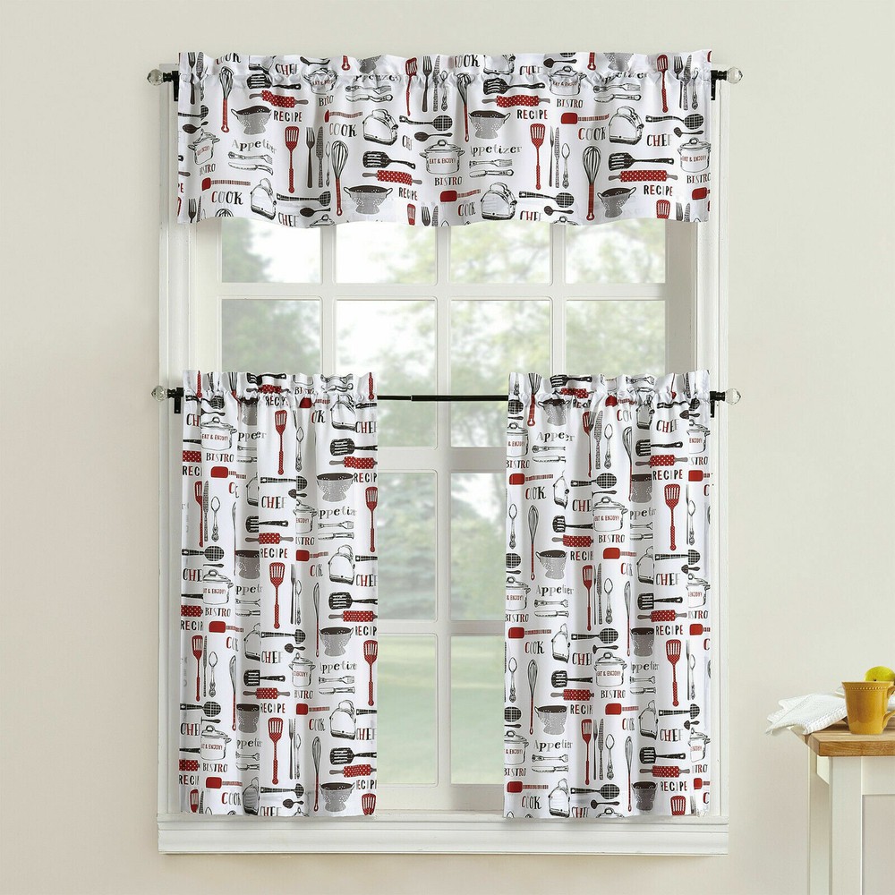 Bistro Valance & Tiers Kitchen Cafe Curtain Set Black White Gray Red Or Blue-NEW Not your style or colors? We do have a variety of valances in our eBay Store. 3 Piece set includes the valance (54"W x 14"L) and tier pair ( 29"W x 36" L each panel x 2). Stylish design featuring kitchen utensils, most with a fun pattern, like the rolling pin has polka dots and spatula has script, rubber spatula handle has stripes, etc.) Available in red or blue, both with white background and black and gray accents. Product Highlights 3-piece set includes 1 valance and 2 tier curtains Featuring kitchen utensils motifs, it is a fun update to any kitchen window Two 54" x 36" tiers and 54" x 14" valance included Rod pocket header is easy to hang and style Material: Polyester Machine washable Shipping: Allow 2-4 business days within the USA Payment needs to be made within 2 days of the using 'buy it now' or an auction's end. However, remember the quicker you pay for the item, the faster we can get it to you . Now, in the case 2 days has passed, we will want to report it to eBay to have our seller fees refunded and be able to relist our product as soon as possible. Once an unpaid item case has been opened with eBay, the buyer will still have 4 days to make payment before the unpaid item case is closed. Please don't abuse this rule. We work on shipping your order right away after payment. We understand you have paid for your item and are ready to see it delivered. Normal shipping means giving us 1-3 business days to get it packaged and on it's way with tracking information. If the shipping times vary from 1-3 business days, you will notice we have listed the shipping time for that particular item. Return policy : You will have 14 days to return your item after you receive it. We thank you for taking a look, your time, and your business! Please leave us a 5 star FEEDBACK, and we will be sure to do the same. We want you to be content and satisfied with your item. One of the reasons for doing it this way is the actual sale is not over until you are able to inspect your item or items and say you are happy with your order. Please don't leave us neutral or negative feed back, contact us first and we will be happy to assist you, thank you. We do offer a return policy within 14 days of receiving your item. This policy should not be abused. We inspect our in stock products well before we ship them and we sell quality items when they are shipped from warehouses. The return option should be used for defective or damaged merchandise. If the buyer chooses to send an item back due to buyer remorse or just because, we will still refund the buyer minus a 15% restocking fee which does not mean we even recover all of our cost associated the the transaction. Also, the buyer is responsible for the return shipping unless the buyer is able to show damage upon delivery or we are made aware of the defective item within the first week of delivery. The reasons for this strict policy is we post large pictures, so the buyer can see vividly what they are buying and we post an abundance of details. The buyer should read well the details, sizes, and colors of the item. In order to ensure we can continue to bring high quality items at lower prices, we stand by our policies. Our business is located in Springfield, MO which helps make the shipping process ideal since we are central to anywhere in the country. At times we coordinate direct shipments from various suppliers and ship products direct from the warehouses of our suppliers. Most likely if we ship direct, it would be because it is more cost efficient on shipping depending on location. We also handle advertising at times on various clearance/liquidation items from warehouses and handle product sales. We are working hard to bring you, the customer high quality items with better knowledge of what you are buying at competitive and at many times you will notice better pricing than our competitors that are selling the same products on eBay. At times, our pricing is extremely low, because we are in the process of liquidating certain items. We enjoy the challenges that come with making sure our product(s) are of the upmost standard. We thrive on the enthusiasm of a job well done to your satisfaction. We enjoy communicating with our customers in their purchasing needs and we also give the customer support that is needed . We encourage your comments, ideas, and feedback about how we are doing. We gladly accept messages and communication from our customers on how they have enjoyed one of our items or their experience. Feel free to send us an eBay message anytime you have a question on an item, about us or for any reason even if you just want to say hello:) . **Further details about us can be found on our eBay Bio Page and/or our eBay ME page. We have done our best to give our customers a good knowledge of how we run our business. We try to treat each of our customers with the upmost respect and we hope we will be treated the same. Please communicate with us when or if there is a problem, and we will do our best to work it out with you.