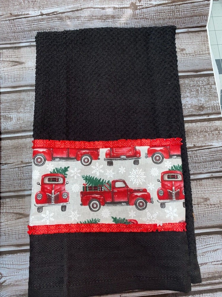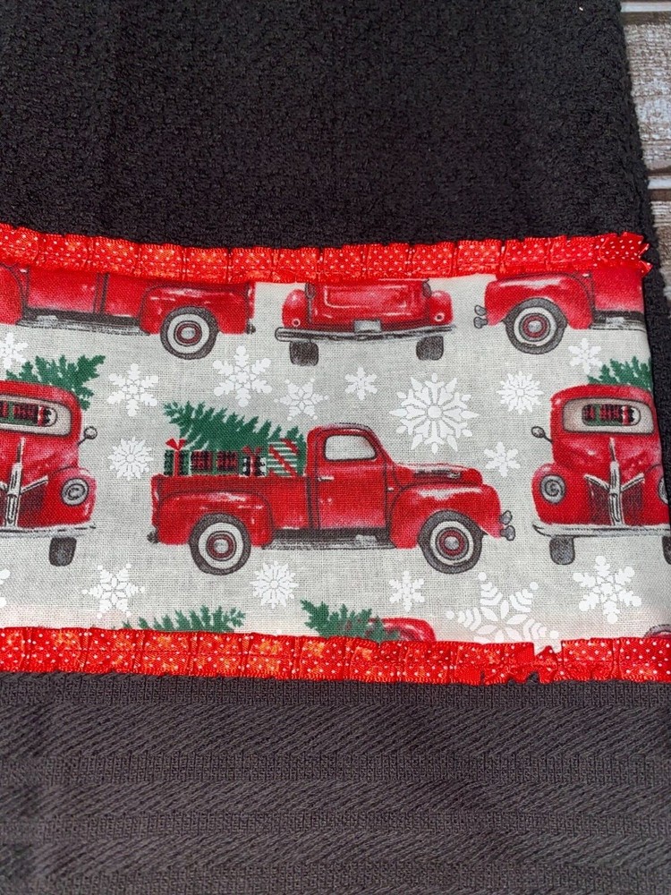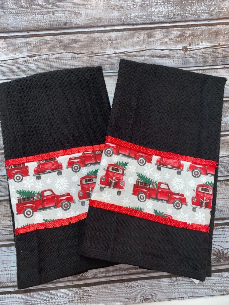 Christmas Red Truck w Christmas Tree and Snowflakes Theme Fabric and Red Trim Decorated 100 % Cotton Black Kitchen Hand Towels 2 pc set BS2832 Decorative fabric and trim are width of hand towel Hand T...