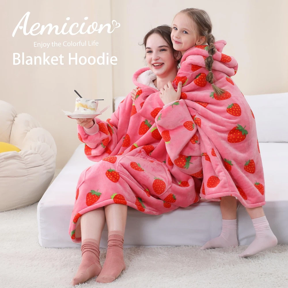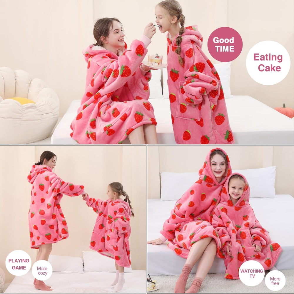 The wearable blanket is designed with a double layer, featuring luxurious fleece microfiber on the outside and thick fluffy sherpa on the inside to keep you warm at all times. The fabric is incredibly soft and comfortable, making it hard to take off. The blanket hoodie with sleeves offers coverage for your shoulders and arms, allowing you to move freely and use your hands comfortably. The big hood will keep you warm whether indoors or outdoors.The soft and stretchy cuffs ensure that the sleeves stay in place without slipping or sliding.Additionally, there are two generously-sized pockets which can be used to store items such as mobile phones, keys, snacks, or simply keep your hands warm.The blanket hoodie is big enough for most people based on a super oversized 6XL hoodie for both women and men.The blanket hoodie is perfect for keeping warm while doing activities like gaming, watching TV, reading books,camping,walking dogs or attending outdoor sports events.Just slip on the roomy hood and wrap yourself up in this plush blanket to stay fully covered and toasty during chilly weather.The high-quality blanket is resistant to fading and staining,maintaining its original comfort even after multiple washes.It can be easily machine washed and tumble dried on low heat,saving you effort. Cozy Gift:It’s the perfect birthday,Christmas or anytime gift for women,girlfriend,sisters.The wearable blanket hoodie screams out gifts for women,gifts for mom,gifts for her,gifts for girlfriends,gifts for teenage girls,girlfriend's gifts, gifts for grandmas,wife's gifts,cool presents,sister's presents and so much more!With its cool design and cozy feel,this pink strawberry hoodie blanket is sure to be a hit as a gift for your loved ones. Skin Friendly:The wearable blanket is designed with a double layer, featuring 220GSM luxurious fleece microfiber on the outside and 220GSM thick fluffy sherpa on the inside to ensure that you stay warm at all times. The fabric is incredibly soft and comfortable, making it hard for you to take off. Intimate Design:The blanket hoodie with sleeves offers coverage for your shoulders and arms,allowing you to move freely and use your hands comfortably.The big hood that will keep you warm,whether you're indoors or outdoors.The soft and stretchy cuffs ensure that the sleeves stay in place without slipping or sliding. Additionally, there are two generously-sized pockets which can be used to store items such as mobile phones, keys,snacks,or simply to keep your hands warm. Plus Size: This blanket hoodie is big enough for most people, based on a super oversized 6XL hoodie for both women and men.The blanket hoodie is perfect for keeping warm and cozy while doing your favorite activities like gaming,watching TV, reading books,camping, walking dogs,or even attending outdoor sports events.Just slip on the roomy hood and wrap yourself up in this plush blanket to stay fully covered and toasty during chilly weather. Easy to Maintain:The high-quality blanket is resistant to fading and staining, ensuring that it remains free from pills and shedding even with prolonged use. It can be easily machine washed and tumble dried on low heat, saving you a great deal of effort. Even after multiple washes, it will maintain its original level of comfort.