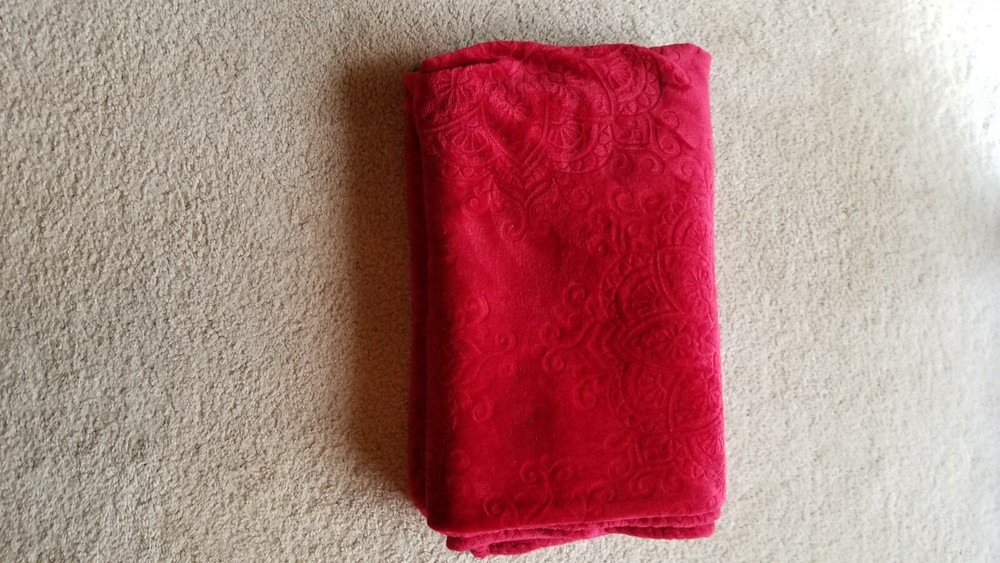 Up for sale is this nice very soft blanket. It is Red with a geometric pattern imprinted in it. It measures 49" x 75 ". It is in very good condition. I think the material is acrylic. It has been fresh...
