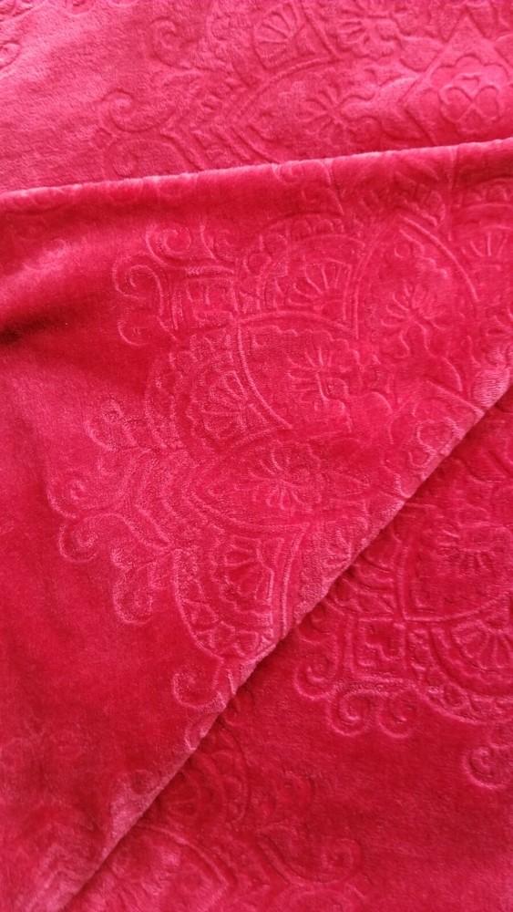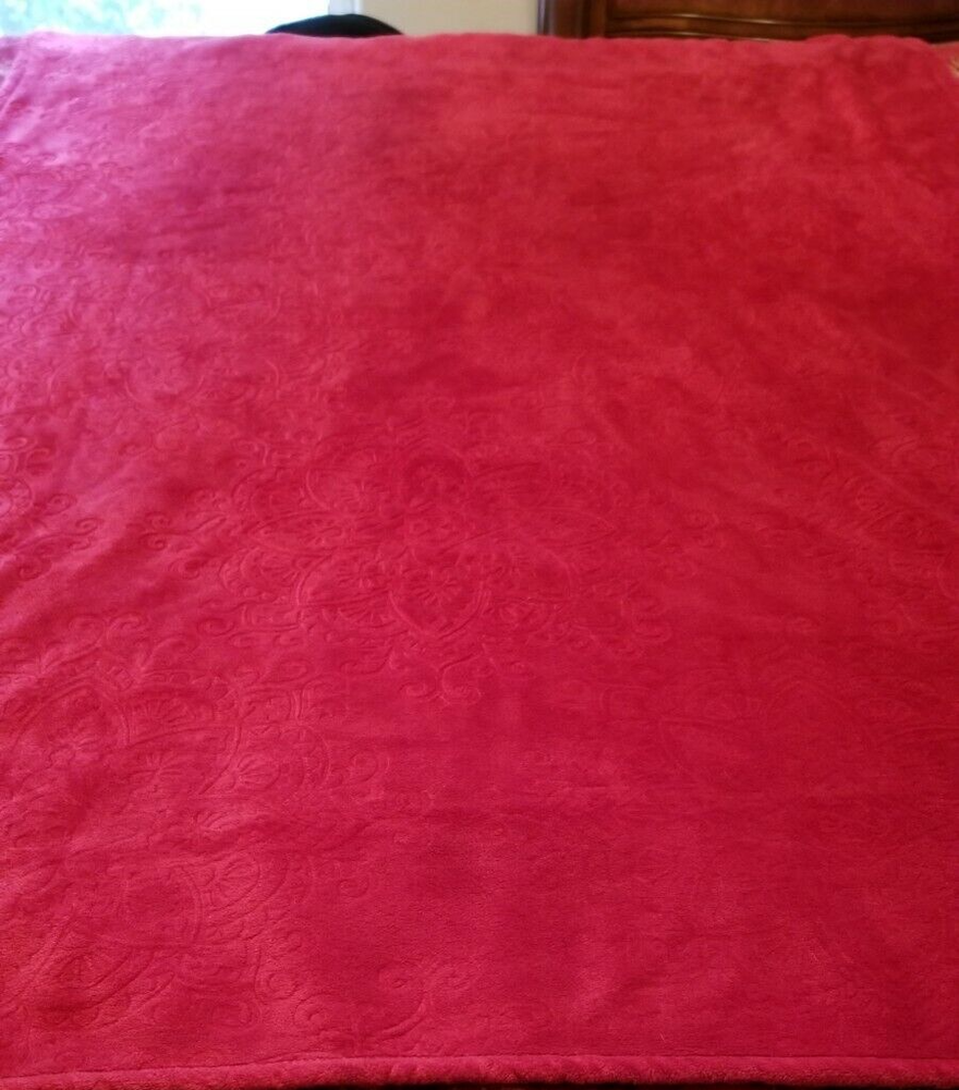 Up for sale is this nice very soft blanket. It is Red with a geometric pattern imprinted in it. It measures 49" x 75 ". It is in very good condition. I think the material is acrylic. It has been freshly washed.