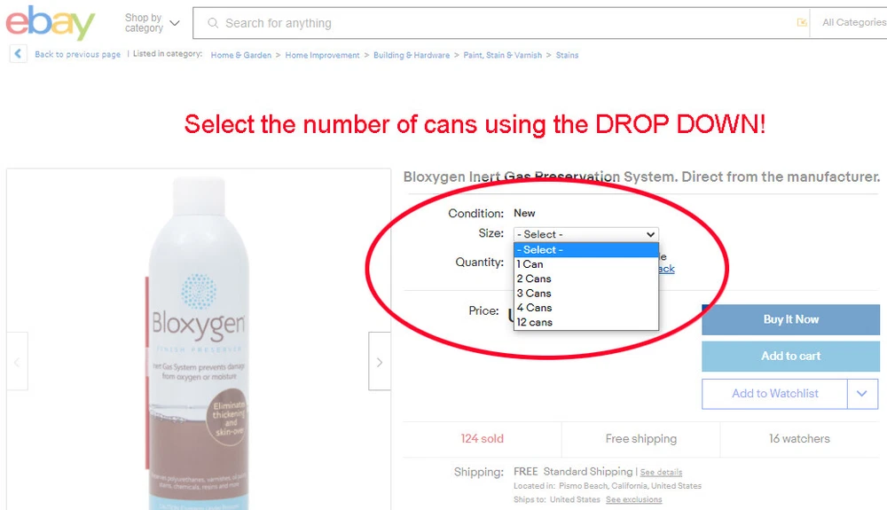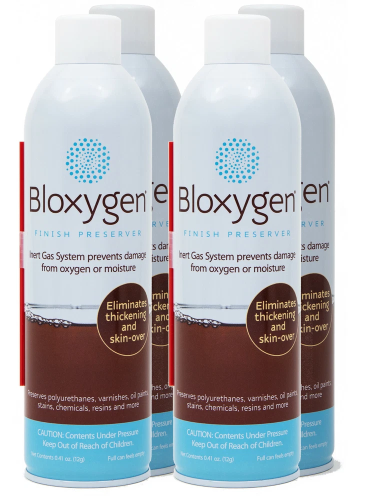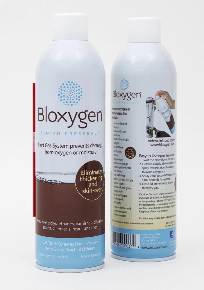 Buy direct from the manufacturer! Did your finish gel up, skin over, or thicken and become waste? Just use Bloxygen (for "blocks oxygen") next time and you can use every DROP. Bloxygen Preserver Inert Gas Preservation System. Just Spray, Seal, and Store. Keep leftovers fresh. You can choose how many cans you want above. FREE SHIPPING on all orders. Discounts for volume: Item Suggested Price Discount Price per can BloxygenCan $ 17.45 $ 16.95 3% $ 16.95 BloxygenTwoCans $ 34.90 $ 31.53 10% $ 15.76 BloxygenThreeCans $ 52.35 $ 45.77 13% $ 15.26 BloxygenFourCans $ 69.80 $ 58.99 15% $ 14.75 BloxygenCaseOf12 $ 209.40 $ 158.65 24% $ 13.22 • WHAT IS BLOXYGEN? A powerful and proven formula to save your leftover paints, finishes or food from getting ruined by oxygen or moisture. Don?t let your expensive supplies go to waste, use Bloxygen to BLOCK OXYGEN. Simply spray, seal and store. • HOW DOES IT WORK? Bloxygen uses Ultra-Pure Argon Gas. Argon is 25% heavier than oxygen. When sprayed into your container it pushes the oxygen or moisture up and out, sealing the contents with a heavy blanket of stable gas. The revolutionary NATURAL formula can lengthen the lifespan of some paints or finishes to 10 years or more! • WHY USE BLOXYGEN? Anyone who does handy work or painting has experienced the frustration of hardened paint, finishes that have become rubbery or separated, or oil-based coatings that can never be used again. Bloxygen will save you $$$$ by significantly increasing the shelf life of your products and reducing hazardous waste! • WHEN TO USE BLOXYGEN? For long-term storage protection, you can spray the finish preserver into cans of opened Polyurethane glue, Waterlox, Tru-Oil gunstock finish, auto body chemicals and coatings, and photo chemicals. You can even use the food preserver spray for wine, liquor, hops, seeds, olive oil, makeup, and food. • WHO SHOULD USE BLOXYGEN? Our thousands of customers each have their own special use for Bloxygen. Whether you are an artist, craftsmen, woodworker, mechanic, boat builder, a brewer or self-proclaimed foodie, we guarantee you will be using Bloxygen all the time! Preserve, protect and prevent waste today! Uses for Bloxygen include: • oil-based paint • varnish • spar varnish • polyurethane • catalysts • photo chemicals • tung oil • wood fillers • urethanes • stains • gunpowder • marine coatings • printing chemicals • lab chemicals • sign paints • autobody chemicals • refinishing products • some glues • epoxy resin • wine, hops, seeds • cooking oils Seller Warranty Description 100% satisfaction guarantee. We will make EVERY effort to satisfy any concern. We use only the highest quality components and make Bloxygen here in the USA to ensure the best product we can deliver. There are only three problems we've ever seen: • Not Enough Gas Used: The entire storage container must be purged. You cannot use too much gas. • Slow Lid Seal / bad seal: Once the container is purged, the lid must be immediately sealed into place. Make sure that the lid is spotless and dent free to create an airtight seal. • Bad Finish: Once oil-based finishes absorb oxygen and skin over or gel, they will continue to have problems during storage. These finishes will never be the same. Start with NEW finish and use Bloxygen each and every time it's stored. Learn more here: youtube.com/bloxygen