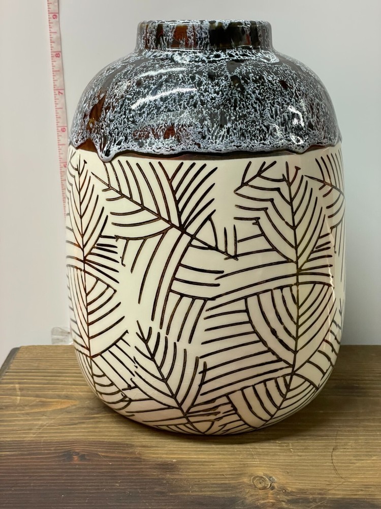 Add style to any room w this beautiful ceramic vase. Color: White, Blue, Brown Leaf Design Size: 9in x 7in Shape: Cylinder Material: Ceramic Brand: Pier 1 Imports...