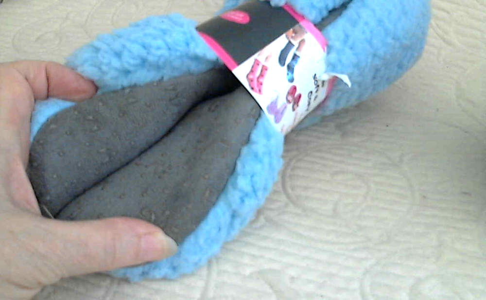 Very nice poly fleece in blue brand new pull on slipper socks for W US Size 5 - 8M. They have the size One Size fits most, however, they are around 9" long so they would fit sizes 5 - 8 M since they are not real stretchy. They measure 9" Long which would be about right for those sizes. They are lined in the same light blue po9ly fleece. The bottoms are gray with slip resistant nubs and canvas type fabric. They are are NEW. Weight: 4 oz unpackaged. USA Seller...................... Happy Shopping Always..................