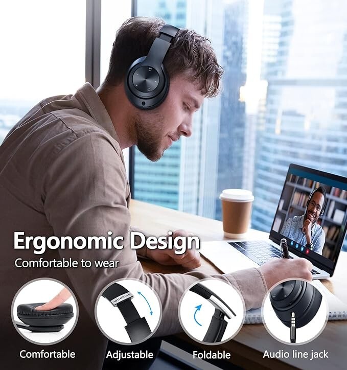 Immersive Audio Experience: These over-ear headphones deliver superior sound quality with deep bass, crystal-clear treble, and 6 EQ modes for personalized listening across various genres like Bass, Jazz, Rock, and more. Unbeatable Battery Life: Enjoy up to an incredible 60 hours of playtime in Bluetooth mode, outperforming most wireless headphones, ensuring your music never stops. Versatile Connectivity: With both Bluetooth 5.0 and a 3.5mm audio cable, these headphones seamlessly switch between wireless and wired modes, catering to your preference and device compatibility. Ergonomic Comfort: Designed with soft, ventilated over-ear cushions and an adjustable, foldable construction, these headphones offer a secure, comfortable fit for extended wear during any activity.