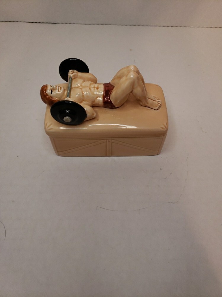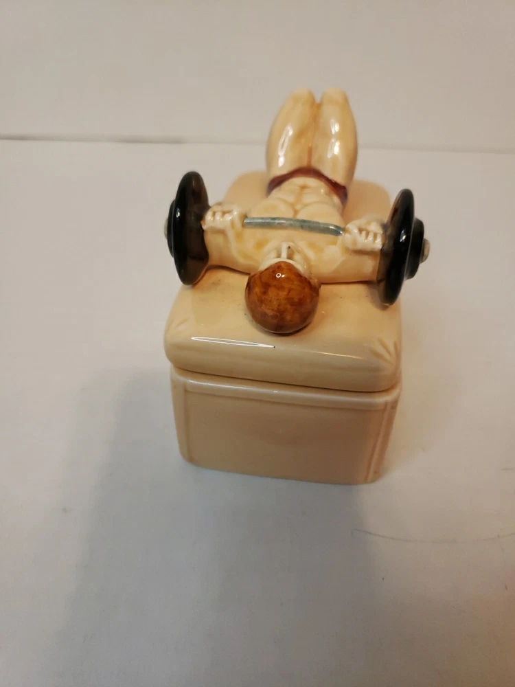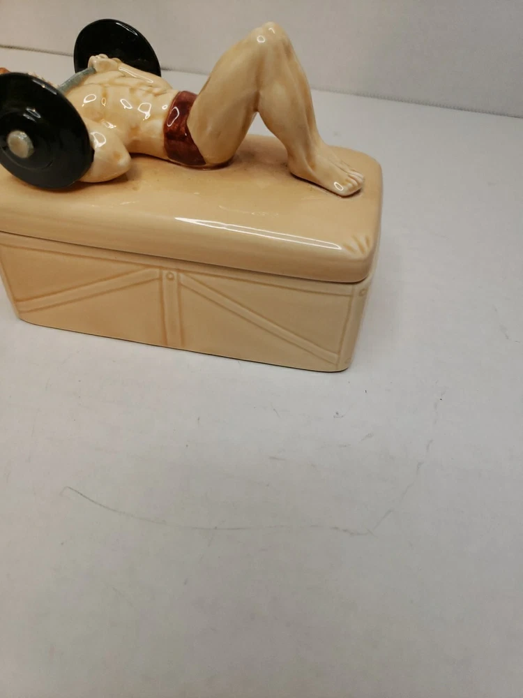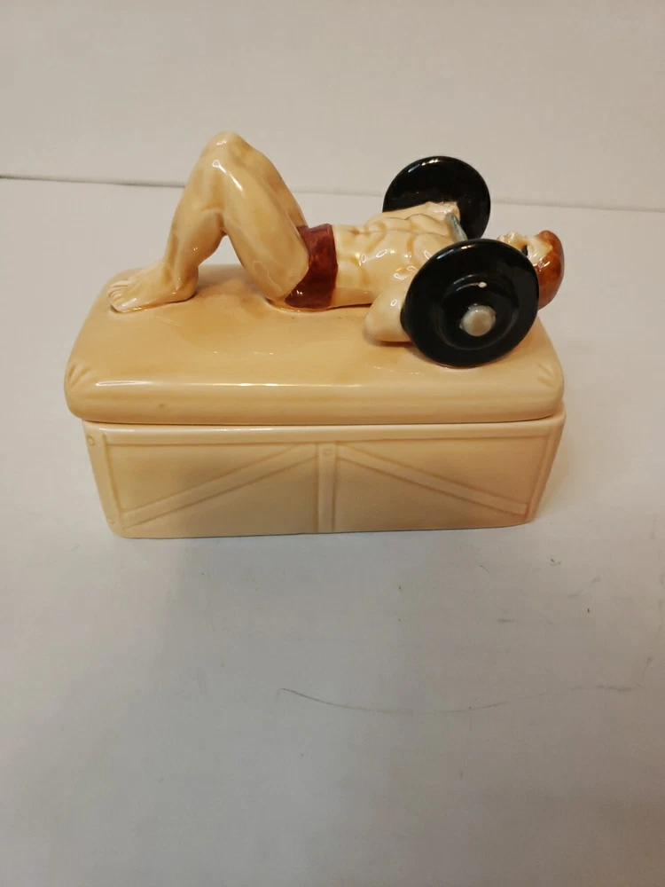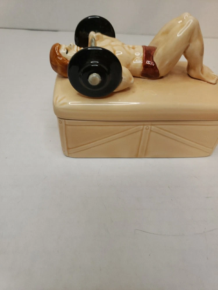 This vintage ceramic trinket box is a must-have for any bodybuilding enthusiast. Made in Japan in the late 20th century by Vandor, it features a rectangular shape and beige color with a bodybuilding theme. Measuring 4.5 inches in length, 3.5 inches in height, and 2.5 inches in width, it is a medium-sized box that can hold all occasions worth of items. The box comes in its original packaging and is an original piece from the 1980s. It is perfect for storing small items and can be a great addition to any collection. Get your hands on this unique bodybuilding ceramic trinket box today!