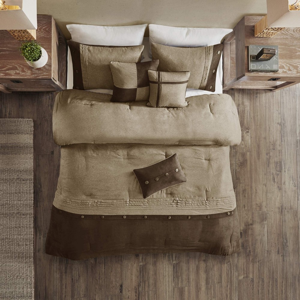 Tactile Cloud Comfort - Experience cloud-like comfort with our supremely soft textured faux suede in earthy tones, seamlessly blending light and dark panels for a striking dual-tone design that wraps you in cozy warmth while creating tactile contrast between textured depth and smooth sophistication Year-Round Versatility - Designed for all-season adaptability – lightweight breathability for summer comfort and 270g/m² thermal density for winter warmth. Effortlessly transitions between rustic cabin retreats, modern minimalist bedrooms, and cozy guest rooms with universal styling that complements any interior theme. Lodge Aesthetic - Rustic lodge charm meets luxury: Button-tufted embroidery and textured faux suede panels create a wilderness-inspired retreat. Three decorative pillows add layered dimension with embroidered details, seamlessly blending into mountain cabins, lakeside cottages, and urban apartments. Complete Set - Includes 1 Comforter (104"W x 92"L), 2 King Shams (20"W x 36"L), 1 Bed Skirt (78"W x 80"L + 15"D), and 3 pillows (18"W x 18"L/16"W x 16"L/12"W x 18"L) for a perfectly coordinated lodge-inspired bedroom. Effortless Care - Machine-washable durability: Wash in cold water (gentle cycle) and tumble dry on low heat to prevent wrinkles. Stain-resistant fabric maintains crisp texture even after repeated cleaning.