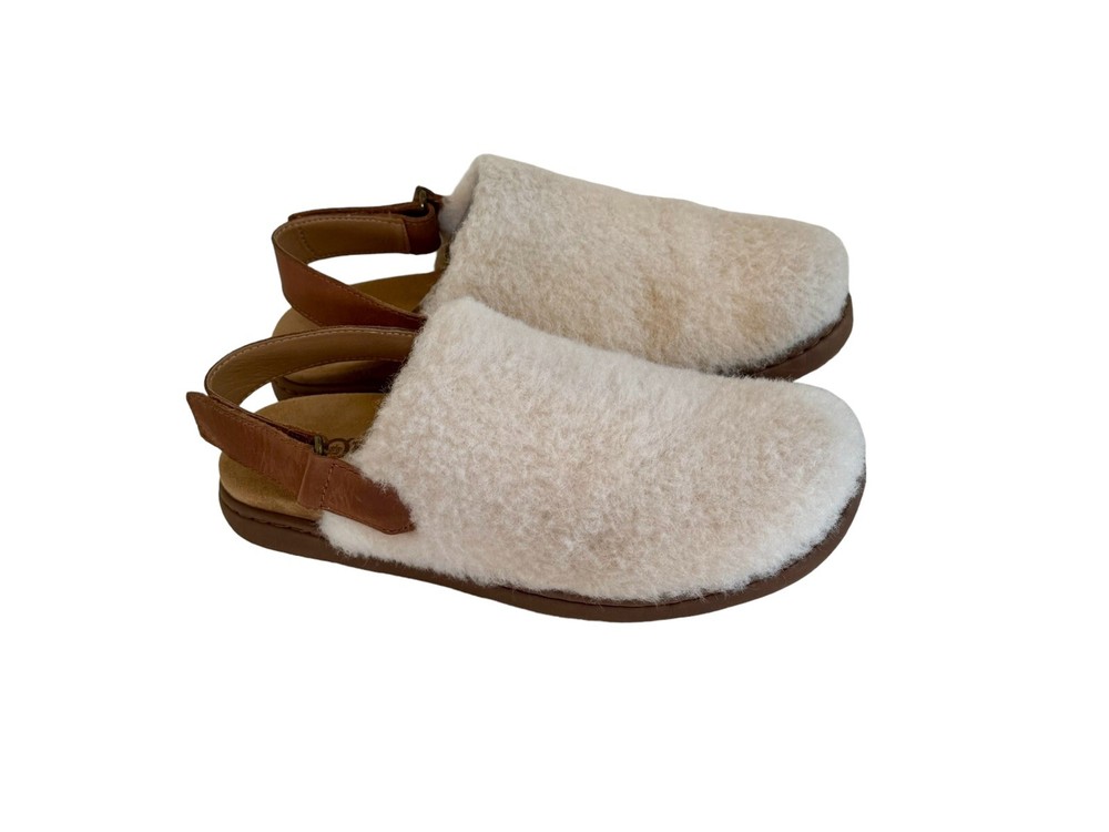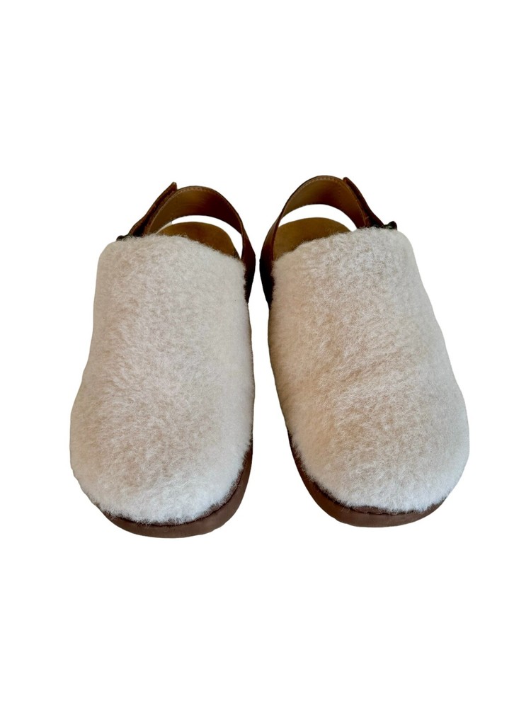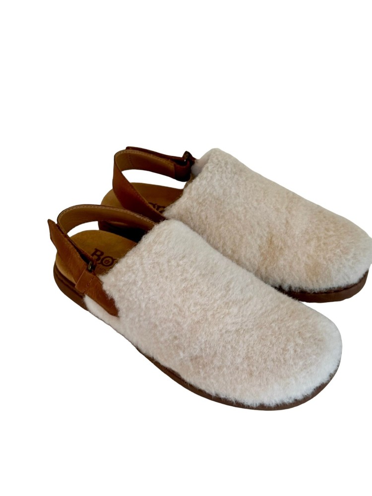 cozy slide slipper sandals by Born. The white shearling fur upper and faux fur lining provide ultimate comfort and warmth, perfect for lazy days at home or casual outings. The slip-on design with a rubber outsole and round toe shape make them easy and practical to wear. With accents of the Born logo and a solid pattern, these slippers have a classic and timeless style. Suitable for all seasons, this slipper is a must-have addition to your footwear collection.