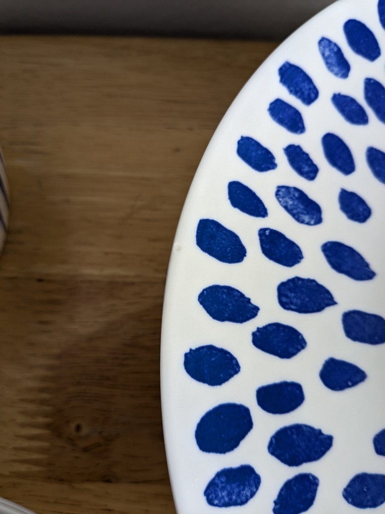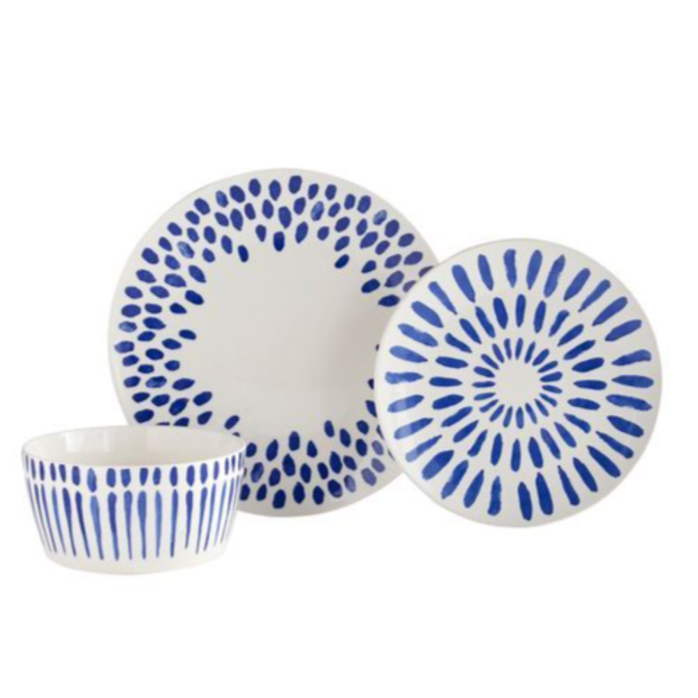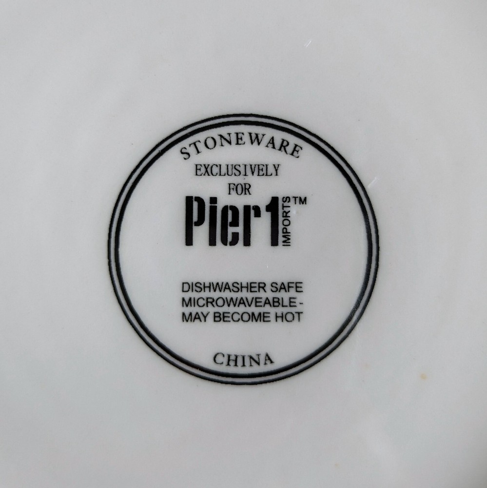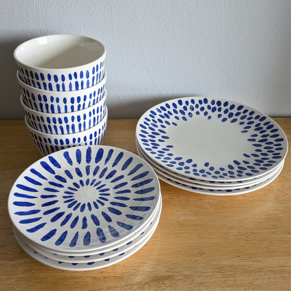 Plate and bowl set of 12 Stoneware exclusively for Pier 1 Imports: - 10-5/8" dinner plate set of 4 - 8-1/2" salad plate set of 4 - 6" bowl 3" height set of 4 Limited collection of striped and dotted patterns. Ask for the price if you want less than 12.