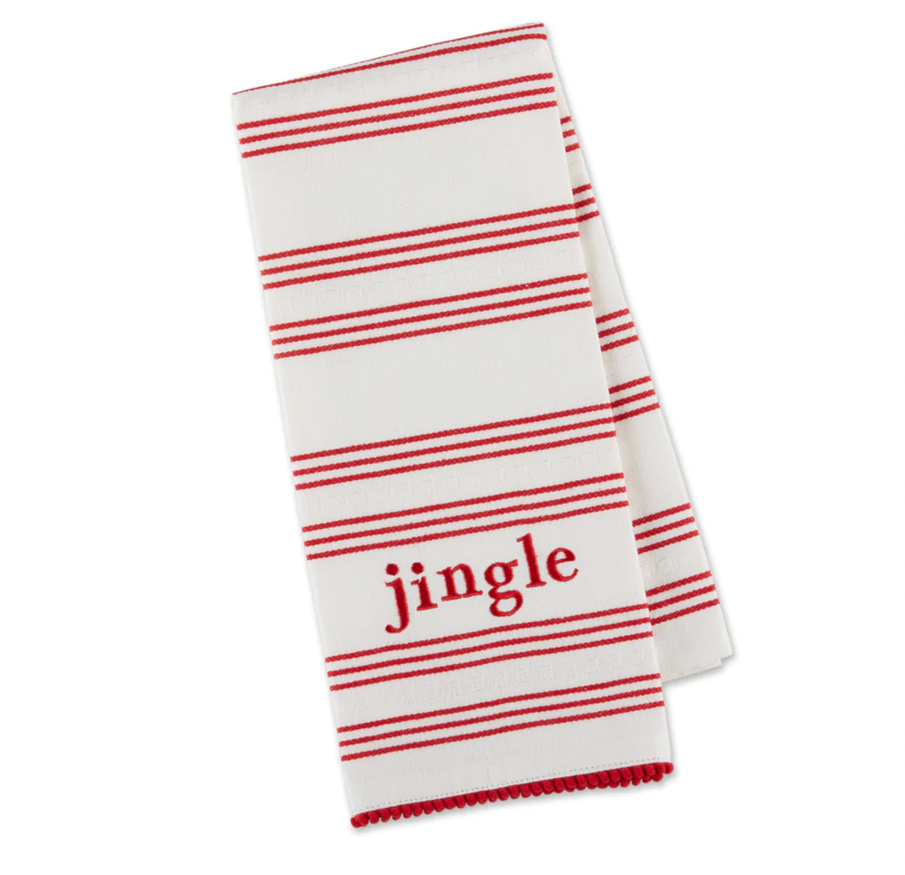 Brand new 18"x28" Kitchen towel with embroidered Jingle and red ball trim on the bottom. Very cute, would make a nice gift! 100% cotton Free Shipping! Be sure to check out my other listings for cute kitchen towels!