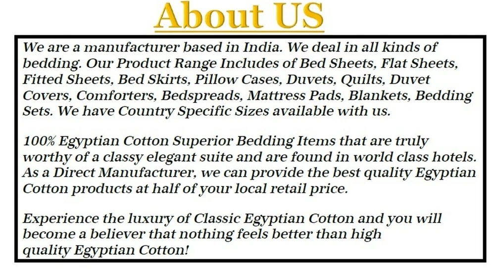 Ultra Soft Lightweight Down Alternative Comforter About the Product COMFORTER Package Includes: 1 PC Comforter Material: 100% Egyptian Cotton Color: As Per Listing Images Size: Please refer to Below: California King Size Comforter Measurements Cal King Comforter = 90x108 Inches(229x274 cm) 100% Egyptian Cotton Shell "Breathable & Durable". Down Alternative Comforter GSM Polyester Sheet Fill. Egyptian Cotton Italian Finish Super Soft Single Ply Fabric. Generous Baffle Box Stitching For Optimum Loft. Hypoallergenic - Perfect For Allergy Sufferers. Easy Care: Machine Wash Cold, Tumble Dry Low, Do Not Bleach Or Iron. Designed For Healthy Living And Comfortable Life. About Us ARE YOU SLEEPING WELL? Well Of Course, You Will Say Yes - But What We are Doing at Shreyaa Bedding is, We are continuously working to make your sleep more comfortable and luxurious by offering Quality Products at Affordable Prices. If you love the luxury, softness & hotel bedding, then certainly you will gonna love it. EASY TO CARE, OPTIMUM QUALITY BEDDING ITEMS - Made using all naturals materials, Can be machine washed and get softer over time. Fabric is lab tested to make sure - No Pilling, No Linting, No Balls After Wash, Color Fastness and finally sewed then packed for shipping. To improve durability, warm wash & light dry. Use a short dry cycle. STRENGTH - Our Products are made from 100% Egyptian Cotton which gives strength to every thoughtful attention Like - No Pilling, Low Shrinking, Crisp and Coolness for the quality of sleep you will get. 100% Egyptian Cotton Superior Bedding Items that are truly worthy of a classy elegant suite and are found in world class hotels. As a Direct Manufacturer, we can provide the best quality Egyptian Cotton products at half of your local retail price. Experience the luxury of Classic Egyptian Cotton and you will become a believer that nothing feels better than high quality Egyptian Cotton! MORE - We are a Manufacturer. All the products we are selling are in 100% Brand New Condition. We deal in all kinds of bedding. Our Product Range Includes of Bed Sheets, Flat Sheets, Fitted Sheets, Pillow Cases, Duvets, Quilts, Duvet Covers, Slipping Sofa Sets, Comforters, Reversible Comforters , Dual Tone Comforters , Velvet Comforters , Satin Comforters , Pinch Plated Comforters , Bedspreads, Mattress Pads, Blankets & Other Bedding Sets. We have Country Specific Sizes available with us. Shipping Be assured, we will dispatch the product as per our promised handling time and with express service providers like FedEx, DHL. All orders will have tracking information, once the package is shipped. We do have international shipping available at different costs. Returns If you aren't satisfied with your purchase for any reason, please ship it back to us within 30 days of receiving the item. We don't allow returned items that have been used or washed. Items returned must be in their original condition and packaging in order to receive a refund. Feedback As an eBay seller we always look for your positive feedback. It gives us joy to be able to deliver to your expectations. If you are not satisfied with our item, let us know before you negatively rate us and we are sure to work something out. We will also rate positive to our customers who make easy transactions with us. Import Duty & Taxes We are unable to anticipate import duties or taxes for buyer country in advance. Our selling price does not include them. So, it is Buyer’s Responsibility . Contact Us If you have any suggestions or queries related to our Product or Services, we are more than happy to assist you. You can reach to us by clicking on Contact Seller Button. Thank You For Shopping With Us