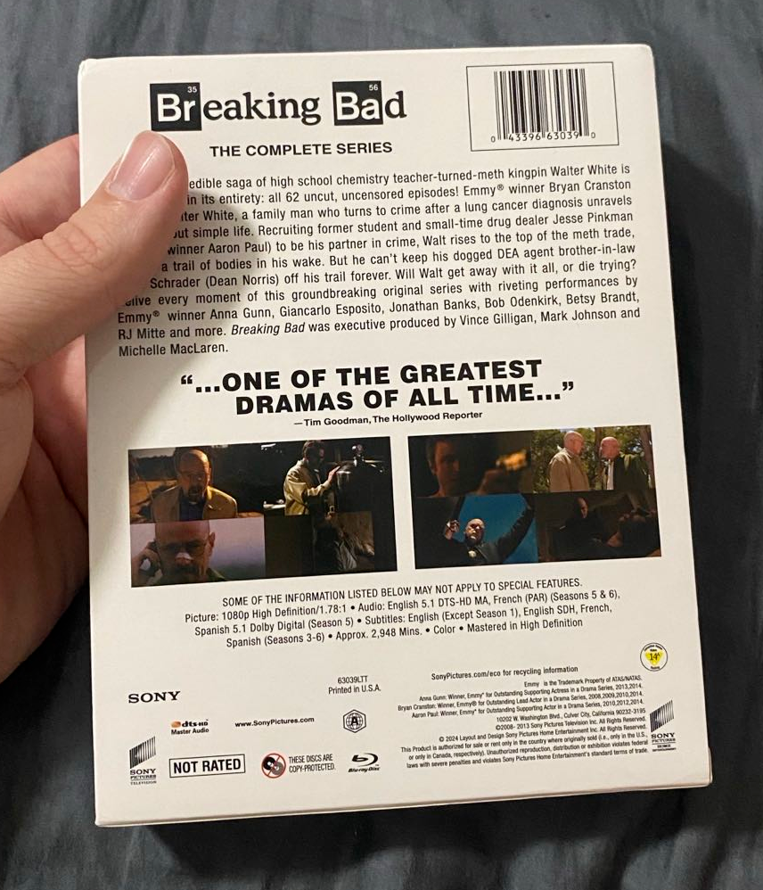Perfect quality and cheapest price. You won't find a better deal for a brand new Breaking Bad complete series set on blu ray ANYWHERE. Get 'em while they're hot! Legit seller. Highly recommend ๐