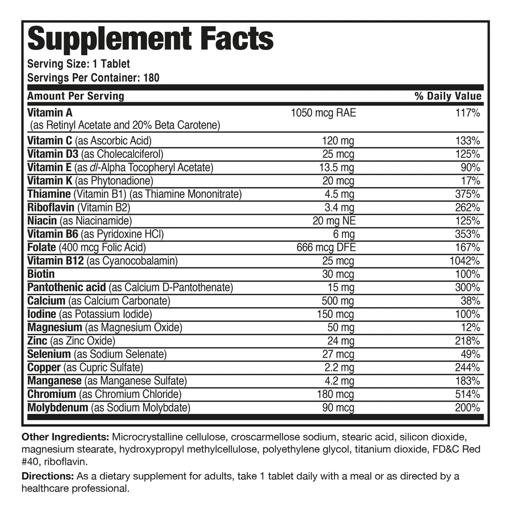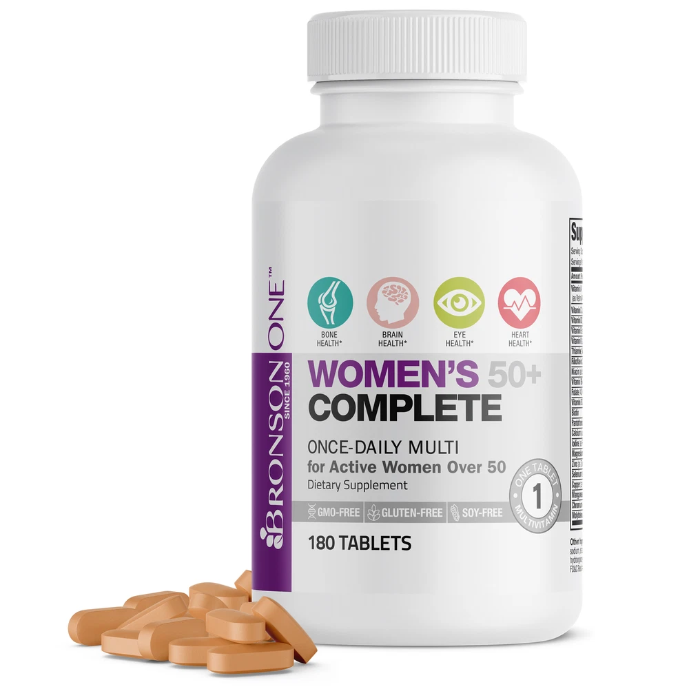 Youth is wasted on the young! Bronson ONE Women's 50+ Complete has the targeted nutrients you need to look and feel young, energized and alive! Bronson Vitamins Our eBay Store About Us Contact Us Add to Favorite Sellers Bronson ONE Daily Women's 50+ Complete Multivitamin Multimineral, 180 Tablets Youth is wasted on the young! Bronson ONE Women's 50+ Complete has the targeted nutrients you need to look and feel young, energized and alive! Targeted Nutrition For Women 50+: Bronson’s Once Daily tablet combines key vitamins and beneficial minerals to promote valuable daily replenishment for healthy females that are 50+.* Wellness + Vitality: Women's 50+ Complete is the perfect daily Multivitamin/Mineral formula to support wellness and vitality for females that strive to live a healthy active lifestyle.* Superior Quality Formula: Carefully manufactured and tested by trained professionals at our state-of-the-art facility located in Hauppauge, New York. cGMP Premium Standards: Every product manufactured by Bronson is put through a rigorous process to ensure purity, potency and integrity. Through our very own cGMP Certified New York Facility that complies with the most current regulations, we promise to deliver top-quality supplements that are consistently verified for quality and safety. Product Details Count 180 Directions Directions: As a dietary supplement for adults, take 1 tablet daily or as directed by a healthcare professional. Ingredients Vitamin A (as Retinyl Acetate and 20% Beta Carotene), Vitamin C (as Ascorbic Acid), Vitamin D3 (as Cholecalciferol), Vitamin E (as dl-Alpha Tocopheryl Acetate), Vitamin K (as Phytonadione), Thiamin (Vitamin B1) (as Thiamine Mononitrate), Riboflavin (Vitamin B2), Niacin (as Niacinamide), Vitamin B6 (as Pyridoxine HCl), Folic Acid, Vitamin B12 (as Cyanocobalamin), Biotin, Pantothenic acid (as Calcium D-Pantothenate), Calcium (as Calcium Carbonate), Iodine (as Potassium Iodide), Magnesium (as Magnesium Oxide), Zinc (as Zinc Oxide), Selenium (as Sodium Selenate), Copper (as Cupric Sulfate), Manganese (as Manganese Sulfate), Chromium (as Chromium picolinate), Molybdenum (as Sodium Molybdate) Microcrystalline cellulose, croscaramellose sodium, stearic acid, silicon dioxide, magnesium stearate, hydroxypropyl glycol, titanium dioxide, FD&C Red #40, riboflavin. Safety Warnings Do not use if you are pregnant or nursing. Bronson Vitamins does not sell "close to expiration" items on Ebay. * These statements have not been evaluated by the Food and Drug Administration. This product is not intended to diagnose, treat, cure or prevent any disease.