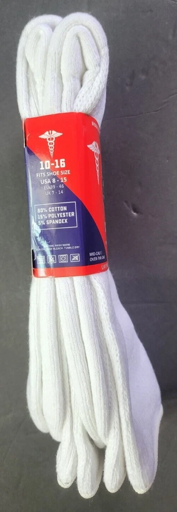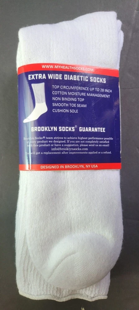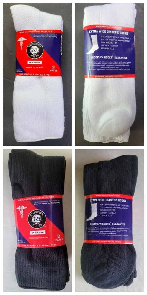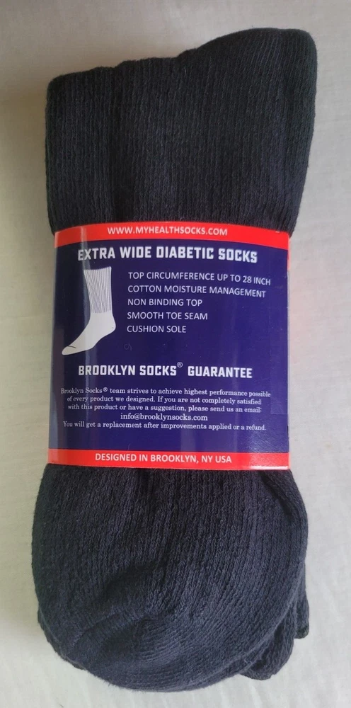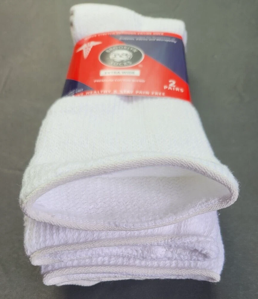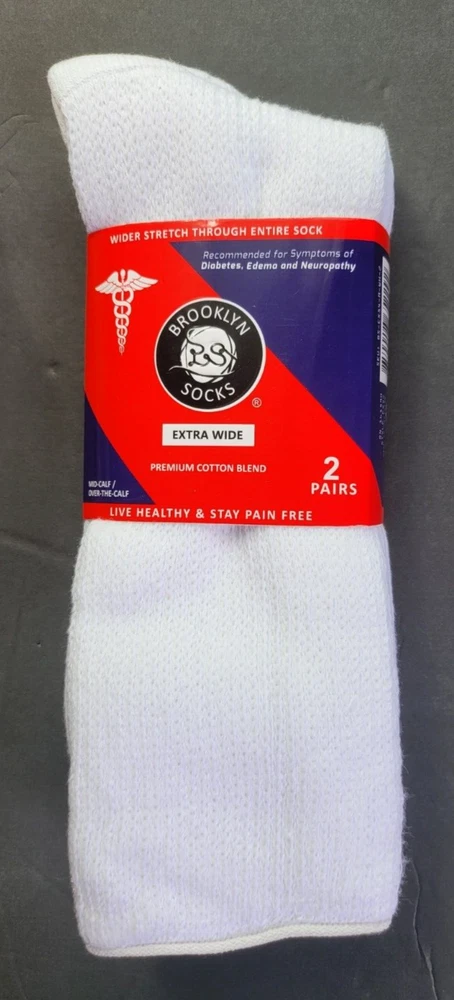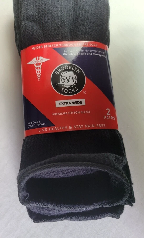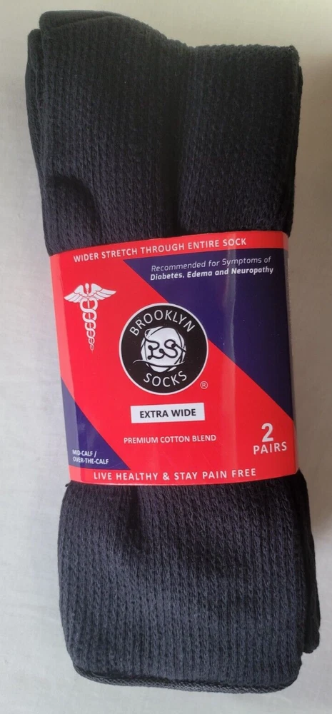 Brand New and Authentic with Original Tag. Size: 10-16, Fits Shoe Size: USA 8-15, EU 39-46, UK 7-14 Designed in USA Live Healthy & Stay Pain Free Description Introducing the Brooklyn Extra Wide Socks 2-Pack, the perfect solution for individuals seeking comfort and support for their feet. Made with extra-wide, premium cotton blend material, these long diabetic socks are designed to provide maximum comfort while also aiding in overall foot health. Whether you're looking for relief from foot fatigue or want a comfortable pair of socks to wear throughout the day, the Brooklyn Socks 2-Pack has got you covered. These socks are ideal for people with diabetes, neuropathy, or other foot-related conditions. The extra-wide design of the socks ensures a comfortable fit, reducing the risk of irritation or chafing. The premium cotton blend material offers breathability and moisture-wicking properties, keeping your feet dry and comfortable all day long. The long length of these socks provides additional support to the legs and ankles, which can help alleviate swelling and improve circulation. This makes them perfect for anyone who spends long hours on their feet or suffers from leg pain or discomfort. Fits most adults. Extra Wider Stretch Through Entire Sock Top Circumference Up to 28 Inches. Non-Binding Top Smooth Toe Seam Cushioned Sole Recommended for Symptoms of Diabetes, Edema and Neuropathy Premium Cotton Blend Moisture Management 80% Cotton, 15% Polyester, 5% Spandex Mid-Calf / Over the Calf FREE SHIPPING - FREE RETURNS! We Buy Only from Authorized Retail Sellers that Buy Overstocked inventory directly from the Designers! BUY WITH CONFIDENCE, 100% AUTHENTIC AND NEW OR YOUR MONEY BACK!! CHECK OUT OUR FEEDBACK!