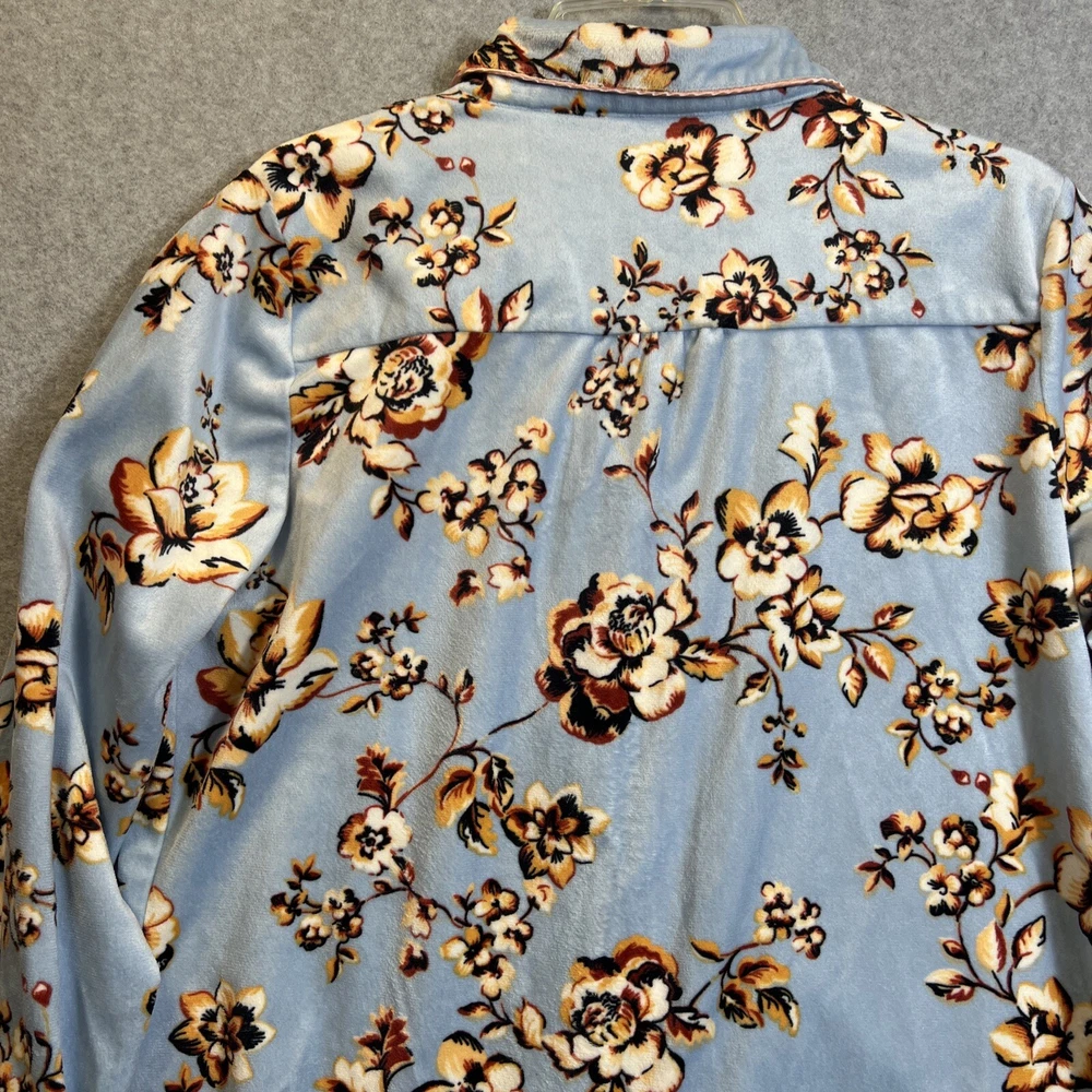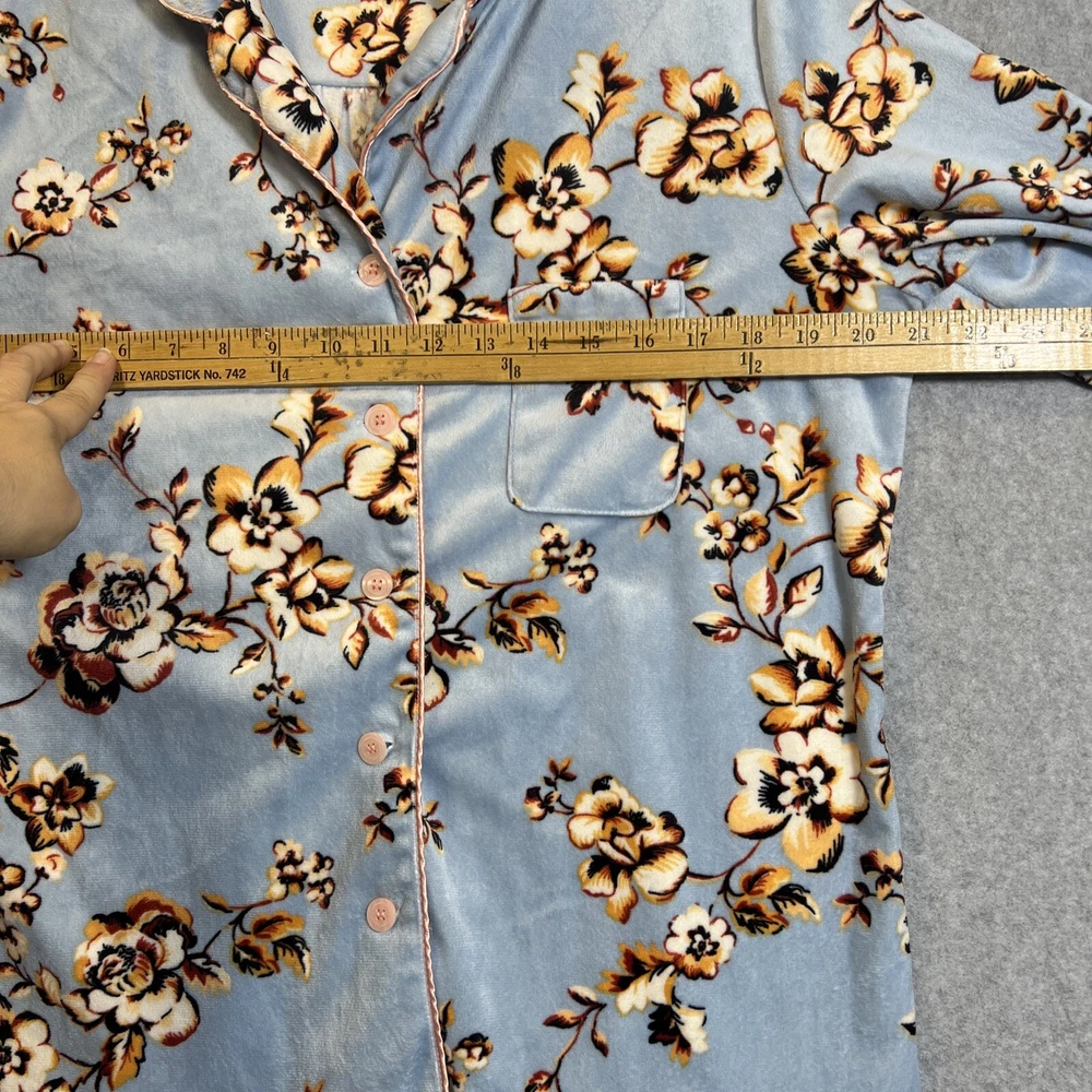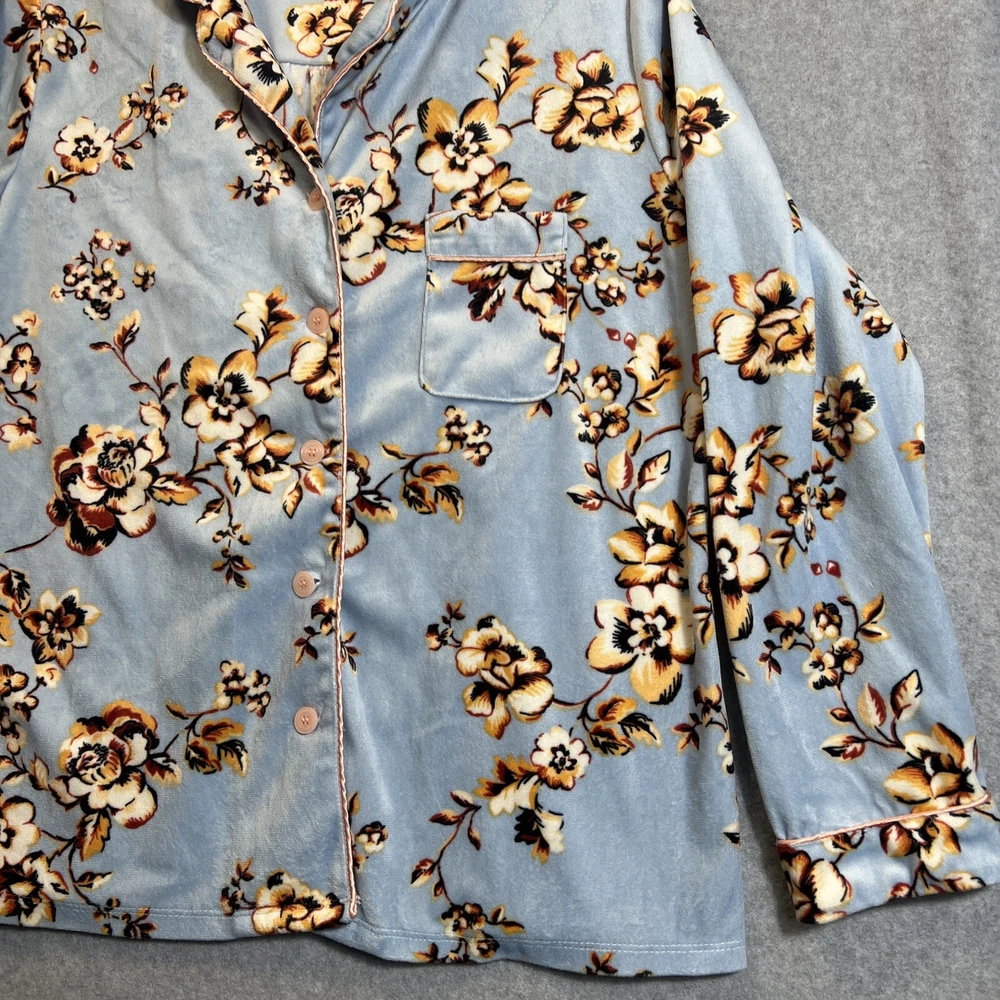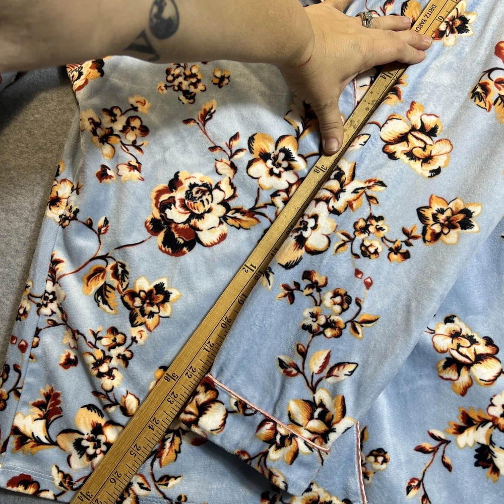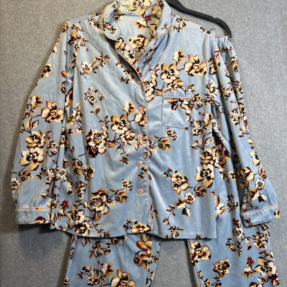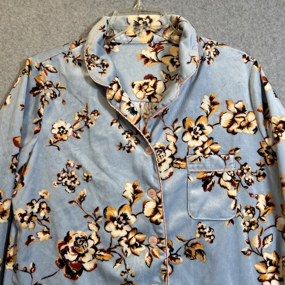 Elevate your sleepwear game with this cozy and comfortable Bumble B. pajama set. The set includes a long sleeve top with a beautiful floral pattern and button closure, paired with matching velvet pants. The light blue color and classic style make it a perfect addition to your sleepwear collection for winter, fall, or spring. Crafted from high-quality polyester material, this pajama set is machine washable for easy care. The set is available in size M and is perfect for regular size types. With its artistic flower theme, this pajama set is a must-have for any woman's sleepwear collection. Hannah Inc Treasures Typically all our Clothes come to us pre-owned We try to provide Clothes with minimal wear and tear but they all vary in degrees Please look through all our pics for condition issue - that is where you will get the best sense of what we are trying to provide. We take pics of Front, Back, pit to pit measurement, Length, flaws if present Conditions can include distressing-fading- holes- stains- alteration- pilling- additional marks PLEASE PLEASE check YOUR MEASUREMENTS compared to OUR PICTURED MEASUREMENTS. We provide 30 day free return to try and allow you to feel confident and secure in your purchase WE APPRECIATE YOUR PATRONAGE, THANK YOU!