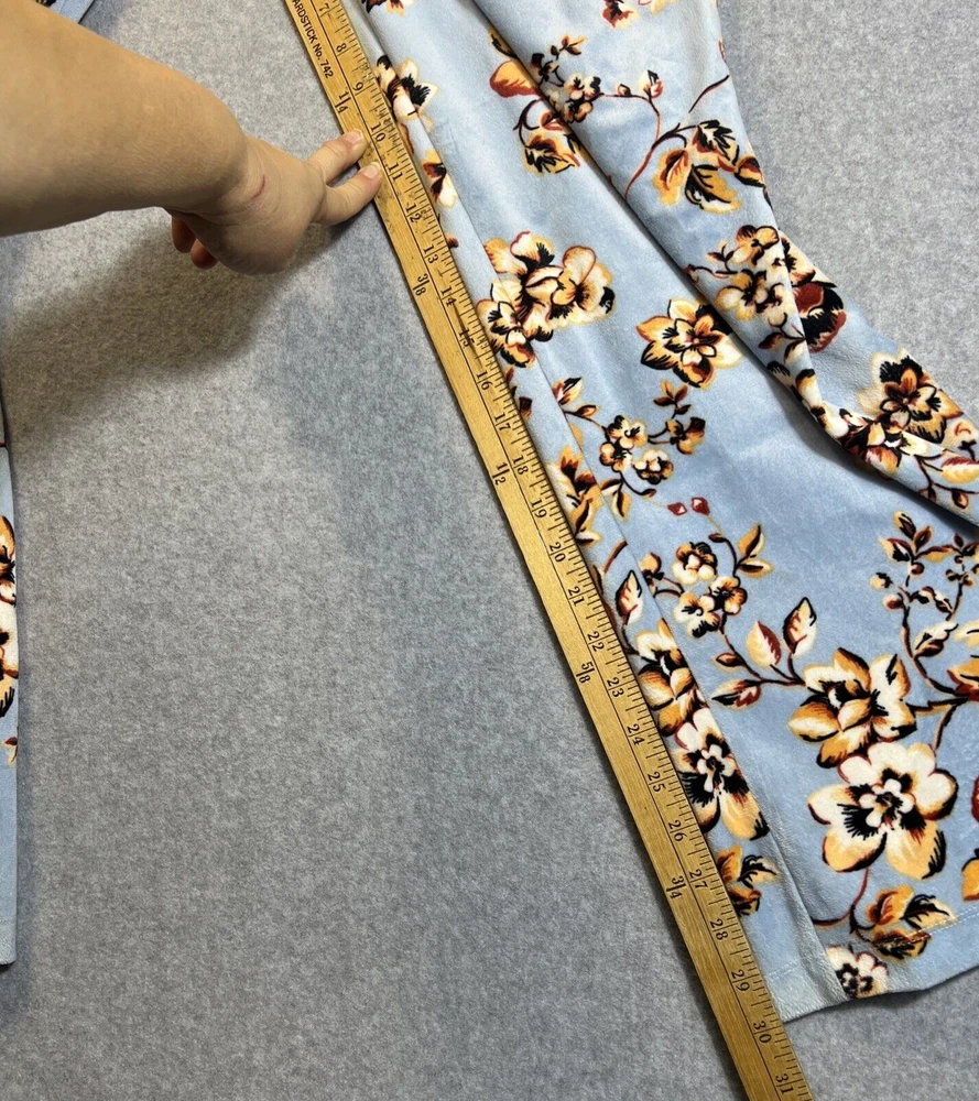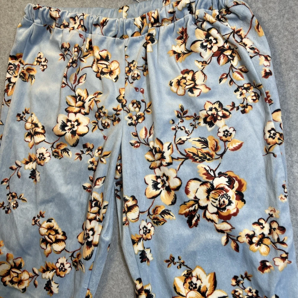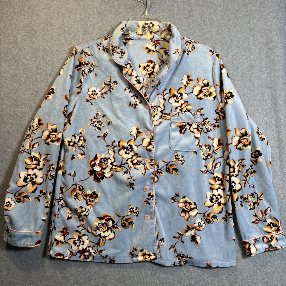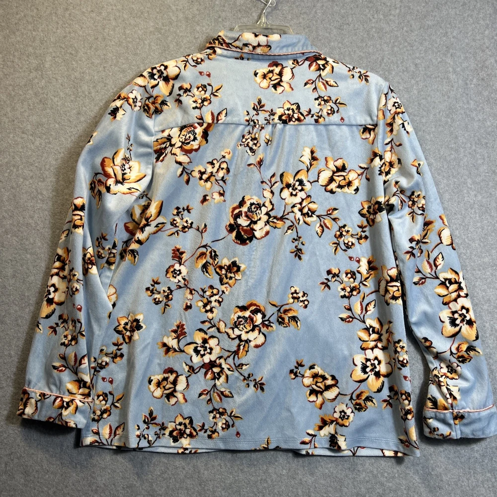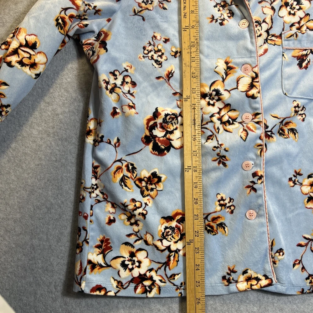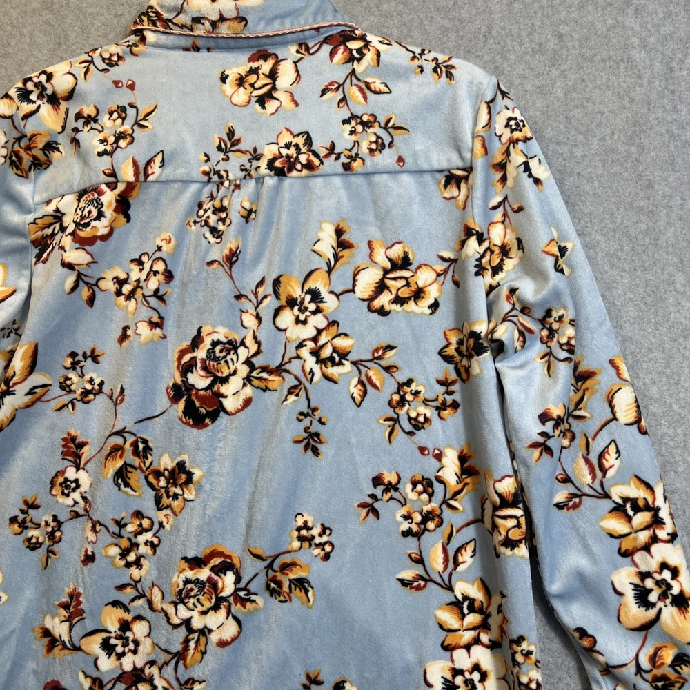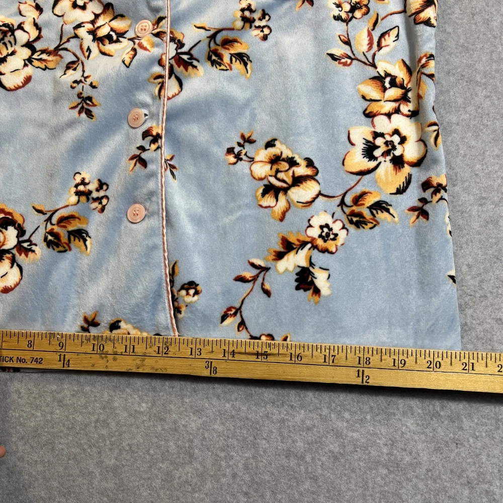 Elevate your sleepwear game with this cozy and comfortable Bumble B. pajama set. The set includes a long sleeve top with a beautiful floral pattern and button closure, paired with matching velvet pants. The light blue color and classic style make it a perfect addition to your sleepwear collection for winter, fall, or spring. Crafted from high-quality polyester material, this pajama set is machine washable for easy care. The set is available in size M and is perfect for regular size types. With its artistic flower theme, this pajama set is a must-have for any woman's sleepwear collection. Hannah Inc Treasures Typically all our Clothes come to us pre-owned We try to provide Clothes with minimal wear and tear but they all vary in degrees Please look through all our pics for condition issue - that is where you will get the best sense of what we are trying to provide. We take pics of Front, Back, pit to pit measurement, Length, flaws if present Conditions can include distressing-fading- holes- stains- alteration- pilling- additional marks PLEASE PLEASE check YOUR MEASUREMENTS compared to OUR PICTURED MEASUREMENTS. We provide 30 day free return to try and allow you to feel confident and secure in your purchase WE APPRECIATE YOUR PATRONAGE, THANK YOU!