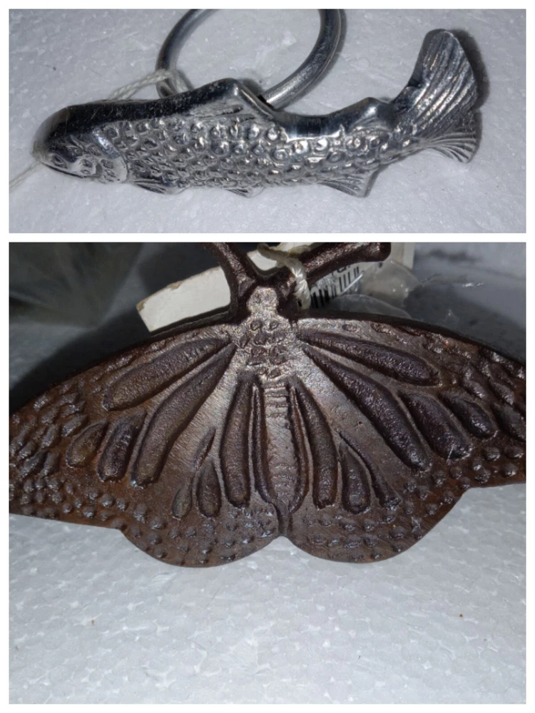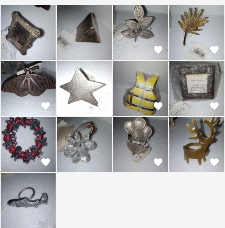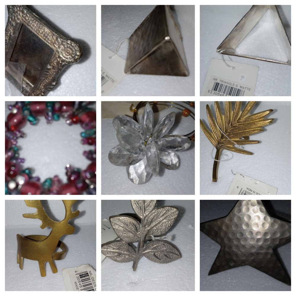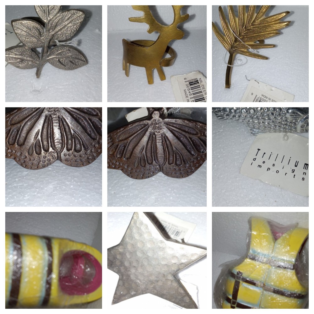 Each napkin holder is an individual design, with a variety of materials like glass and metals. nowadays no more of everyone having the same napkin holders, they are individuals just like your guest. Brand New with tags. All have an attached ring to fit your napkins. 1.picture frame 2.maple leaf 3.fish 4 beaded ring 5.cherries 6. butterfly 7.reindeer 8. flotation jacket 9. Palm leaf. 10. triangle 11.picture frame. 12. Crystal teardrop.13.star. You get all 13.