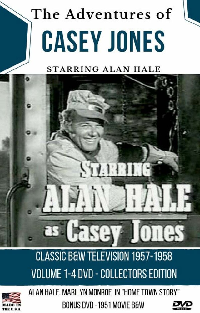Science Fiction Theater Casey Jones 1957-1958 The Complete TV series of 32 Episodes on 4 DVD's New Bonus: Alan Hale Jr & Marilyn Monroe Movie The series is set in the late 19th century, featuring the adventures of railroad engineer Casey Jones and the crew of the Cannonball Express steam locomotive, fireman Wallie Sims and conductor Redrock Smith, working for the Midwest and Central Railroad. Casey lived in Midvale, a fictional town within commuting distance of St. Louis, Missouri, with his wife, Alice, their young son, Casey, Jr., and their dog Cinders. Although there really was a famous locomotive engineer named Casey Jones of the Illinois Central, the television series is only very loosely based on him. However, it uses the real names of his train, the Cannonball Express, and his fireman, Wallie. Kenneth Gamet, the producer of Casey Jones, offers a gentler Western series against the more violent adult shows of the time. Casey Jones features the same classical types of plots as other westerns such as train robbers and vandals, but the episodes center as much on Casey's interaction with his family, particularly Casey, Jr. Cast list Alan Hale, Jr. - Casey Jones Dub Taylor - Wallie Sims (the fireman) Bobby Clark - Casey Jones, Jr. (Casey's son) Mary Lawrence - Alice Jones (Casey's wife) Eddy Waller - Red Rock Smith (the train conductor) ALL REGION DVDs Interactive Menus With Episode Titles 4 Volume DVD Set -Sealed and Shrink Wrapped Compilation & Artwork by YourRadioShows Bonus B&W Movie DVD, "Home Town Story" 1951 Alan Hale Jr. Marilyn Monroe Shows have been compiled from various sources including b roadcast to complete this Deluxe Collectors Edition. Manufactured & Made In USA
