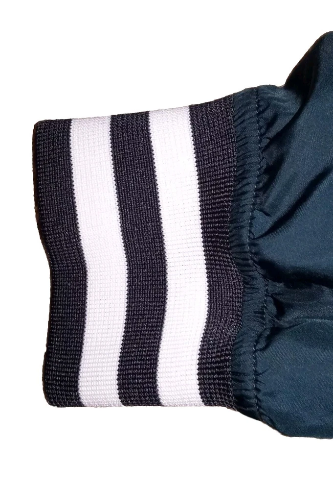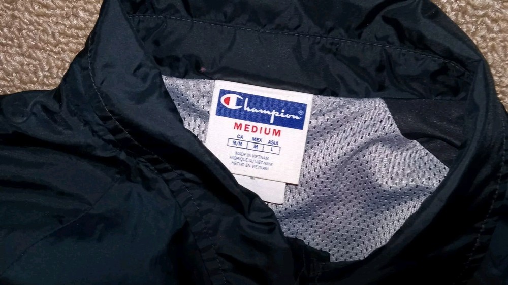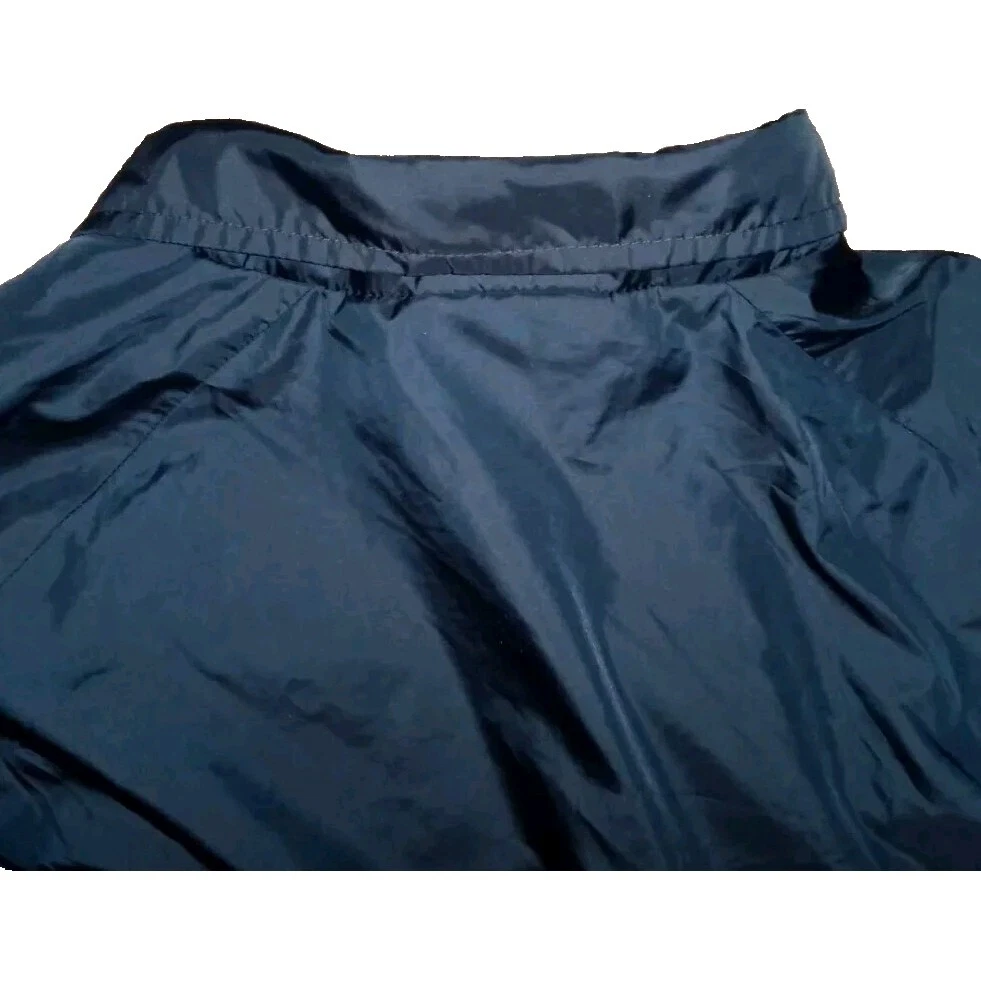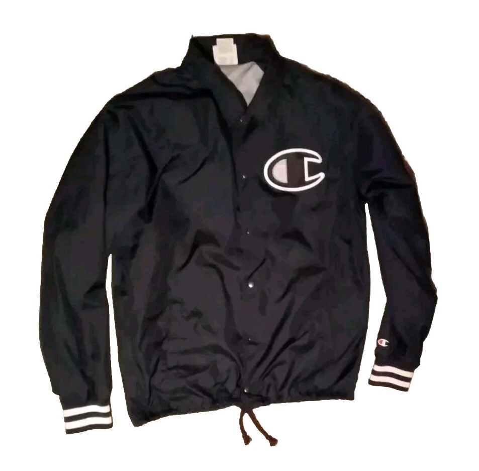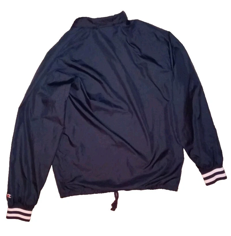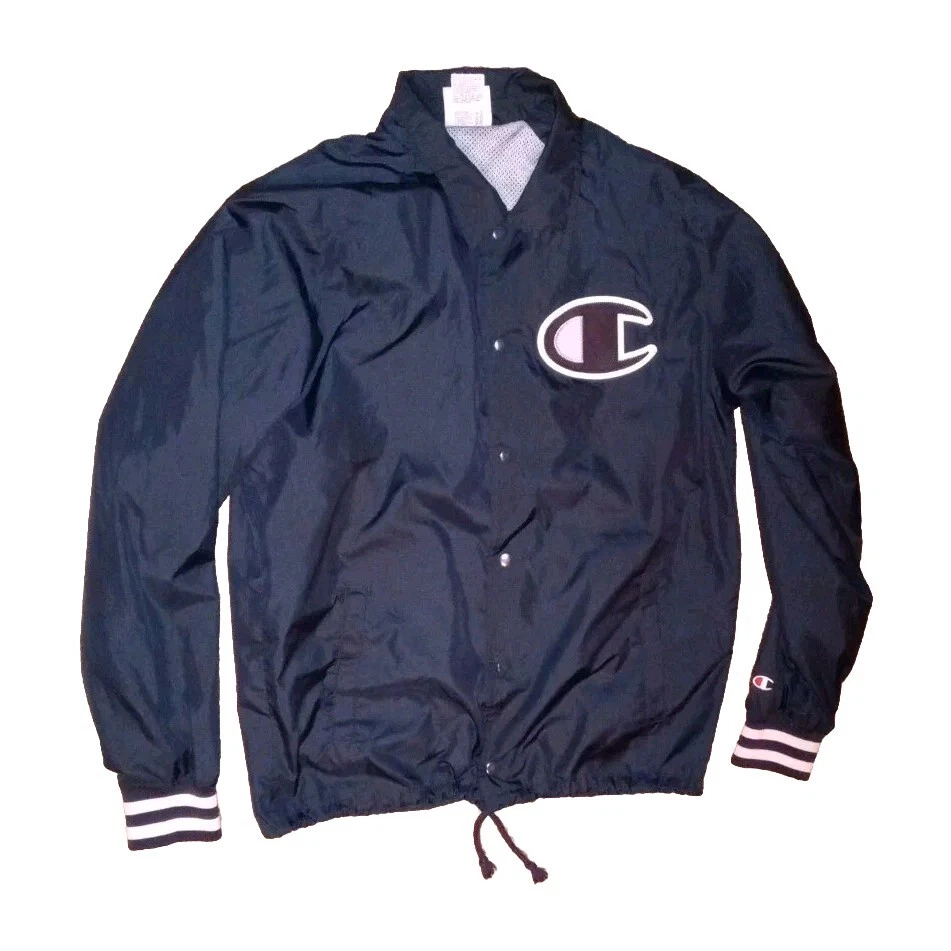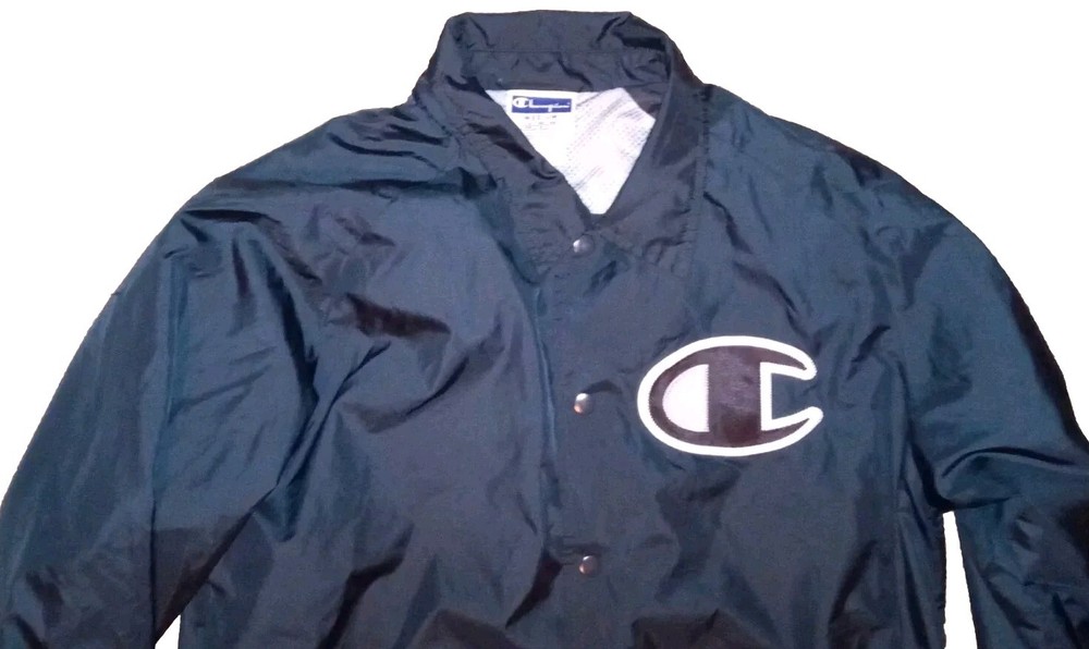 This Champion Coaches Jacket in blue features a vintage style with snap buttons and a big C logo. Made of polyester softshell fabric, it is mid-length and wind-resistant, suitable for all seasons. The jacket has a collared point style, with pockets and quick-dry properties. Ideal for travel, casual wear, or work, this retro-inspired jacket is a perfect addition to your wardrobe. II