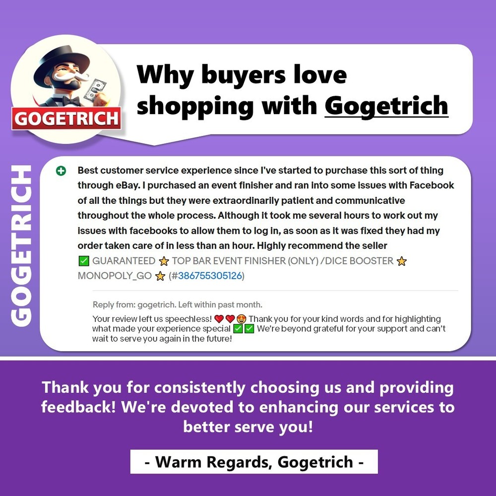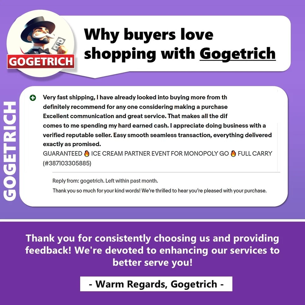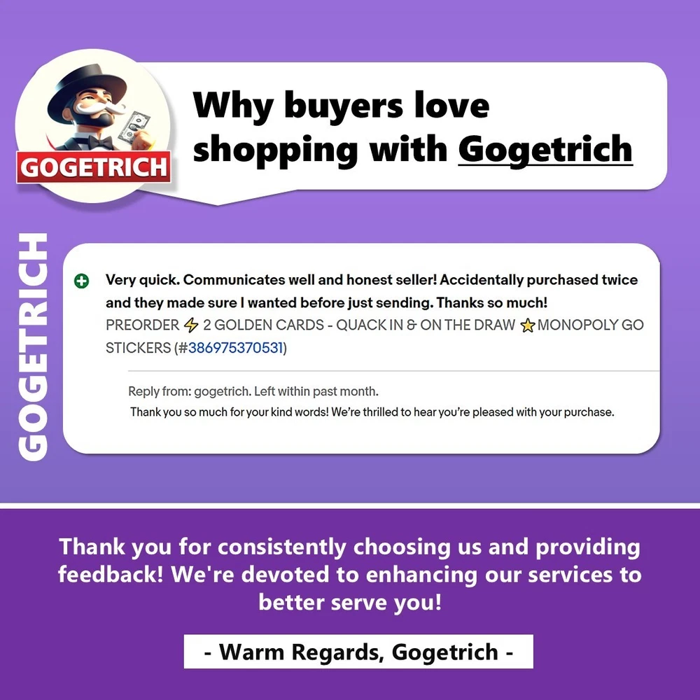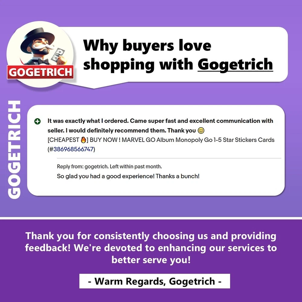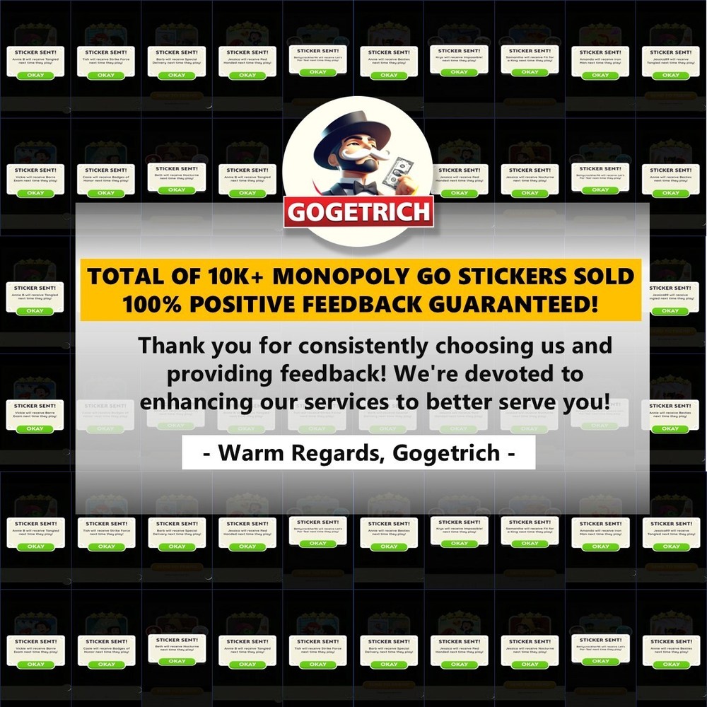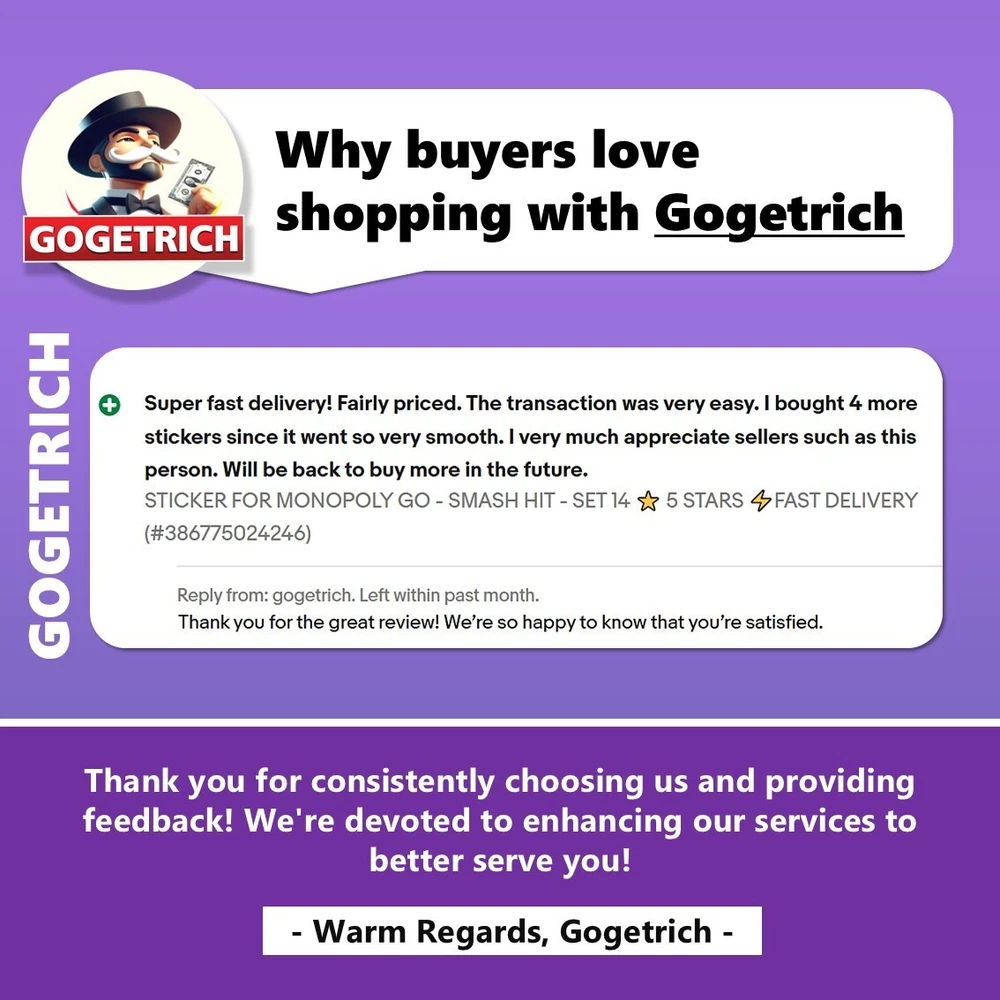 Got exactly what I needed for Monopoly Goβsuper fast delivery and great service! Seller sent stickers immediately with proof screenshots. Super affordable and hassle-free, even with the time difference. Highly recommend for quick, reliable sticker trades!