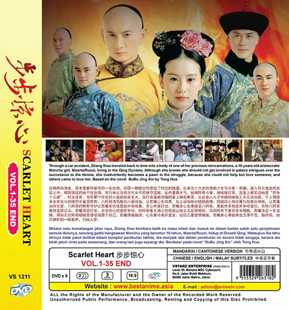 CHINESE DRAMA DVD TITLE : SCARLET HEART COMPLETE TV SERIES Number of Episode : 1 - 35 End Number of Disc : 9 Language : Mandarin / Cantonese Subtitle : English / Chinese Format : PAL, REGION ALL Condition : NEW, ORIGINAL & LICENSED ITEM Synopsis: Through a car accident, Zhang Xiao traveled back in time into a body of one of her previous reincarnations, a 16 years old aristocratic Manchu girl, MaertaiRuoxi, living in the Qing Dynasty. Although she knows she should not get involved in palace intrigues over the succession to the throne, she inadvertently becomes a pawn in the struggle, because she could not help but love someone, and others came to love her. Based on the novel BuBu Jing Xin by Tong Hua. PAYMENT We Accept PAYPAL ONLY Payment. We Are PayPal Verified Buy With Confidence. DELIVERY Free Register Track Your Shipment 10 ~ 21 Days Without Sat ~ Sun Working Days. Item Will Be Shipped ONLY After Clearing of Payment. All Order Will Process 2 ~ 3 Working Days ( NOT INCLUDED WEEKEND OR PUBLIC HOLIDAY ) After Received The Payment. WE Only Ship To Confirm Address On " EBAY INVOICE ORDER DETAIL ". RETURN Buyer Pay The Return Postage. 30 Days Returnable. Items Must Be Returned In Perfect Original Condition, Buyer Responsible For Returns Shipping Cost. Refunds Will Be Arranged Thru PAYPAL . FEEDBACK Should Any Problem Arise, Please E-MAIL Let Us Know, We Will Do Our To Correct Any Problem.