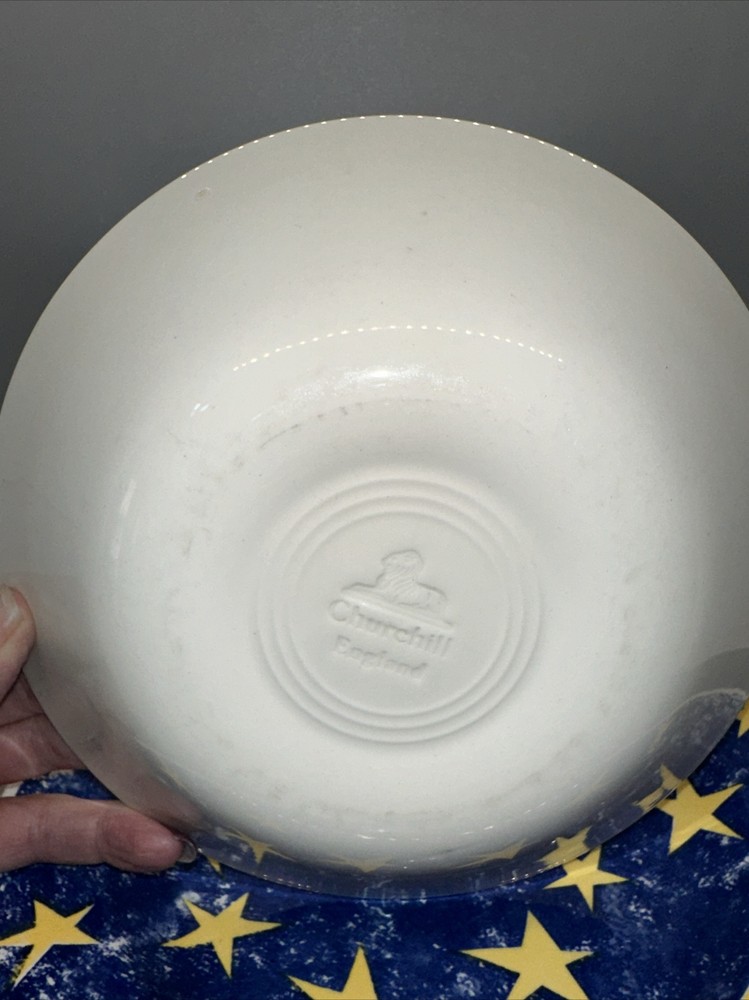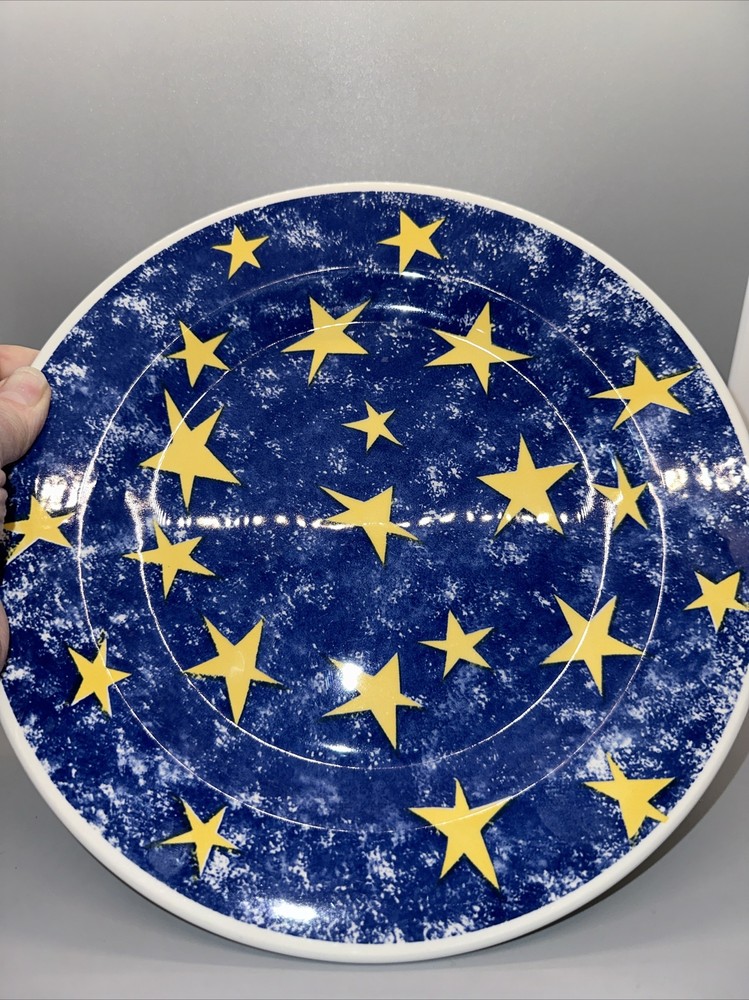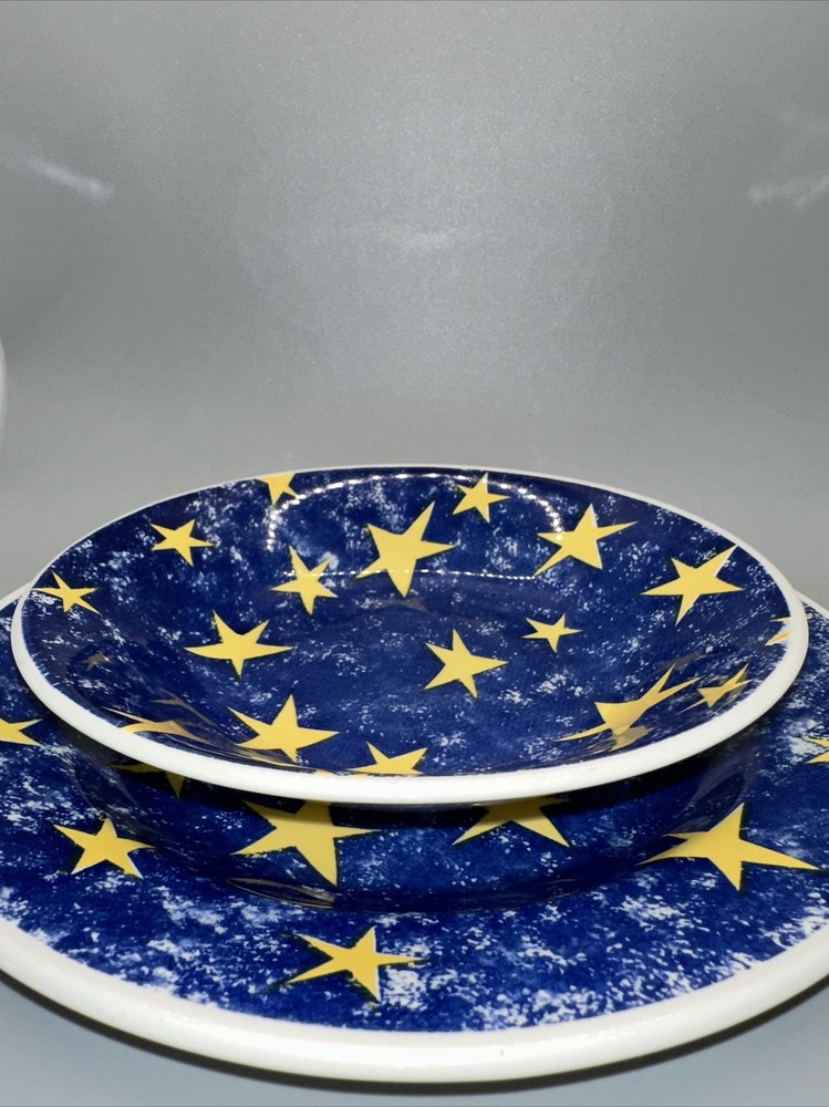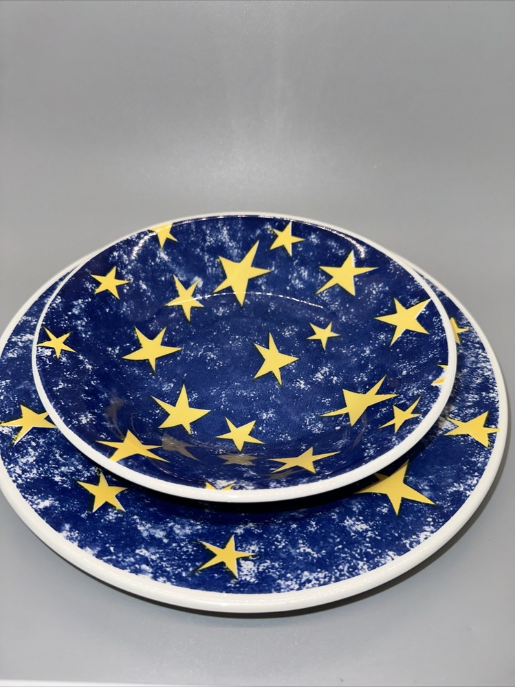 This is a set of two dishes from Churchill England for Pier 1 Imports. There is the 10.25" dinner plate and the 8" cereal bowl. Both are blue with gold stars. Great pre-owned condition with no chips or cracks. See pix for details. Shipping $12.95 I strive for happy customers so please email me any questions prior to leaving neutral or negative feedback; I always work with my customers for their satisfaction. See my eBay store 'SweetJerez Sells Stuff' for more unique items as I combine shipping when possible. My pre-owned items have been cleaned and wiped with antibacterial wipes as appropriate. BID WITH CONFIDENCE! I entertain all fair offers. Thank you for looking.