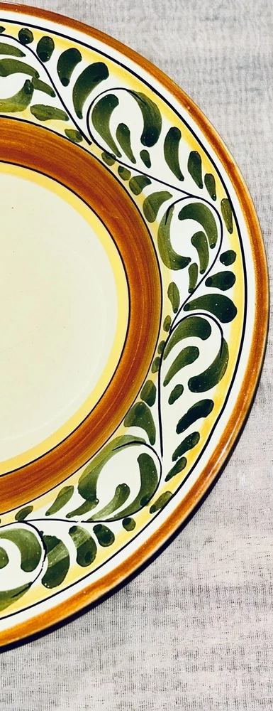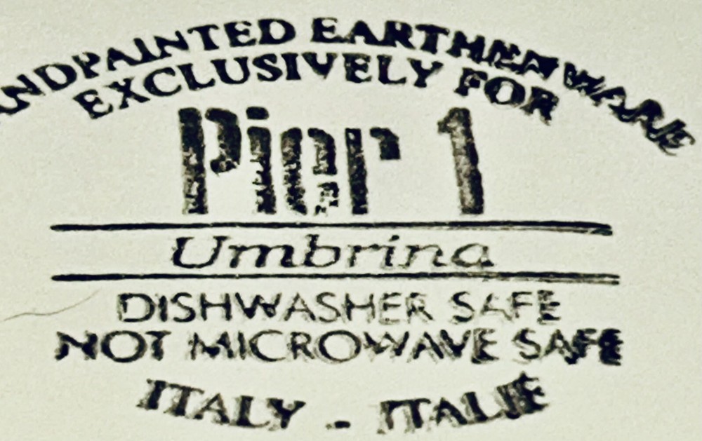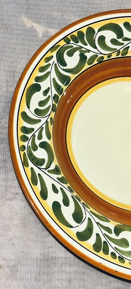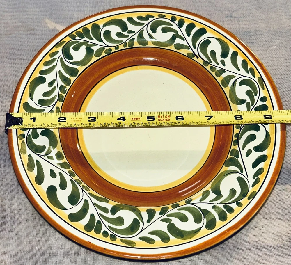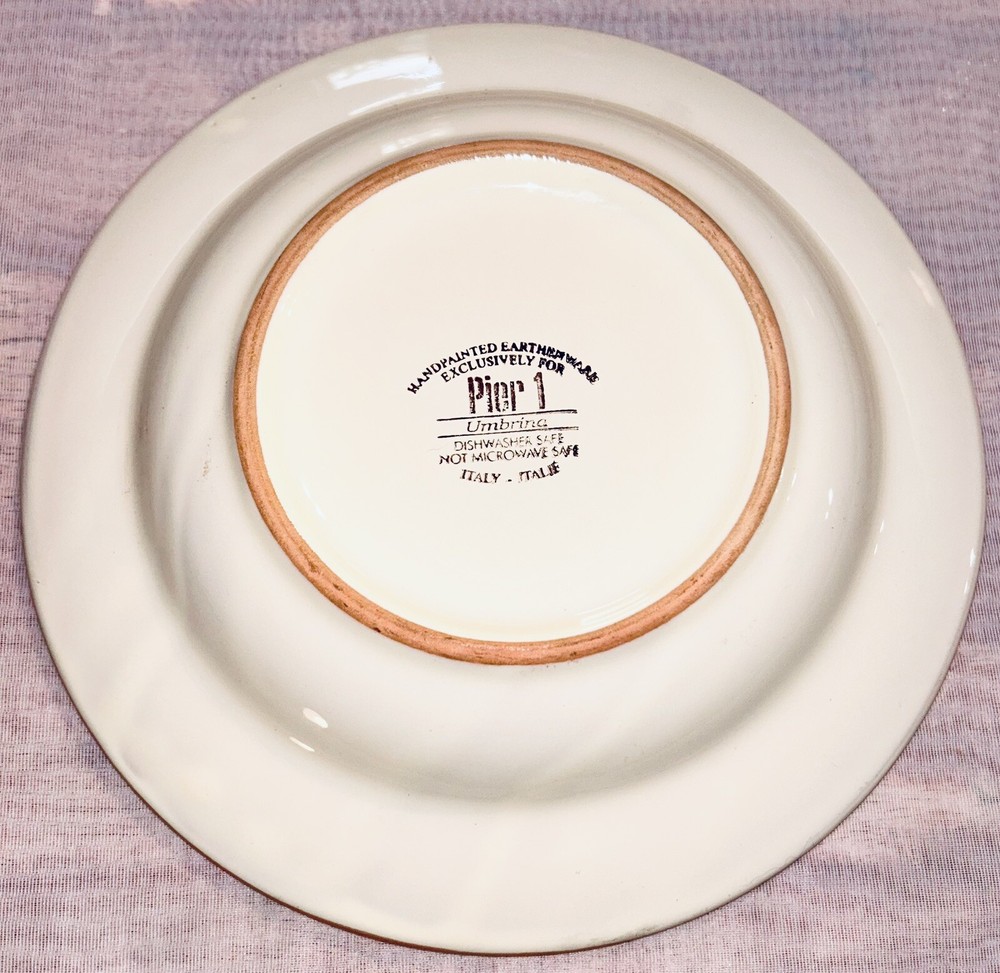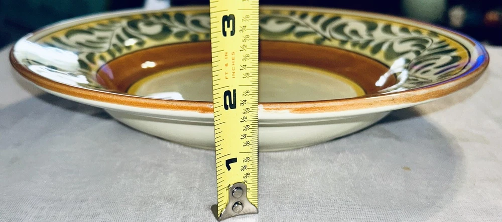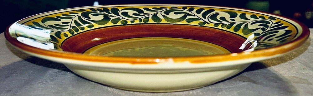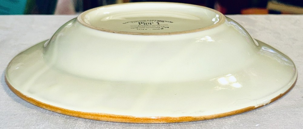 This beautiful bowl from Pier 1 is a must-have for any lover of Italian rustic style. Made of earthenware and hand-painted with a glossy finish, it features a round shape with a green vine pattern and falls into the category of decorative cookware, dinnerware, and serveware. The heavy bowl is stackable and can hold soup, pasta, or cereal, making it perfect for all occasions. Italy is the origin of this vintage piece, and it has a printed backstamp with the brand name Pier 1. The bowl is dishwasher safe and comes with a set of instructions for use. The umbrina pattern adds a touch of elegance to any table setting, and the country style and Italian theme make it a great addition to any home decor. No chips no cracks, Good vintage - condition. The bowl is in very good used condition with wear appropriate to age and use/check photos), Measurements listed on above photos Ships with tender loving care Thank you for stopping by, stay safe Box 94x2 meri