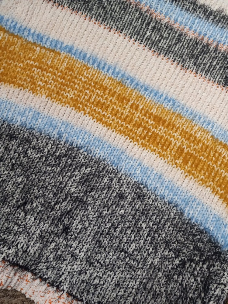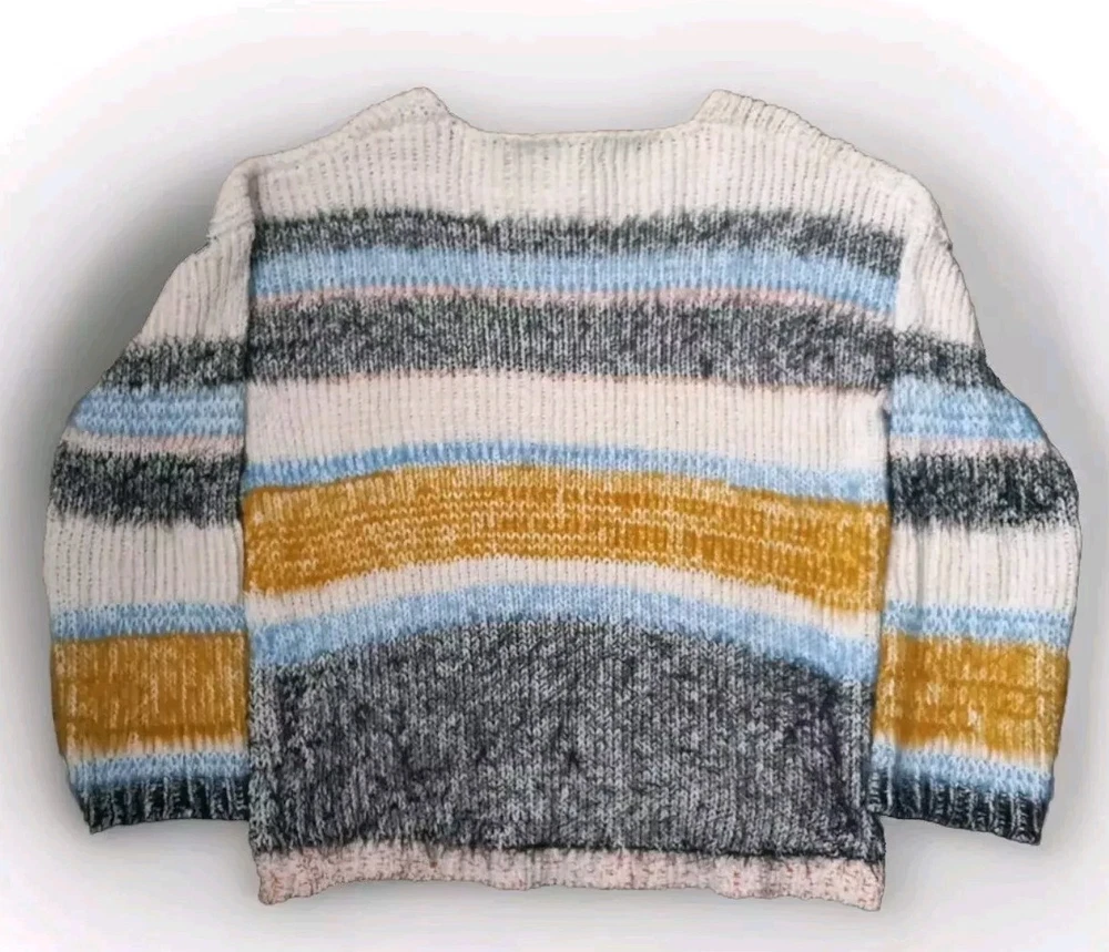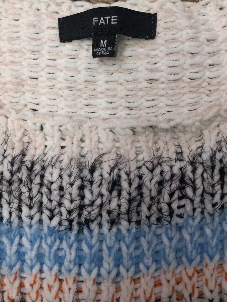 Elevate your wardrobe with this stylish and cozy Fate cable-knit sweater. The multicolor striped pattern and relaxed fit make it perfect for any occasion, whether it's a casual day out or a business meeting. The sweater features a collarless design and is made of a breathable polyester-nylon blend, ensuring that you stay comfortable all day long. With its fuzzy and preppy theme, this sweater is ideal for the winter, fall, and spring seasons. The long sleeves and cable-knit fabric type provide extra warmth and comfort. Hand wash only to maintain the quality of the material. Available in size M, this pullover is a must-have for any fashion-forward woman. Measurements Pit to pit 24" Pit to Cuff 19" Shoulder to hem 25"
