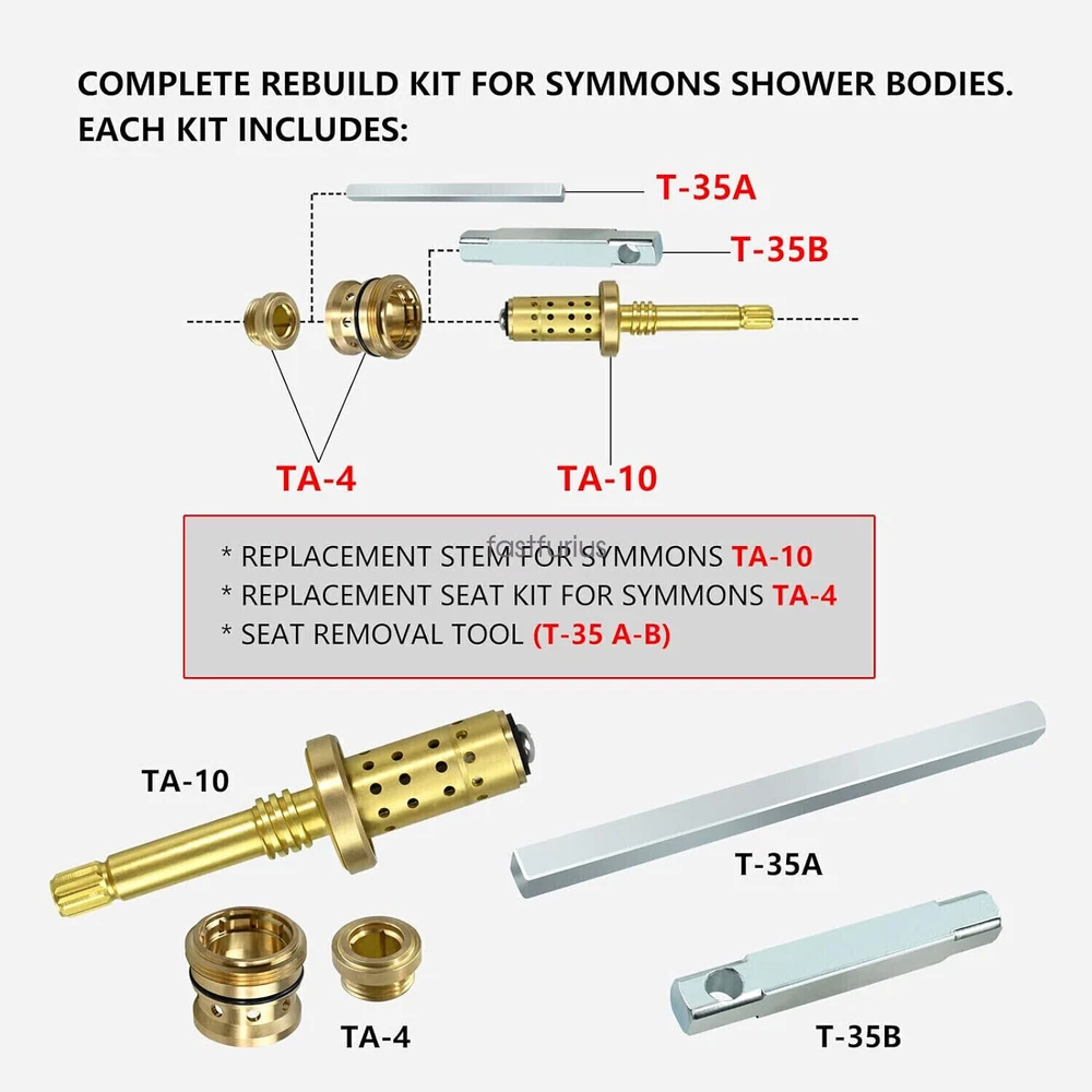 Store Home | New Arrival | Ending Soon | Add to Favourites | View Feedback | Contact us Store Categories Suspension & Steering Lighting & Lamps Boat parts Module Home & Garden Business & Industrial Brakes & Brake Parts Car Repair Kit Auto Engine System Auto Ignition System Motorcycle Ignition System Motorcycle engine system Auto Actuator Auto Motor Auto Circuit Wiring Harness Transmission System Motorcycle Control System Exterior Trimming Parts Why Buy From Us Fit for Symmons Temptrol Valve TA-10,TA-4,T-35 A/B,Complete Valve Rebuild kit ITEMS DESCRIPTION Fit for Symmons Temptrol Valve TA-10,TA-4,T-35 A/B,Complete Valve Rebuild kit Please confirm the model, size, and delivery address before placing an order. Function: The TA-10 spindle adjusts the balance of hot and cold water pressure。 The TA-4 hot and cold valve seat prevents shower valve leakage. Ensure the normal operation of the valve and the normal flow of hot and cold water. Excellent Materials: Made of high-quality metal materials, brass and stainless steel, with strong corrosion resistance, long service life, and durability. Compatibility: Compatible with any Temptrol valve produced after 1965. Package includes: 1 Seat Symmons REB Complete Valve Rebuild Kit---valve core (TA-10), valve seat (TA- 4), and valve seat disassembly tool (T-35A/B). Service: [1] You can contact us if you have any questions, and we usually reply within 12 hours (there may be some delays during holidays, please understand) [2] All products in our store come with a one-year warranty period, and you can choose a solution such as refund or exchange. Shipping: [1] We usually ship through USPS within 10 hours of your purchase. [2] Our warehouses are located in New Jersey and California, and we adhere to the principle of shipping nearby as long as we have inventory. [3] If you urgently need this product, please be sure to contact us for further communication, which will help things proceed smoothly. [4] If the logistics information of the goods has not been updated for several days after delivery, please contact us in time Shipping Payment Return Policy About us Contact us Product will be shipped within 3 business days after full payment is received and verified. Delivery Time is about 3-7 business days to most of countries. All domestic orders will be shipped via USPS or FedEx from our US warehouse and usually arrives to your door in about 3-5 business days. We ship the package to your shipping address in eBay instead of the one in PayPal. Please tell us your shipping address if it is different from the one in eBay. The tracking number will be given for the customer to check the shipping status online (registered or faster service only). We are not responsible for any wrong or undeliverable addresses. Please verify and update your shipping address on eBay during checkout. We accept payment via Paypal only. Thanks. Your order will be usually shipped out on the same day or the next day when you paid for it. Shipping from the USA, we offer Free USPS Frist Class as default. Handling time: 2 business day and 3 business day on weekend (Orders are not processed on holidays).Item is shipped to ebay address. Please leaving correct address can minimize delay. Return is accepted within 30 days after the buyer's receiving the item. If you need return, let us know the detailed problem and send us some pictures for confirmation. Then get an address for return or refund. We value our customers tremendously. We are learning and improving our service better and better, and your satisfaction is the first thing that we pursue. If any problem occurs, please contact with us at the first time. Then we will try our best to solve the problem and make you pleased. And if you are pleased with this transaction, please don’t hesitate to leave a POSITIVE FEEDBACK and FIVE STARS on all of the Detail Seller Ratings. We will do the same for you. If have any problem, Please don't give negative feedback, Please contact us by message, we will do our best to service you .Thanks very much and have a good day! Copyright All Rights Reserved. On Nov 29, 2023 at 00:02:18 PST, seller added the following information: On Oct 16, 2024 at 00:21:46 PDT, seller added the following information: