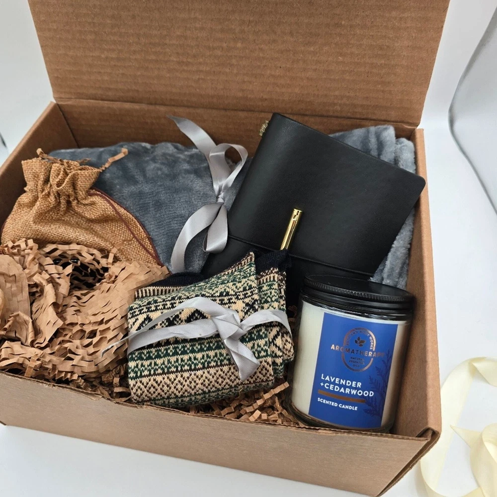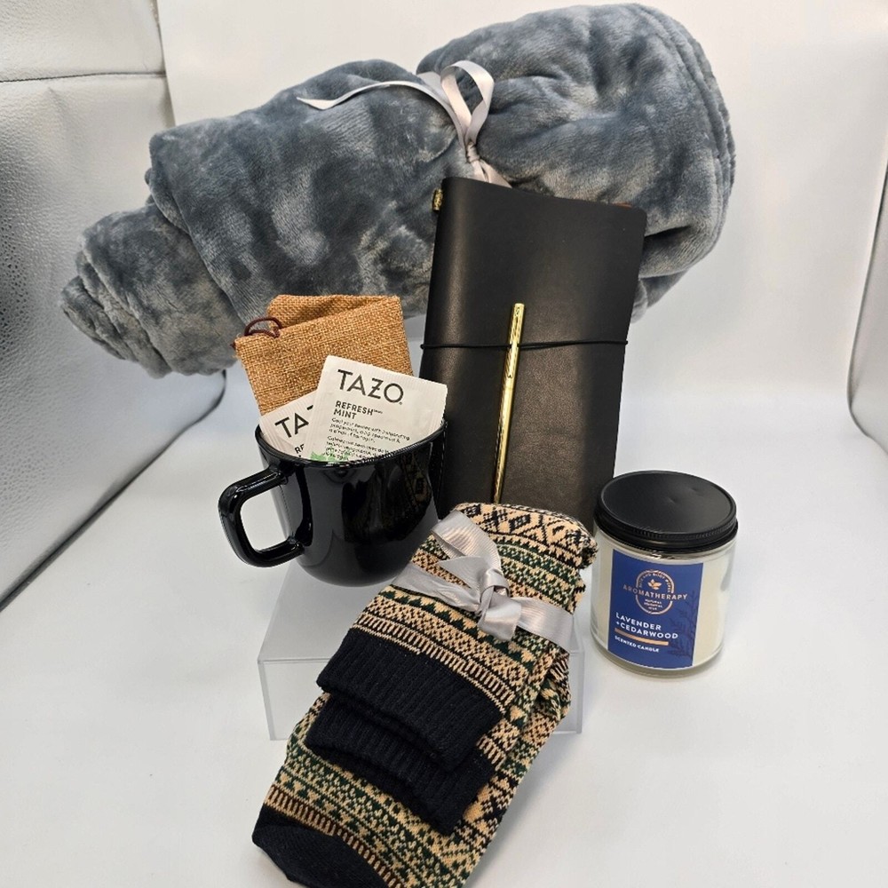 The perfect gift for any occasion, this unisex cozy set includes an aromatic calming candle, a soft fleece blanket, ceramic mug with tea, a pair of cozy cotton socks, and a gorgeous leather bound journal with metal pen to jot down your thoughts. The set is beautifully packaged and ready to be gifted to a loved one, a friend or a treat for yourself! Whether you're looking for a relaxation gift or a way to show someone you care, this set is sure to bring comfort and a smile to their face.