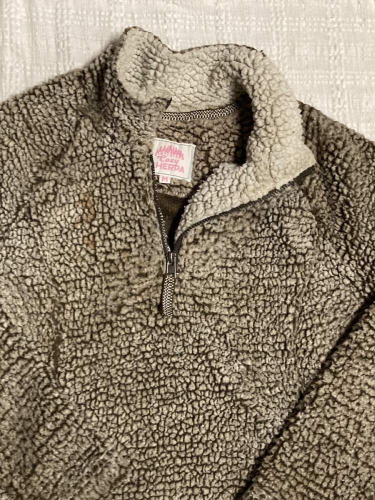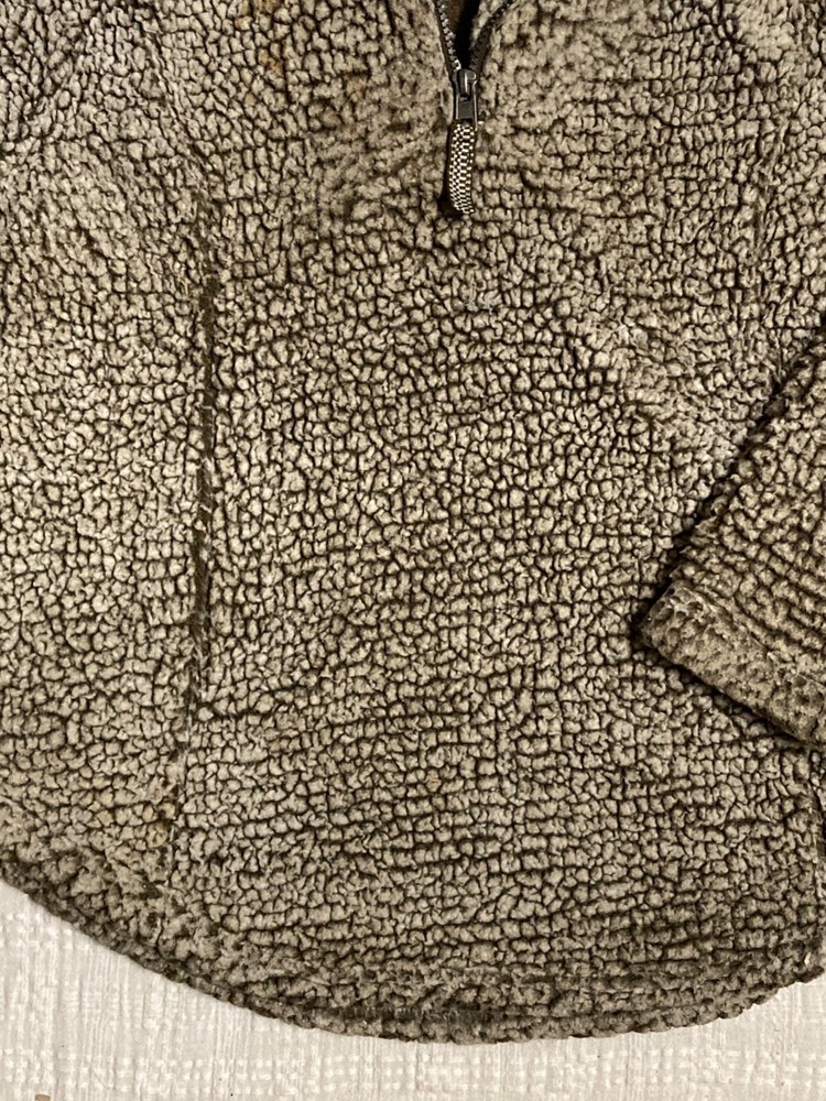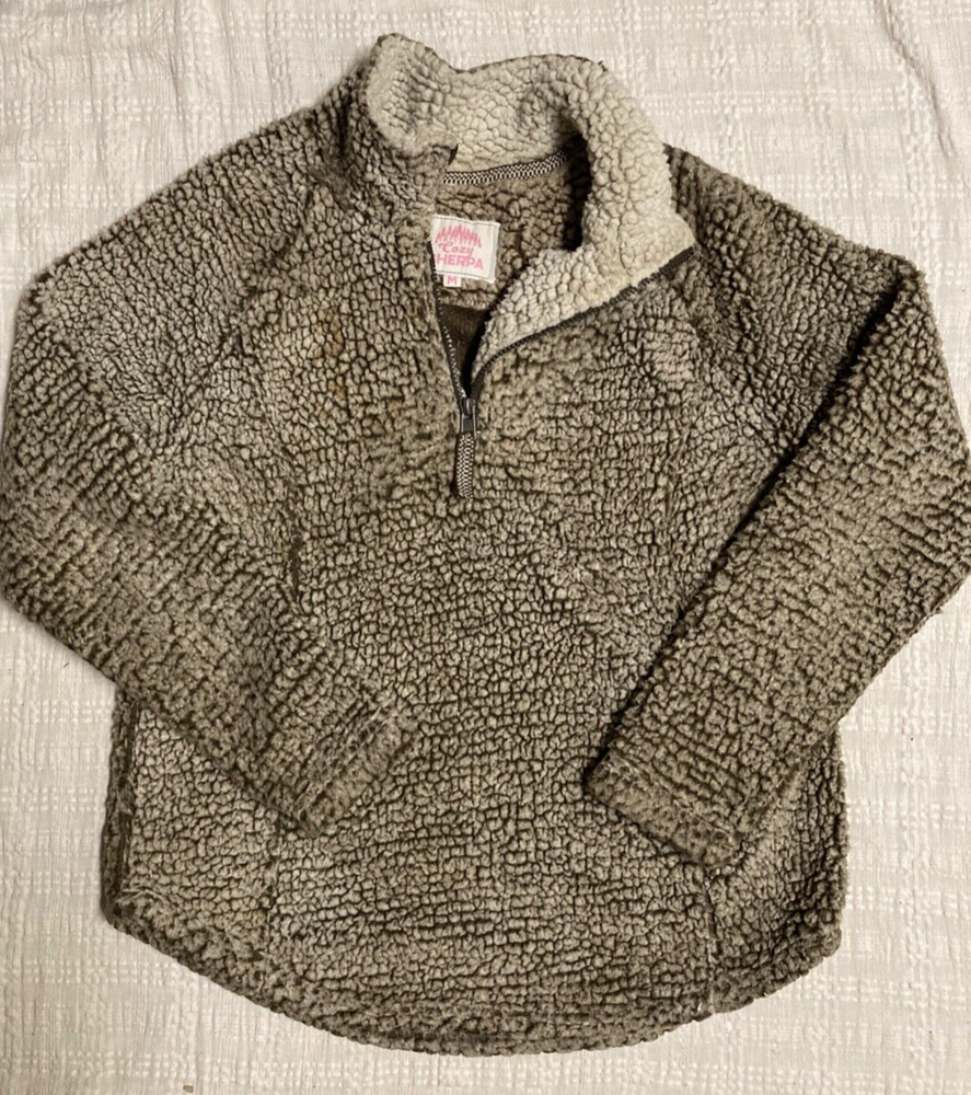 COZY SHERPA Size Medium Soft warm and comfortable long sleeve top and 1/4 zip closure 22 inches pit to pit x2 Great pre-worn condition brown sherpa fabric and raglan sleeves PULLOVER WITH 1/4 zipper 100% Polyester machine wash cold - hang to dry