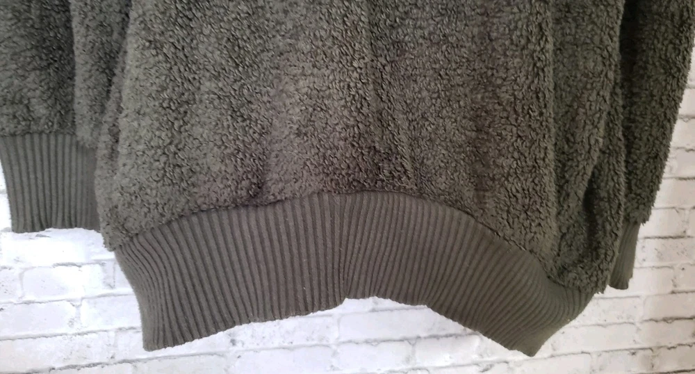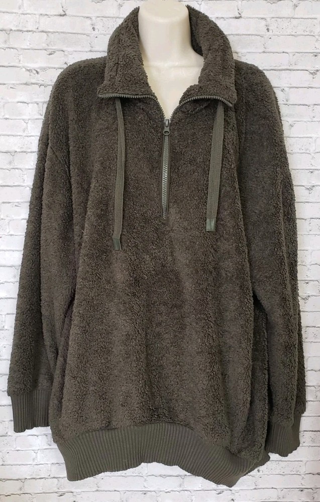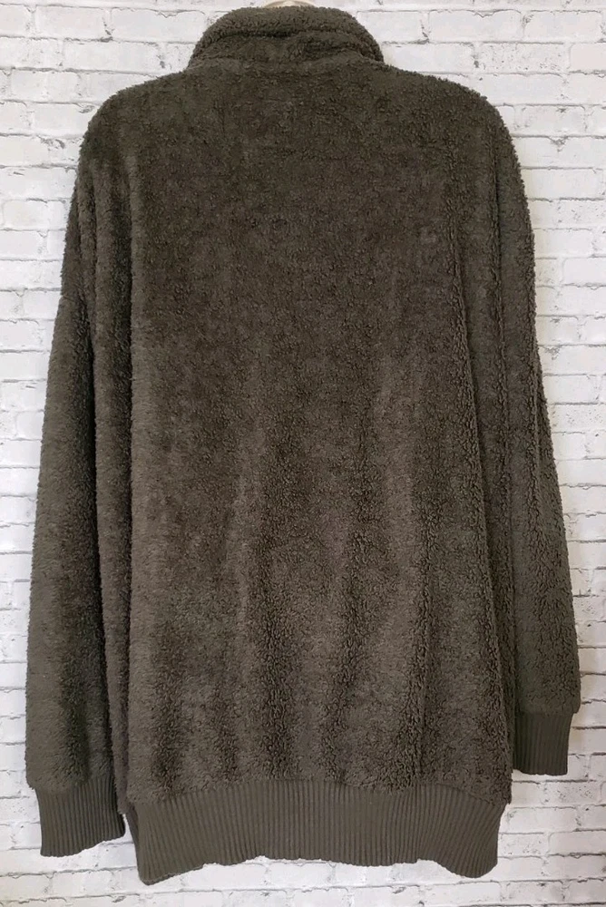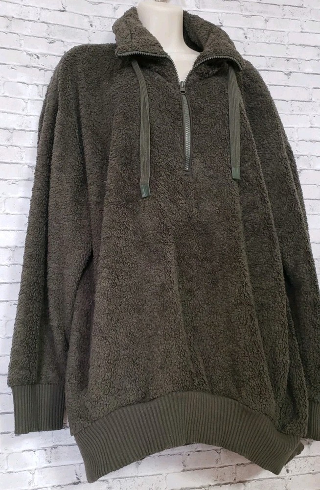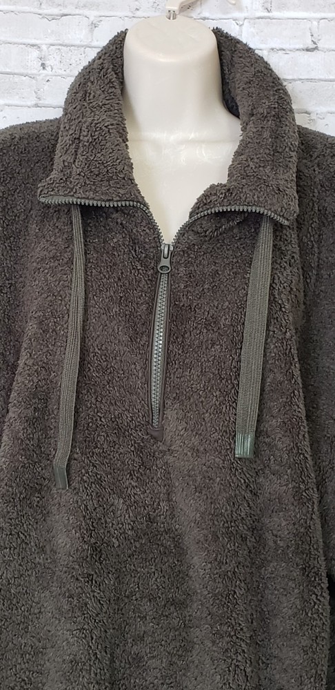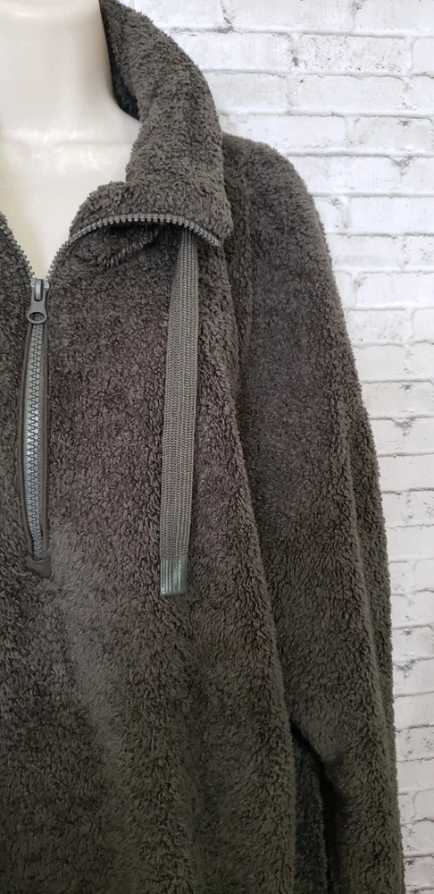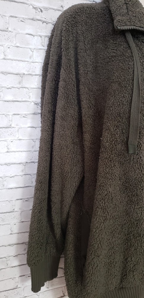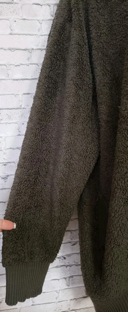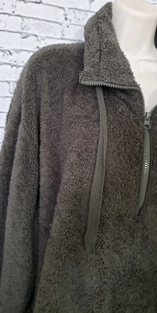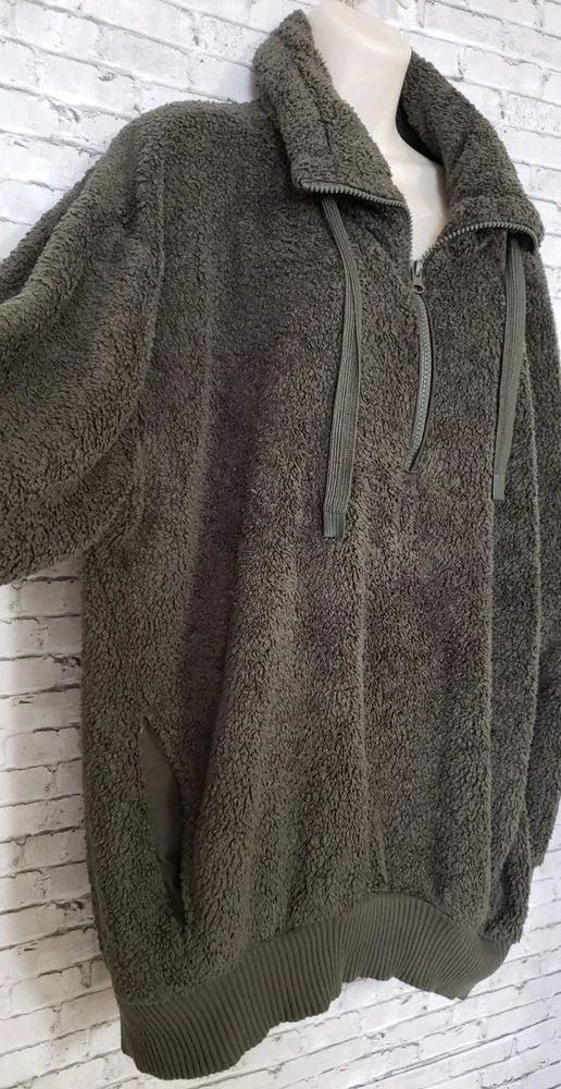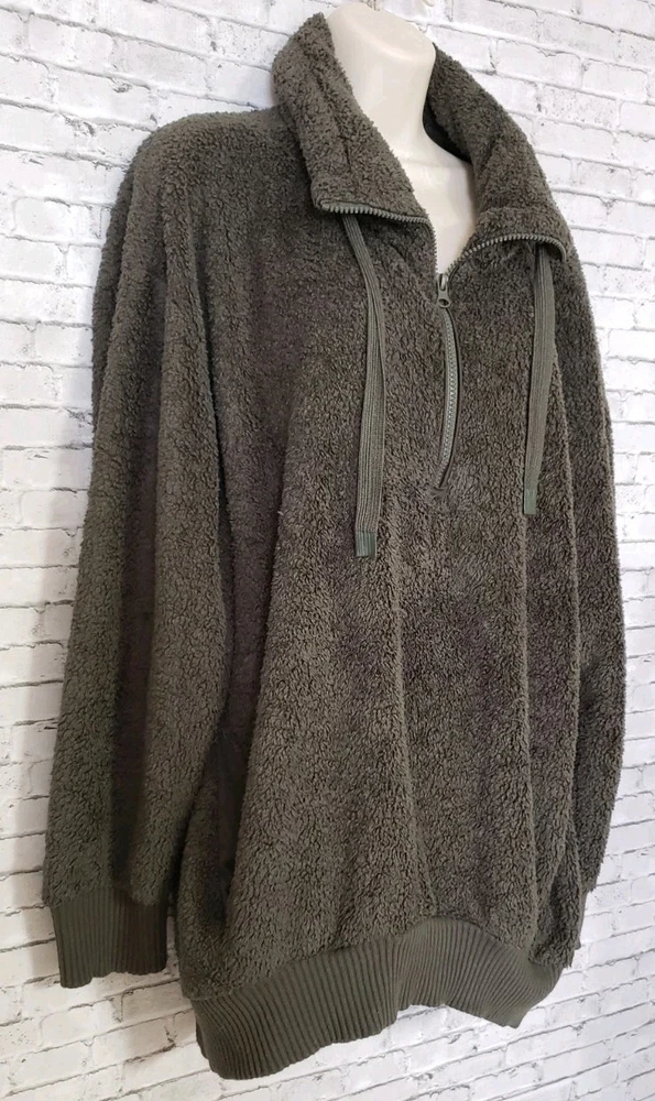 The COZY SHERPA Women's Size XXL Olive Green Sweater is a fleece-lined pullover designed for warmth and comfort. The sweater features a 1/4 zip closure, making it easy to layer over other clothing. Made from a blend of polyester and rayon, this sweater is perfect for casual or travel occasions in the winter and fall seasons. The solid green color and casual sleeve design add a touch of outdoor and sports-inspired style, while the mock neck neckline provides added coziness. Ideal for staying comfortable and stylish in chilly weather, this sweater is a versatile and cozy addition to any wardrobe. Size XXL Measurements laying flat Armpit-to-armpit 27" Length 31" Gorgeous pre-loved condition No flaws or odors noted Smoke and pet free home