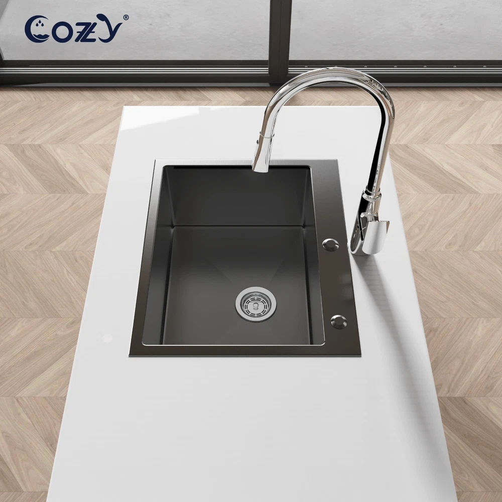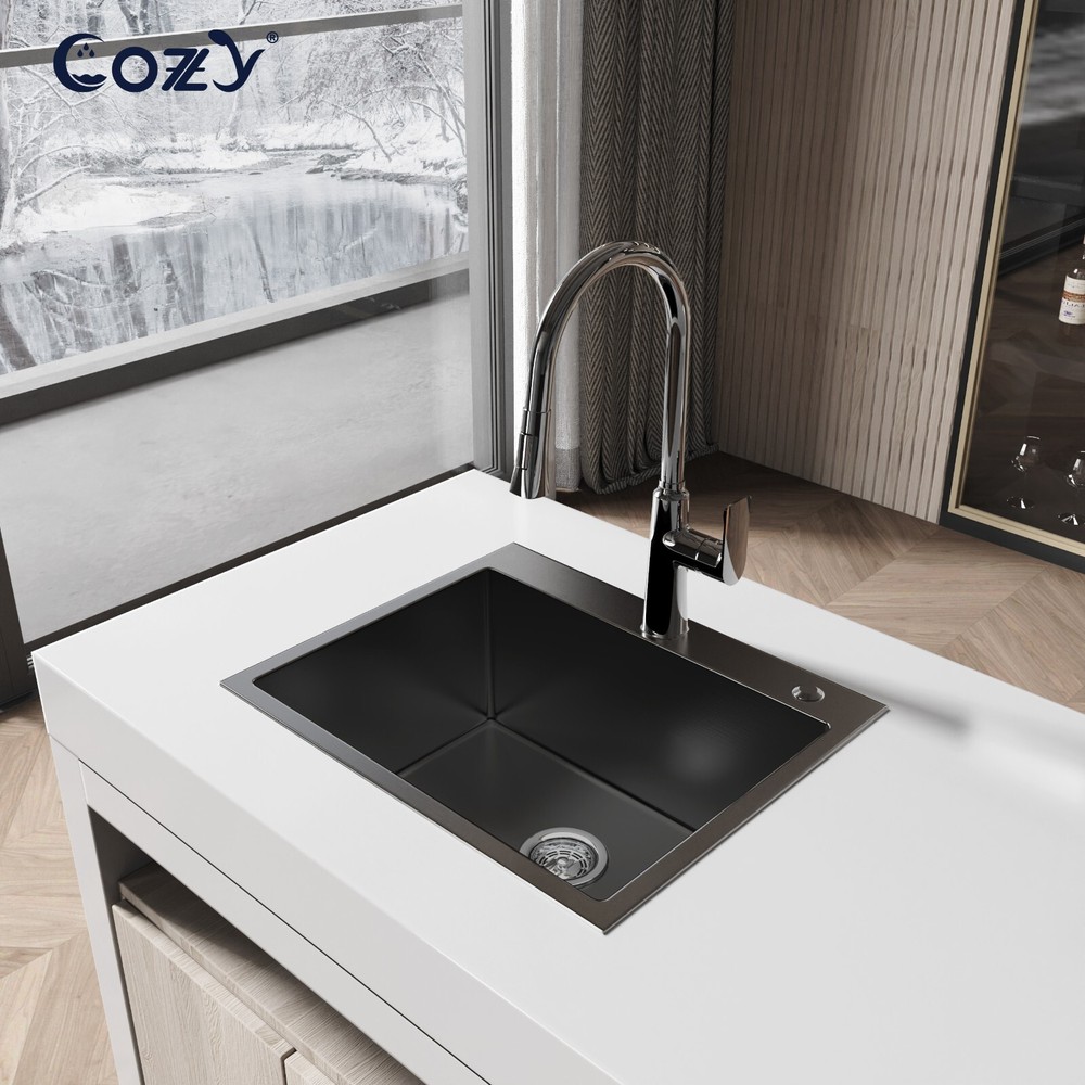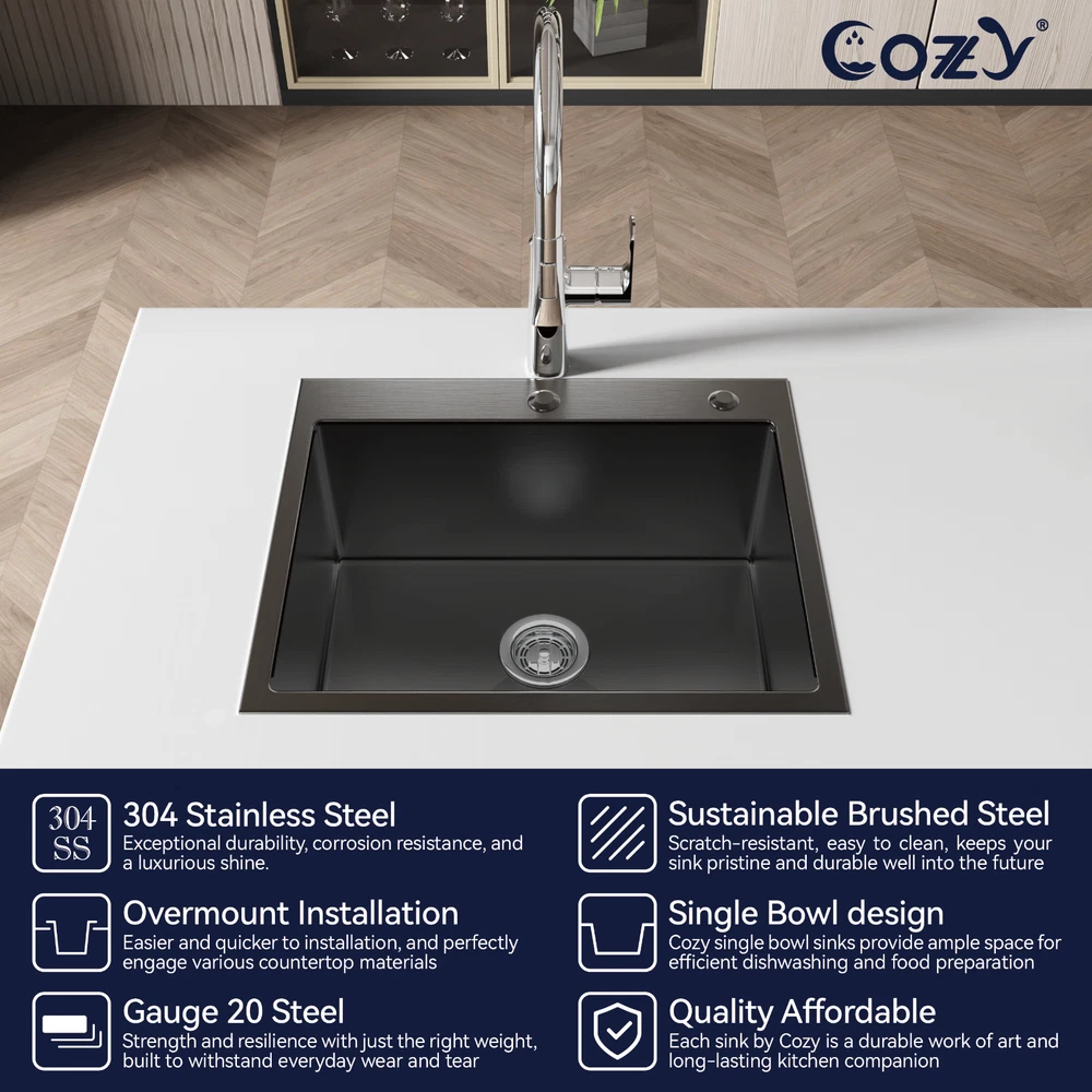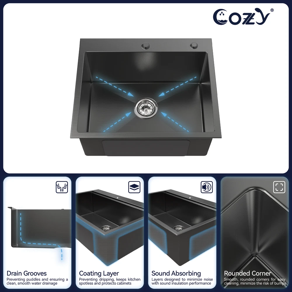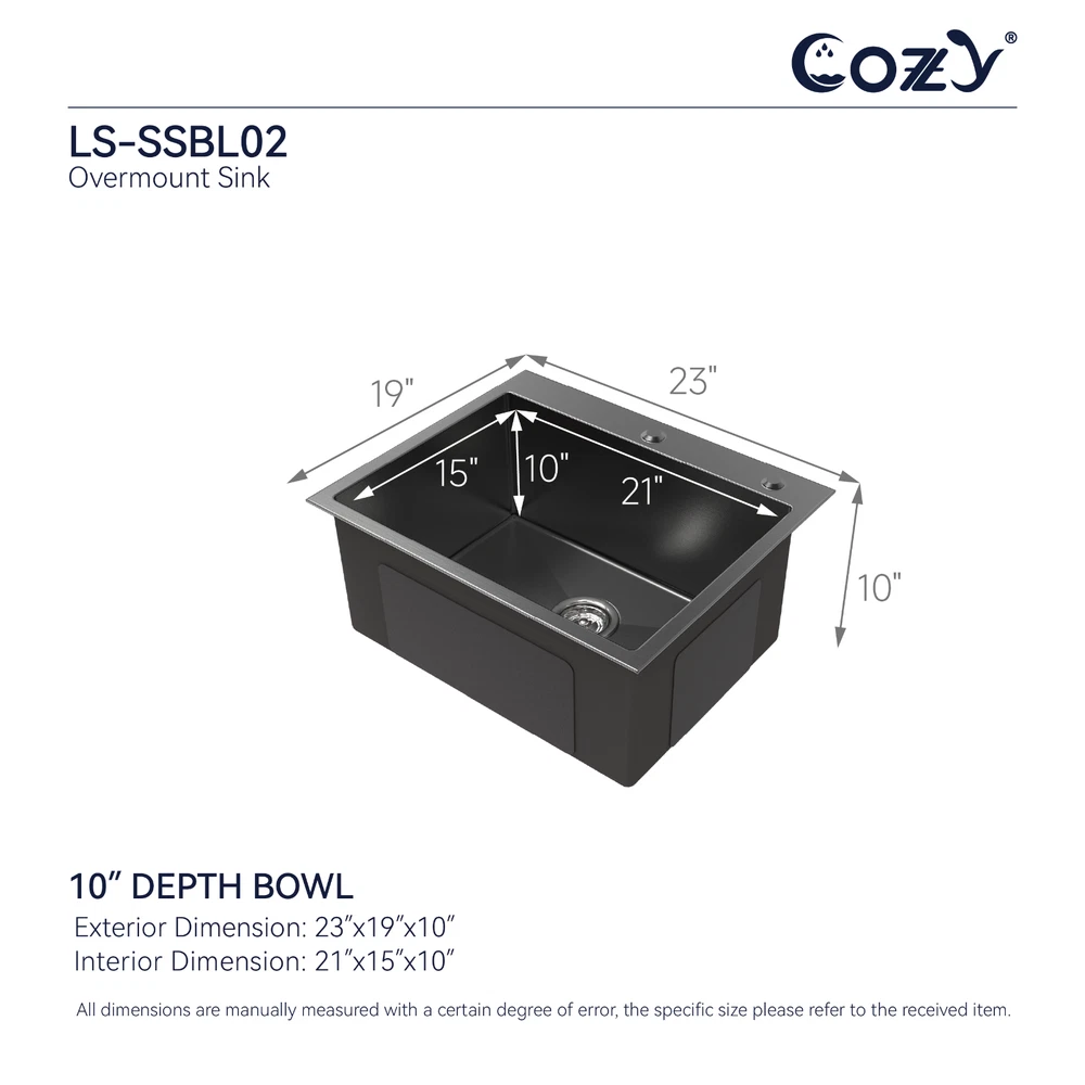 COZY Stainless Steel Kitchen Sink, 23" Single Bowl in Matte Black, with US Standard Drain and Hook, LS-SSBL02 Meet the Lens Handcrafted Sink, where artistry meets everyday utility. Crafted from premium SUS304 stainless steel, each sink is a durable work of art, sound-absorbing and impact-resistant for a quiet, long-lasting kitchen companion. With versatile single and double bowl designs, our sinks are tailored to fit your kitchen's heart and streamline your culinary tasks. Complete with included accessories, embrace the artisanal quality and timeless elegance that only Lens can offer. Designed for functionality, our single bowl sinks provide ample space for efficient dishwashing and food preparation.Black stainless steel can easily match with a variety of kitchen appliances and fixtures. Crafted from durable 304 stainless steel, this sink features a sleek black exterior. It's scratch-resistant with an anti-splash coating, perfect for efficient dishwashing and food prep. Includes a US-standard drain and hooks for easy installation and convenience. Compact size to maximize efficiency without compromising functionality. 3 years warranty for exchanging components.
