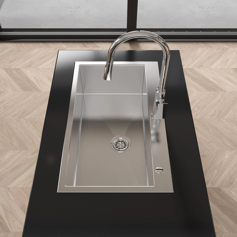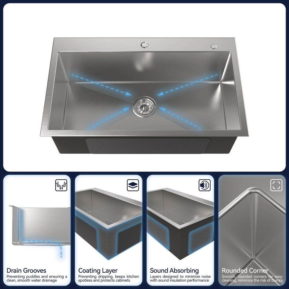 COZY Stainless Steel Kitchen Sink, 32" Single Bowl in Brushed Nickel, with US Standard Drain and Hook, LS-SSBR02 Meet the Lens Handcrafted Sink, where artistry meets everyday utility. Crafted from premium SUS304 stainless steel, each sink is a durable work of art, sound-absorbing and impact-resistant for a quiet, long-lasting kitchen companion. With versatile single and double bowl designs, our sinks are tailored to fit your kitchen's heart and streamline your culinary tasks. Complete with included accessories, embrace the artisanal quality and timeless elegance that only Lens can offer. Designed for functionality, our single bowl sinks provide ample space for efficient dishwashing and food preparation. The robust nature of brushed stainless steel ensures long-lasting performance, scratch-resistant and timeless aesthetic. Made from high-quality 304 stainless steel, this sink offers a large capacity for efficient dishwashing and food prep. It's durable, scratch-resistant, and features an anti-splash coating. It includes a US-standard drain and hooks for added convenience. 3 years warranty for exchanging components.